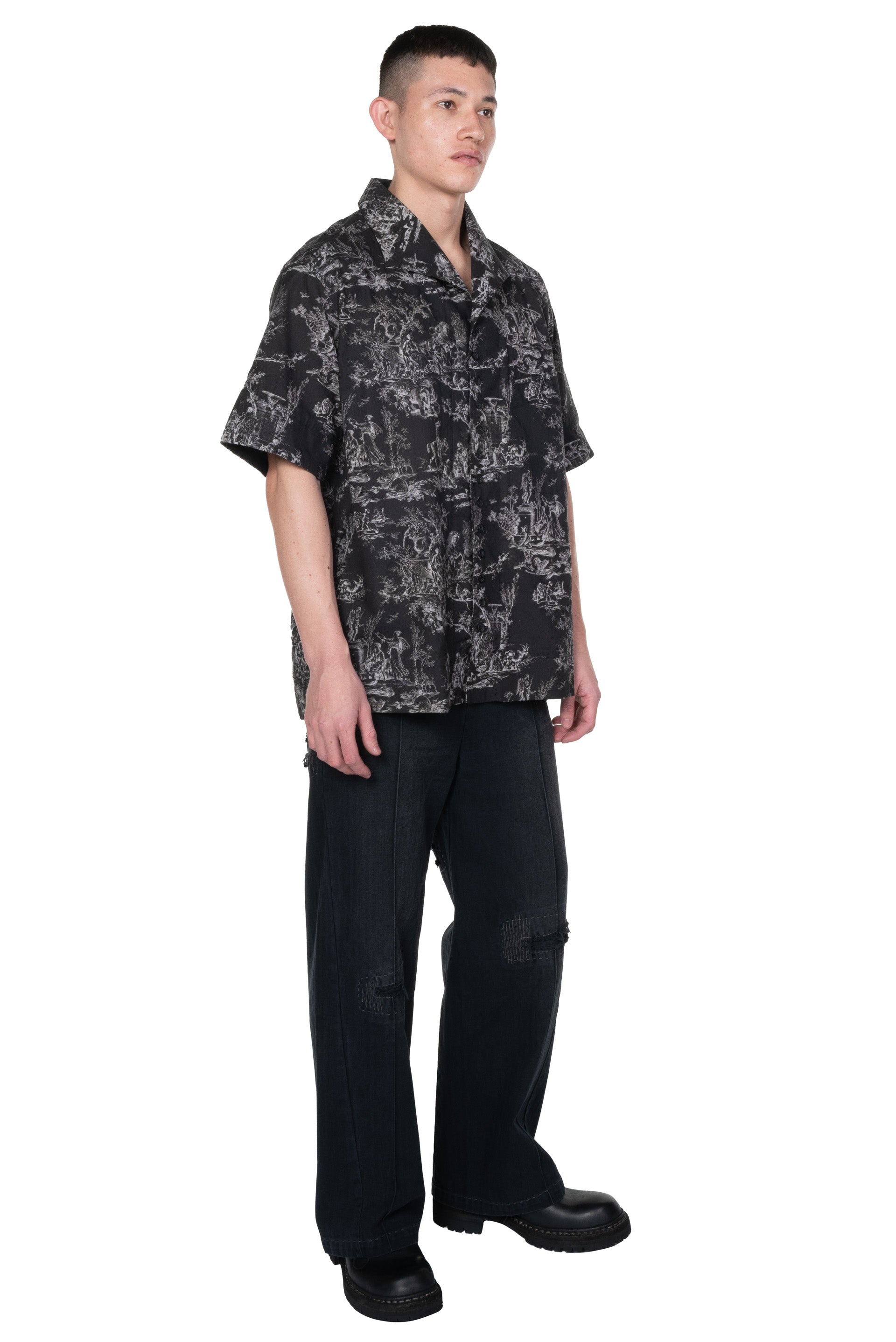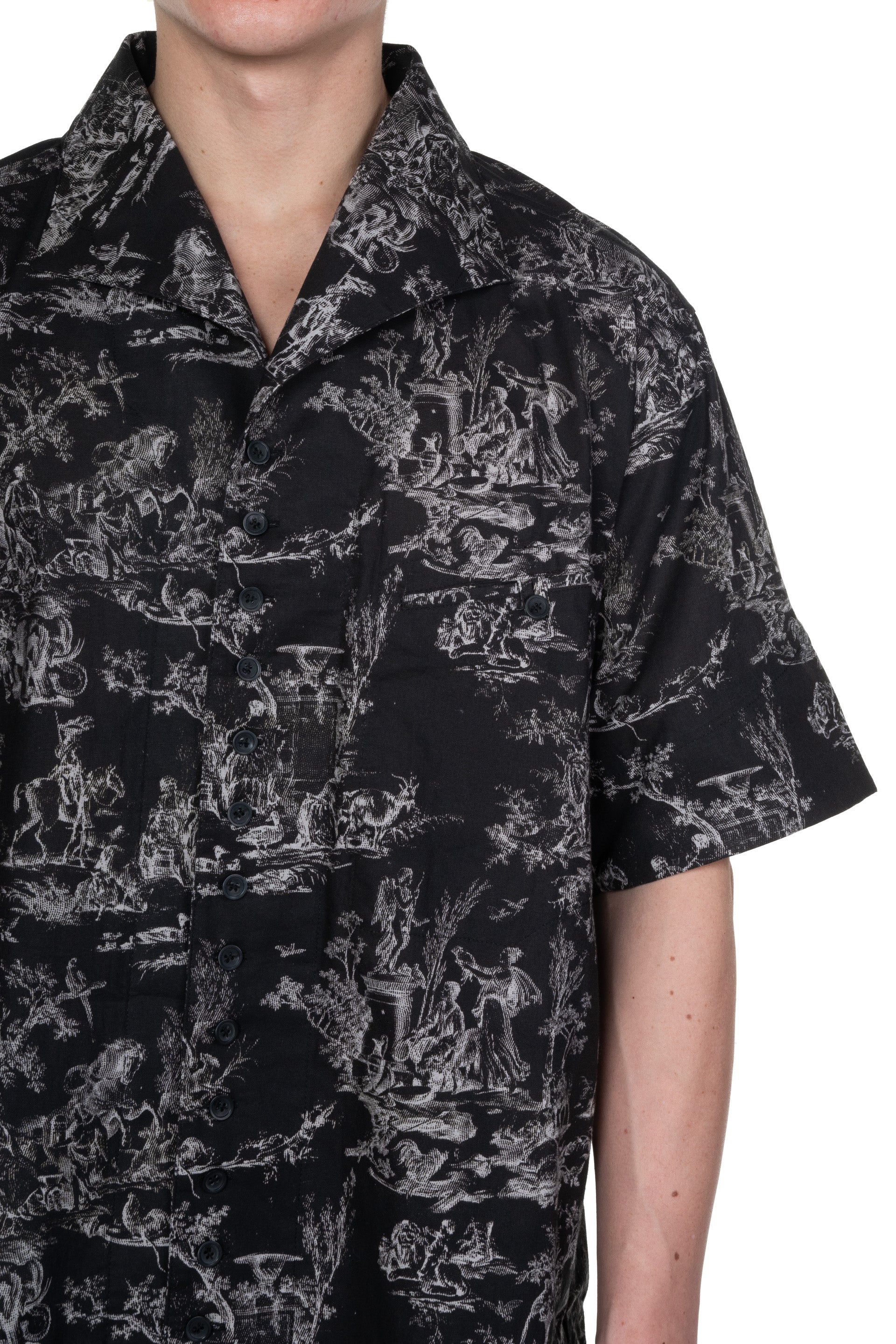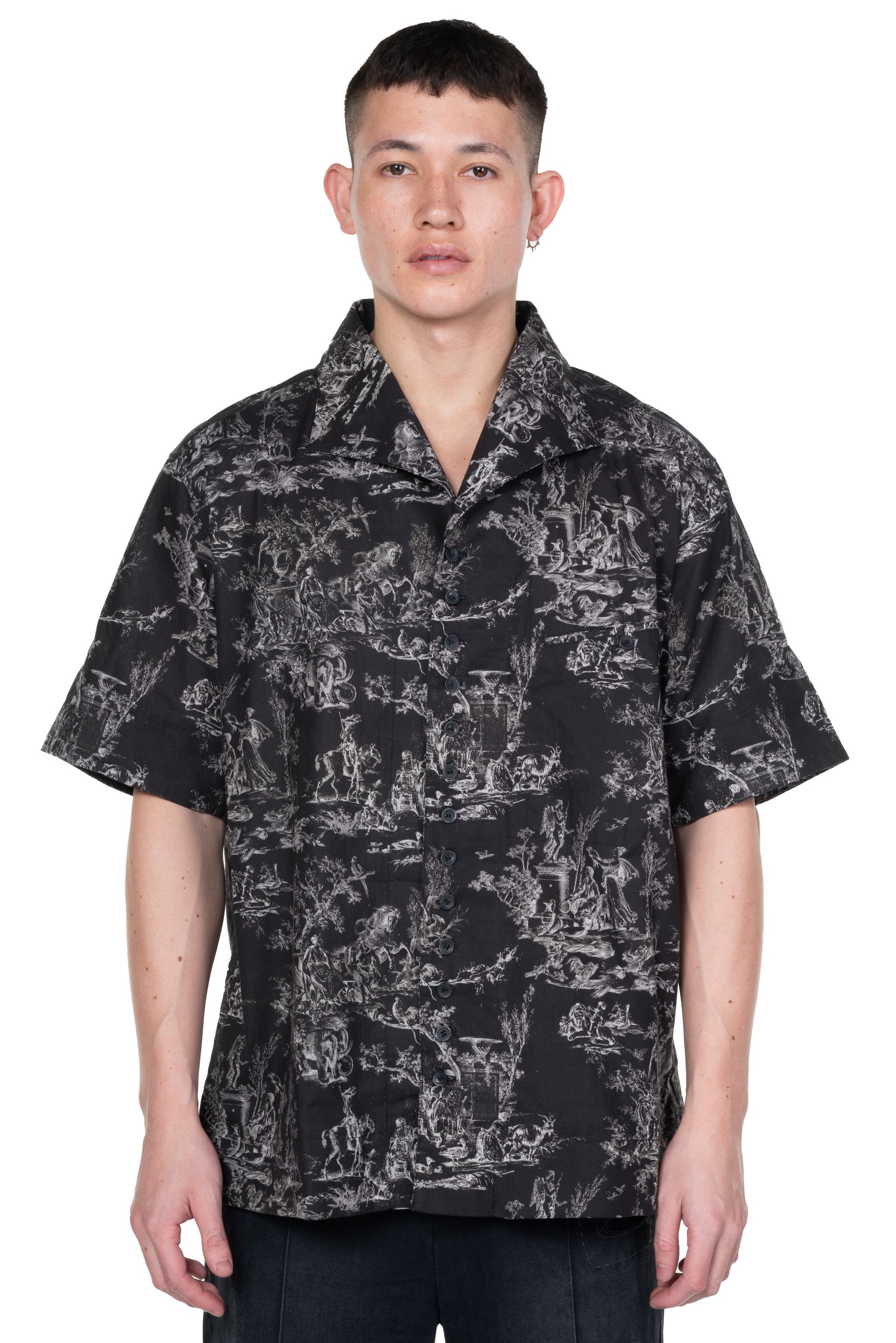 Professor. E Seasonal SS Shirt Black Short. sleeves. Button closure at front. Open collar. Seasonal print throughout. Boxy cut. Pocket at chest.