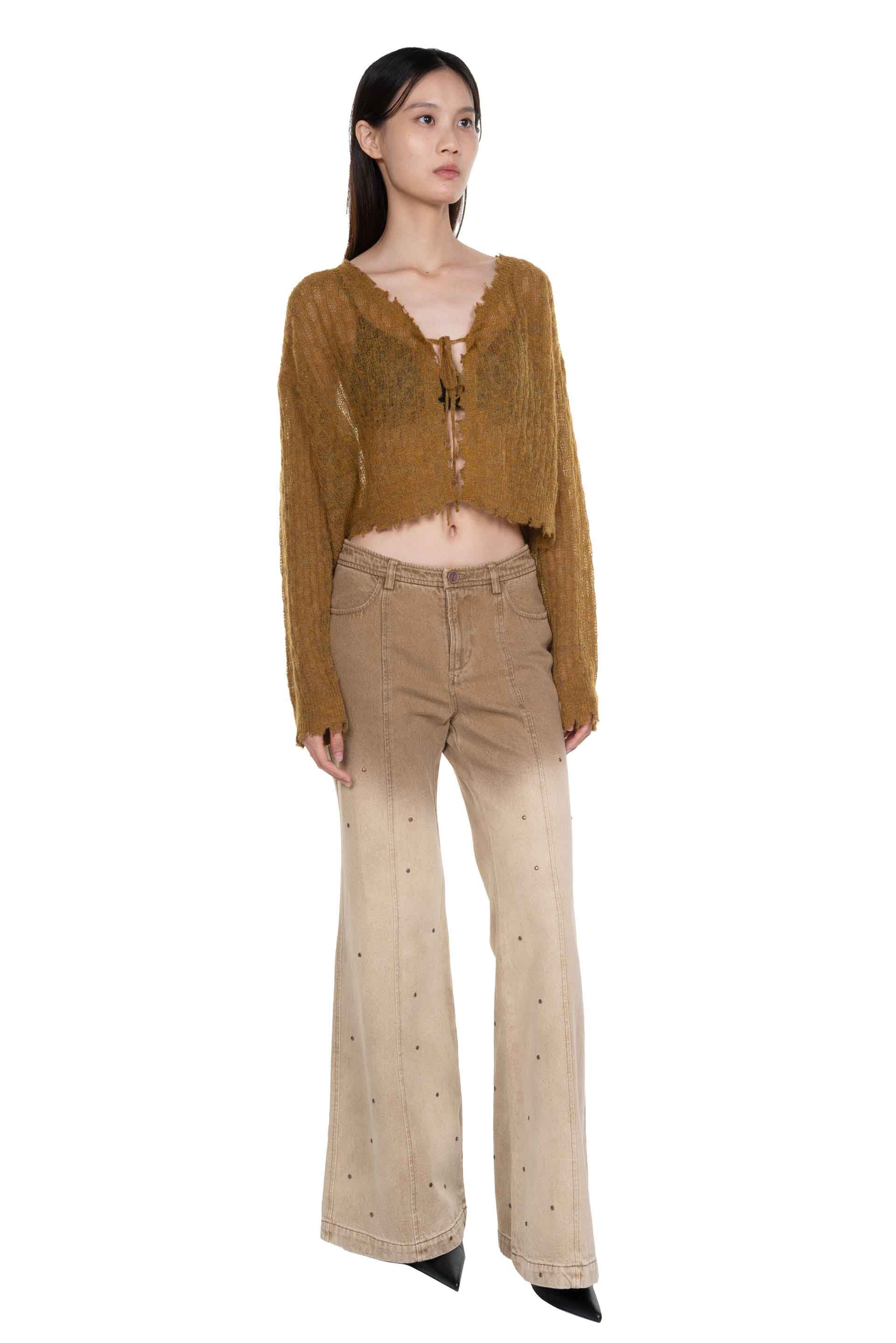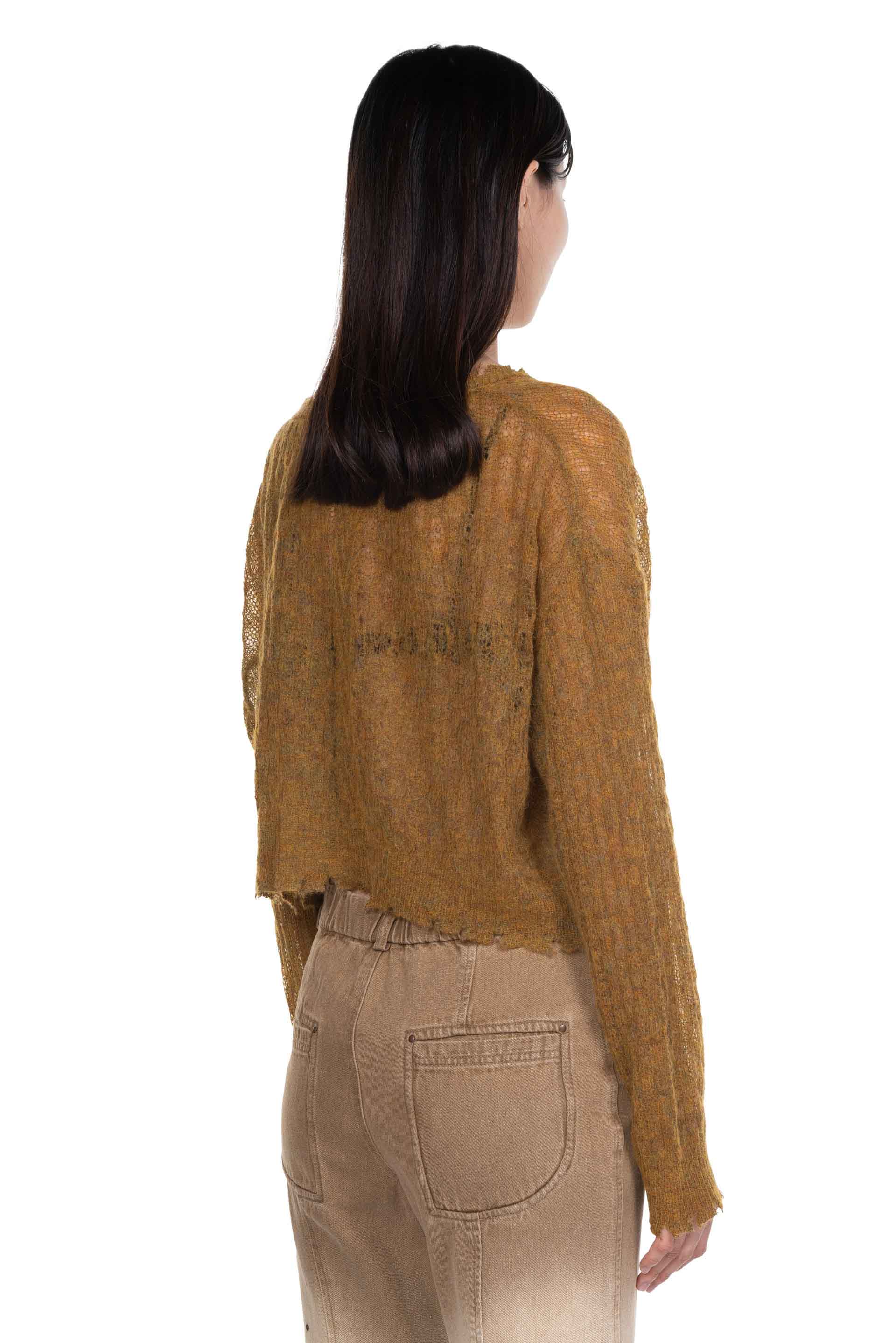 This sheer wool-knitted cardigan is knitted from baby alpaca and Merino wool-bend. With a silky lustre, alpaca is lightweight and soft as well as insulating. Merino wool is fine and soft, with excellent drape. The cropped design is flattering, and the plunging V-neckline frames the neck beautifully. The sheer bodice is finished with frayed edges to create a delicate and ethereal look, which is rich in detail and adaptable to various styling needs.