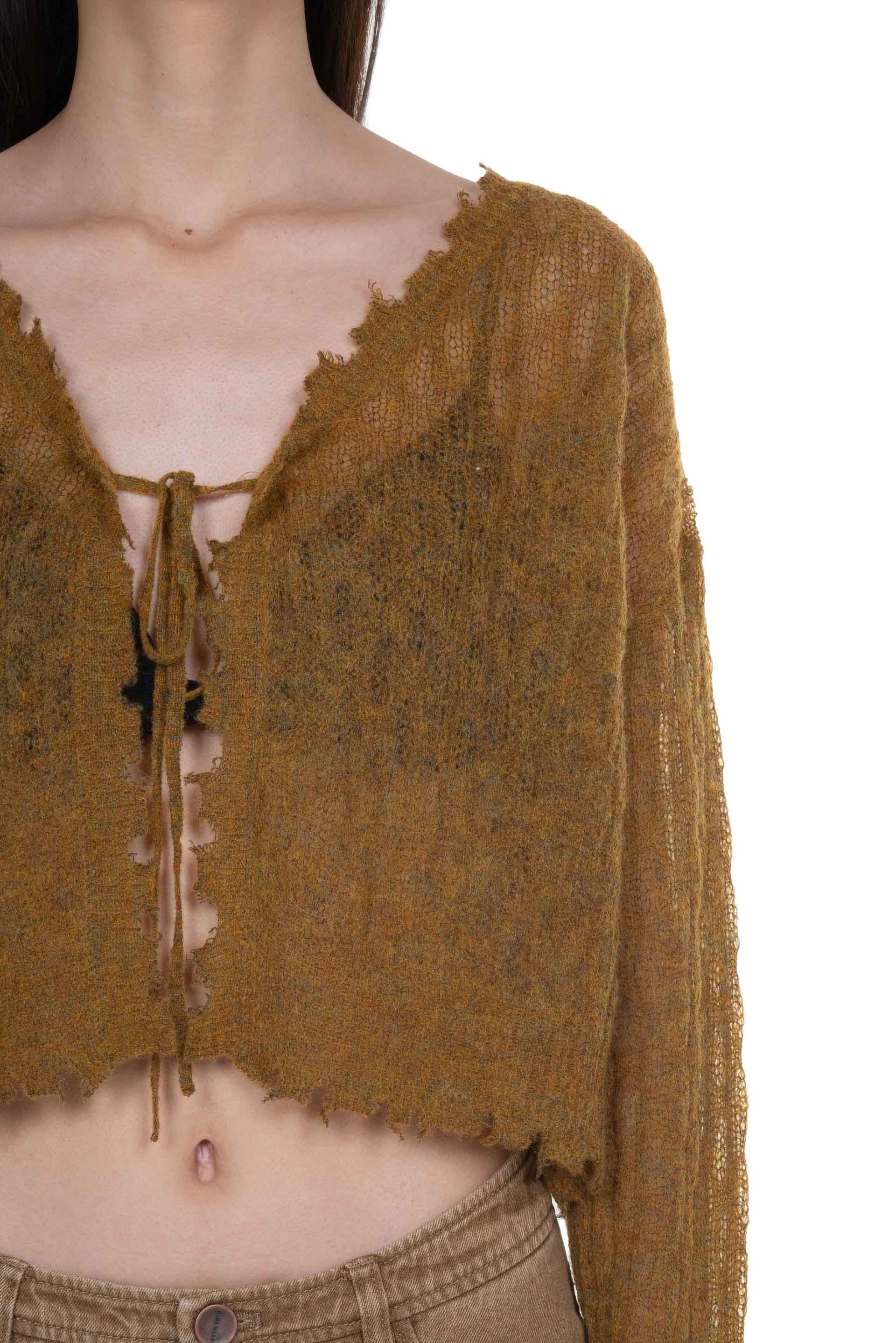 OUDE WAAG strikes a balance between Asian aesthetics and Western cutting. It is at the heart of designer’s philosophy: celebrating the power of women, yet simultaneously critiquing the ongoing objectification and idealisation of the body as you can see in the Oude Waag "Burn" collection with the Sheer Wool Knitted Cardigan Yellow Green.