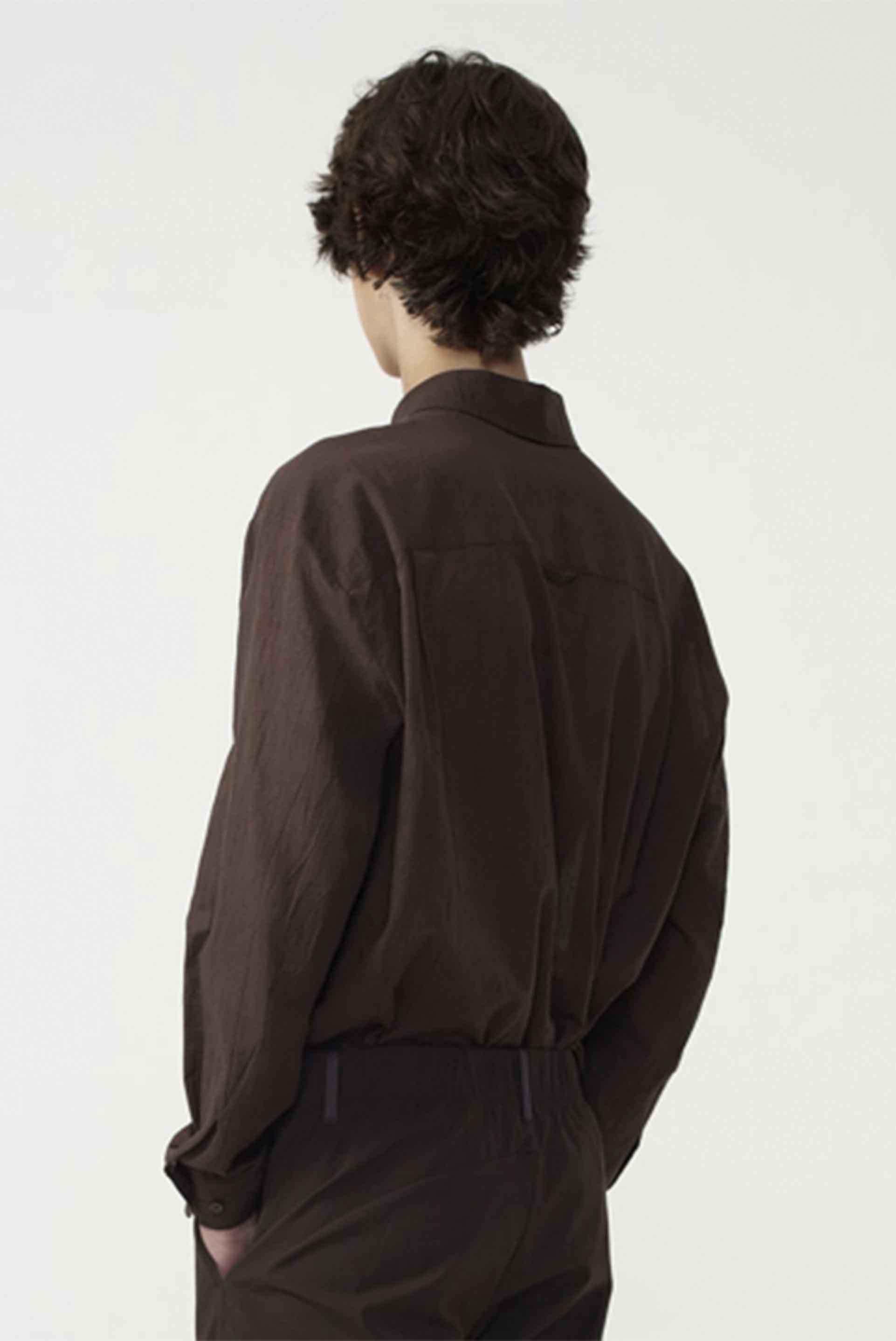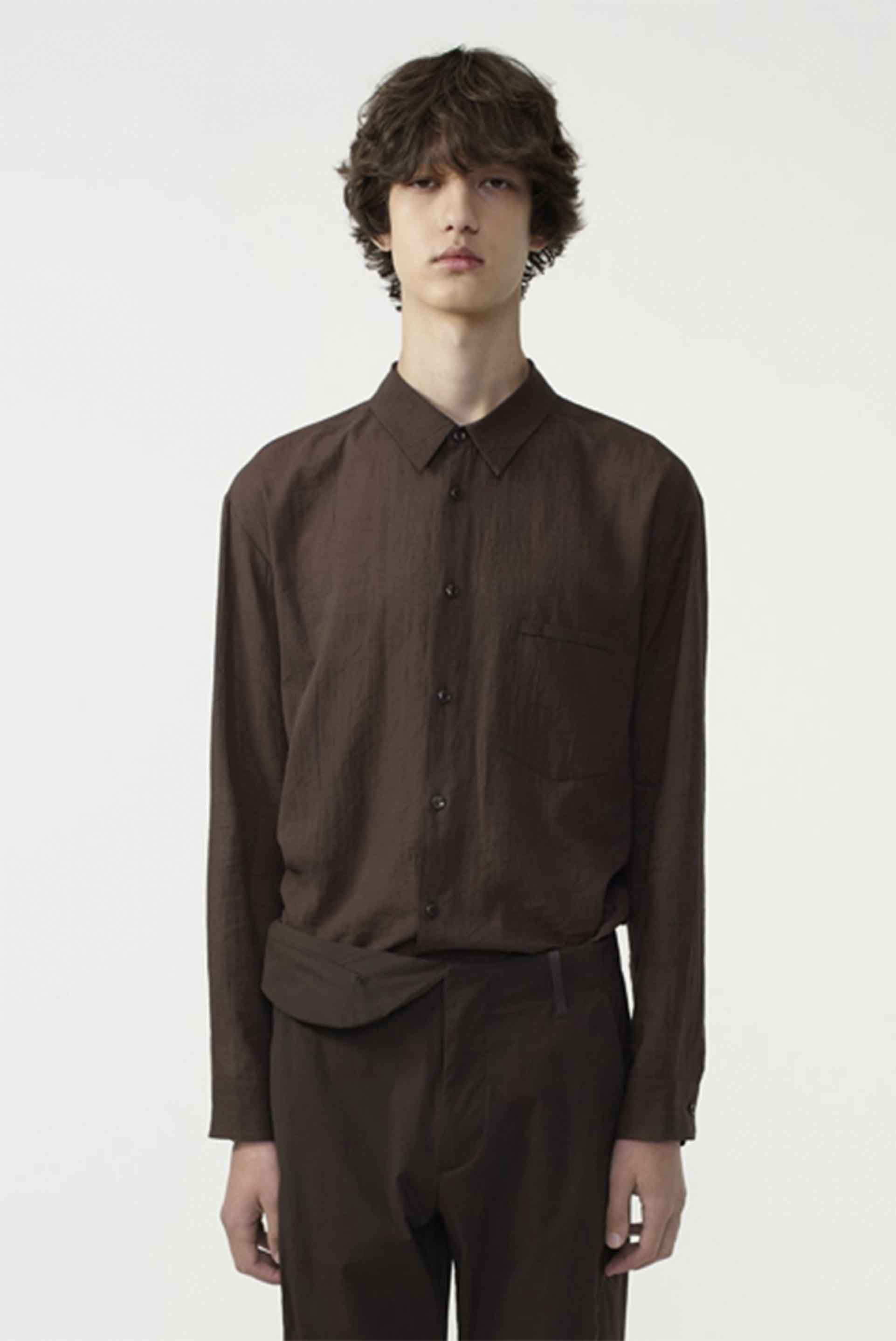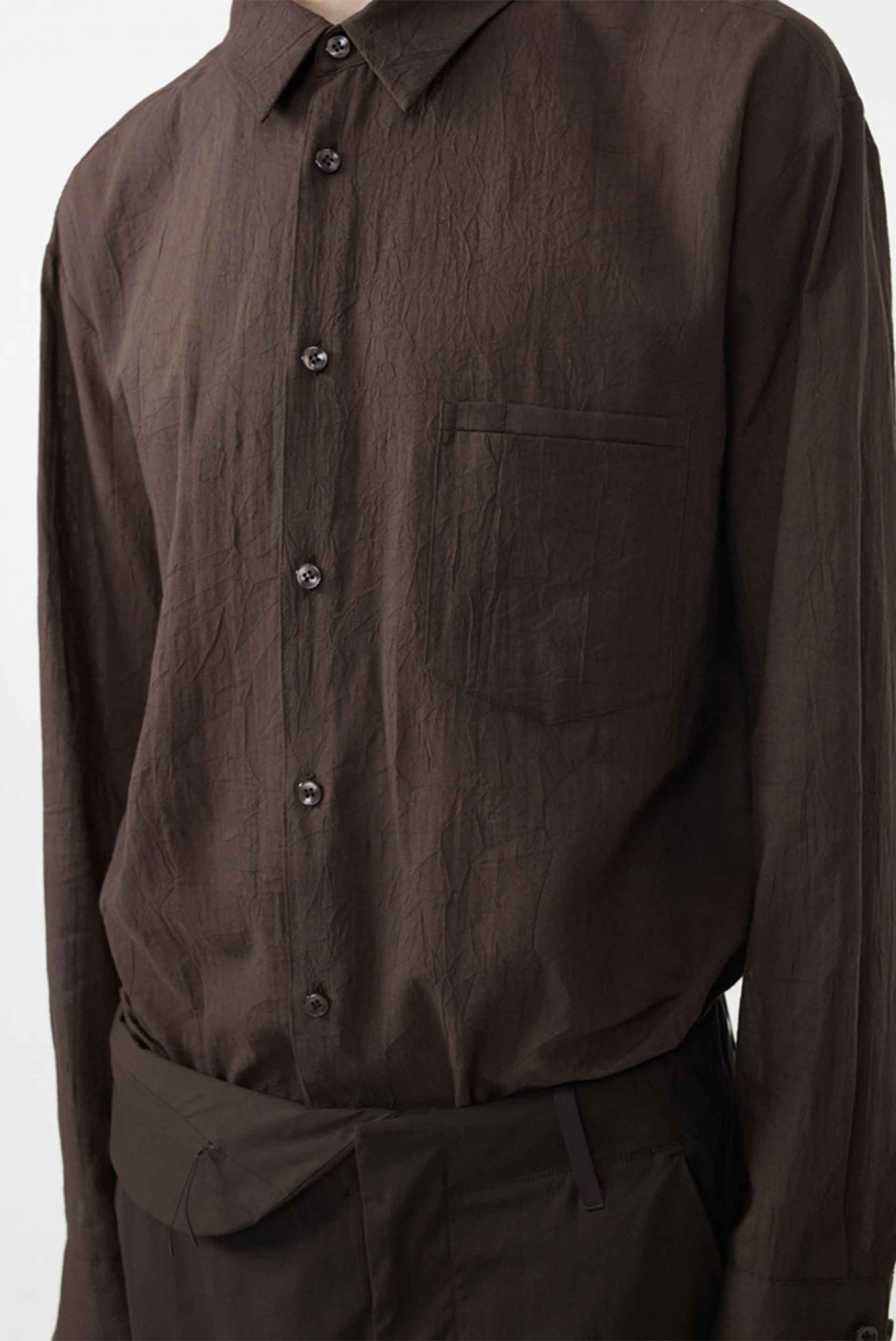 Straight point collar shirt. Bio-washed cotton in Brown. Natural creased texture. Cut out utility patch pocket. Button closure. Standard fit. Fabric from Japan