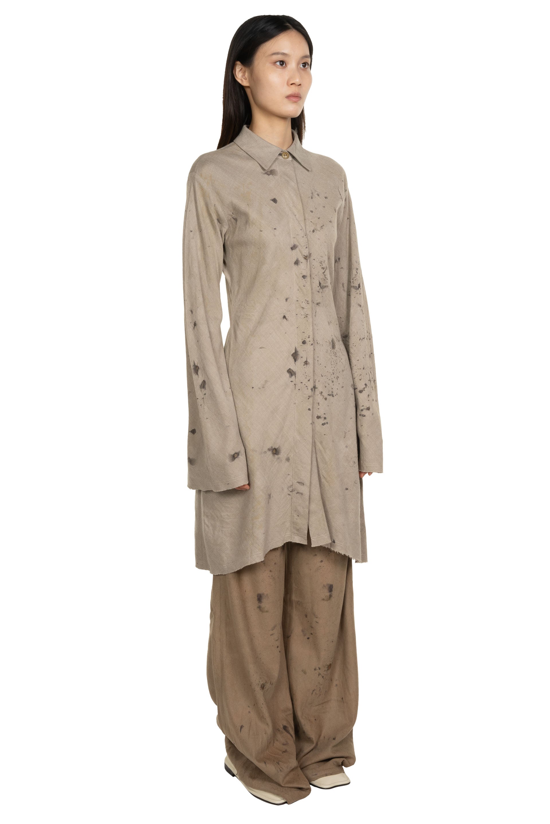 Feng Chen Wang Shirt Celadon. Long sleeves. Button closure at front. Long fit. Side pockets. Classic collar. Signature dyed finish.