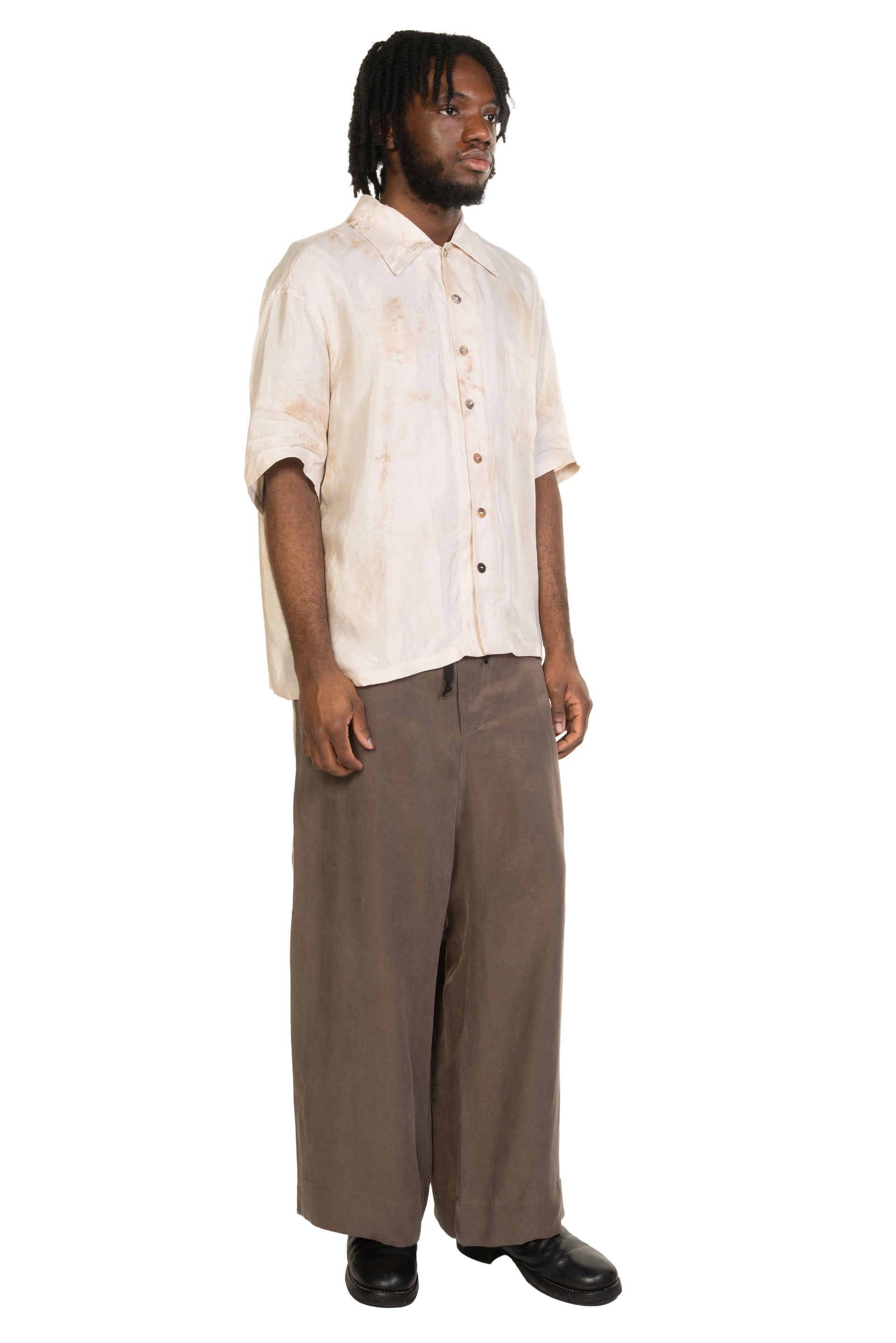 PENG approaches clothing as a quiet expression of the human experience, shaped by nature, time, and the body. Designed by Zhi-Chen Tai (formerly Peng Tai), each piece reflects a considered balance between conceptual design and everyday wearability. Natural elements such as leaves, soil, and organic textures inform the materials and silhouettes, resulting in garments that feel thoughtful, tactile, and timeless. Defined by refined craftsmanship and contemporary form, PENG offers modern menswear with a calm, organic sensibility, clothing designed to be worn, lived in, and appreciated over time as seen with the Short Sleeve Shirt Random Colour.