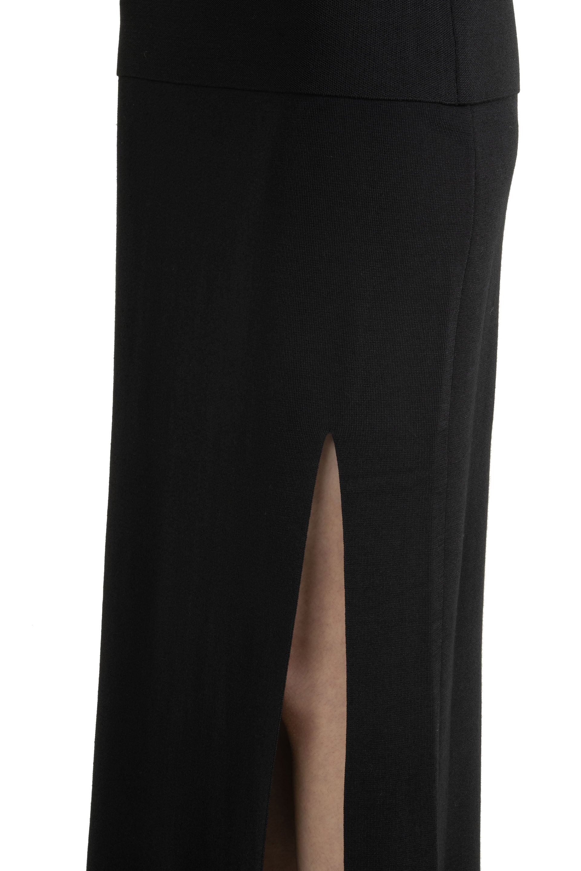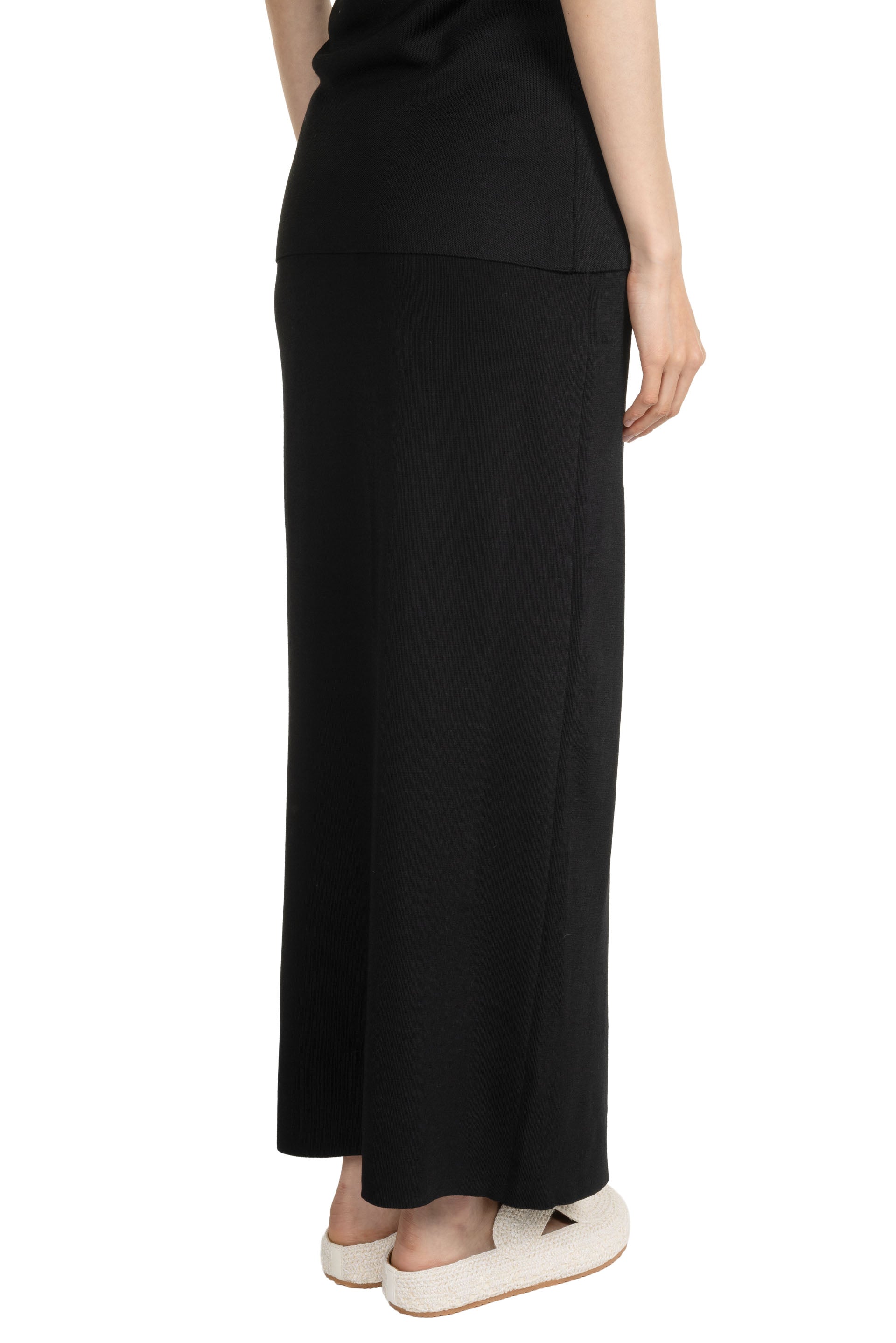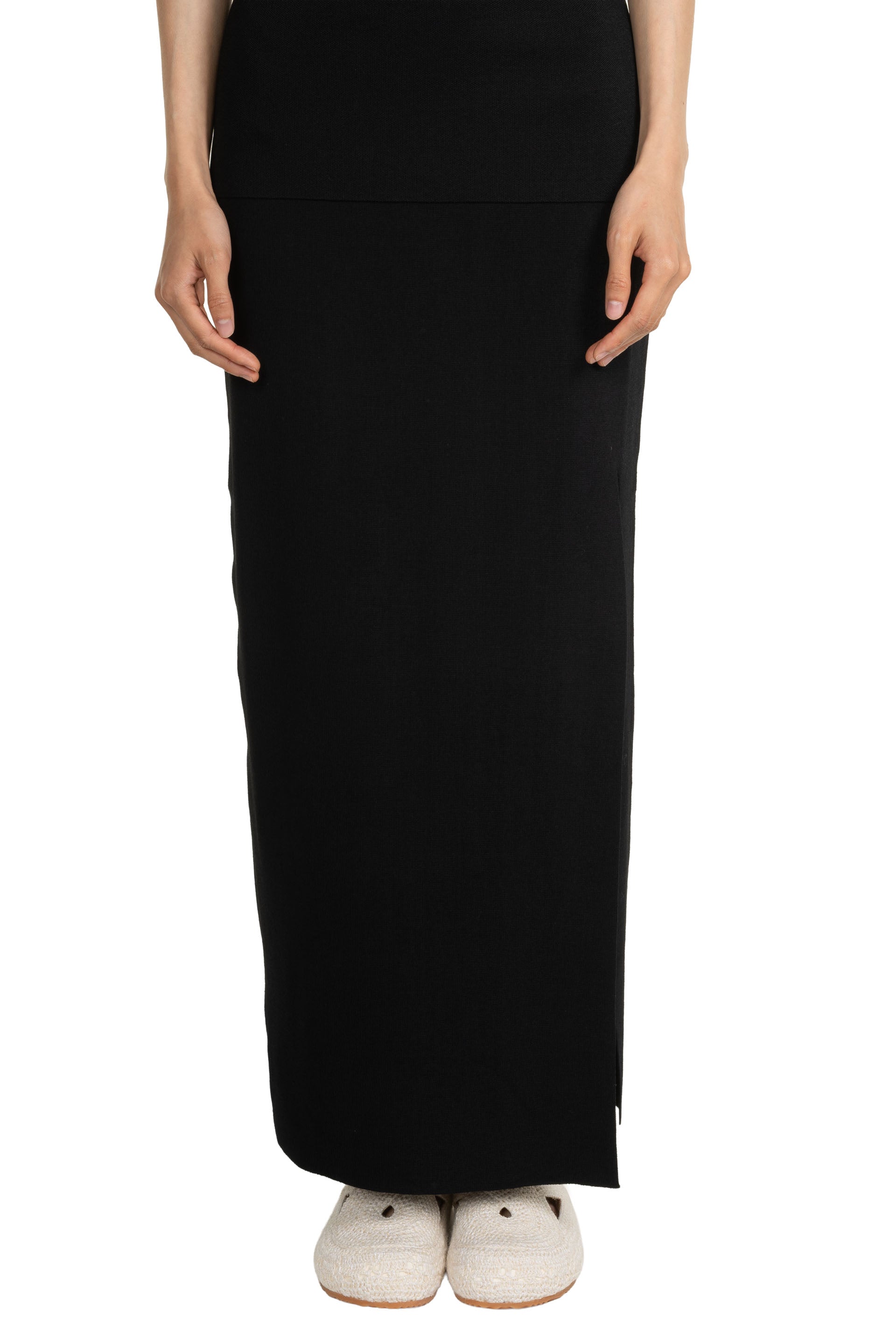 Swaying knitted skirt in black. Elastic waist. Below the knee length. Split at side. Soft and Stretchable knitted fabric..