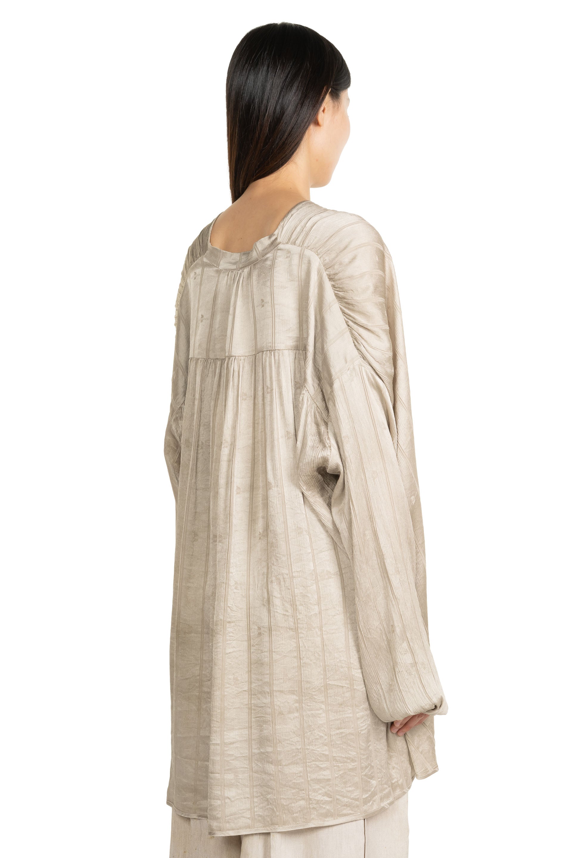 Mute Dance Silk Shirt in Beige. Drawstring closure at front. Two side pockets. Wide fit. Signature Metal dye. Hand dyed