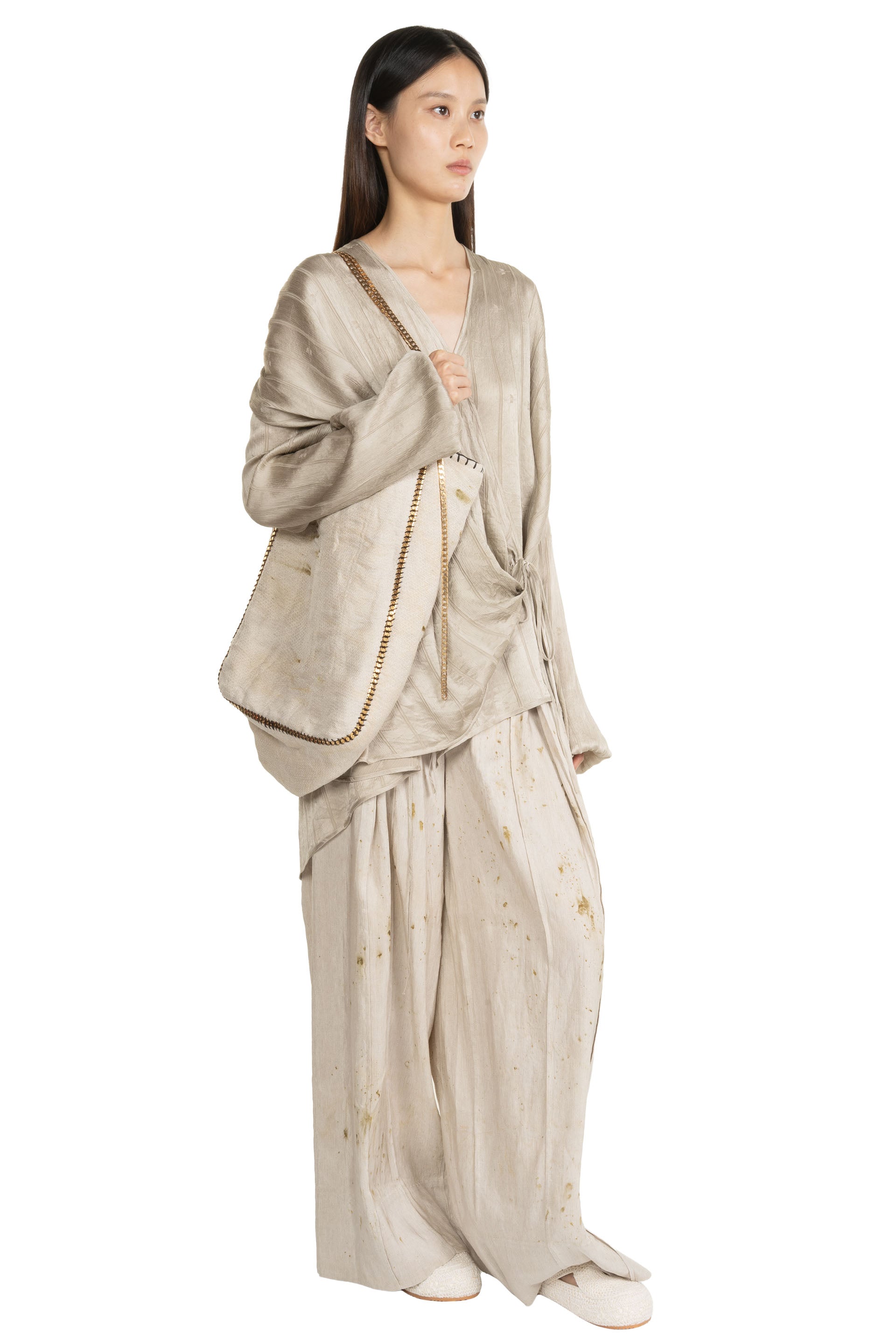 Yu Qun believes that everyone's character is multi-faceted and expressing spiritual independence. Fine hand-stitched threads, old mottled colours and patterns, and unconventional cuts are what Mute Dance has been exploring. The leaves and stems of fresh plants and berries, dried medicinal materials, old metals and so on are combined with the ancient and traditional dyeing technology to dye fabrics and paper as seen with the Silk Beige Shirt.