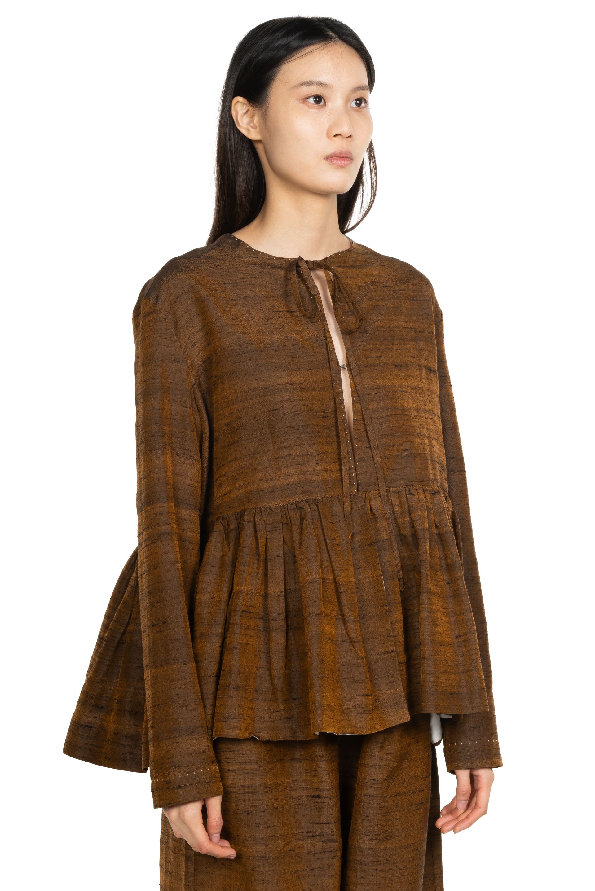 Mute Dance Jacket in Brown. Long sleeves. Button drawstring closure at front. Two side pockets. Pleated details at bottom. Rich brown bronze colour.