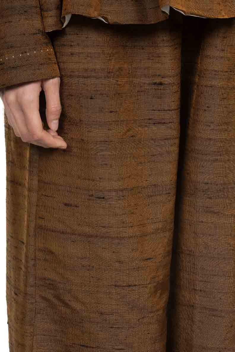 Yu Qun believes that everyone's character is multi-faceted and expressing spiritual independence. Fine hand-stitched threads, old mottled colours and patterns, and unconventional cuts are what Mute Dance has been exploring. The leaves and stems of fresh plants and berries, dried medicinal materials, old metals and so on are combined with the ancient and traditional dyeing technology to dye fabrics and paper as seen with the Silk Brown Trousers.