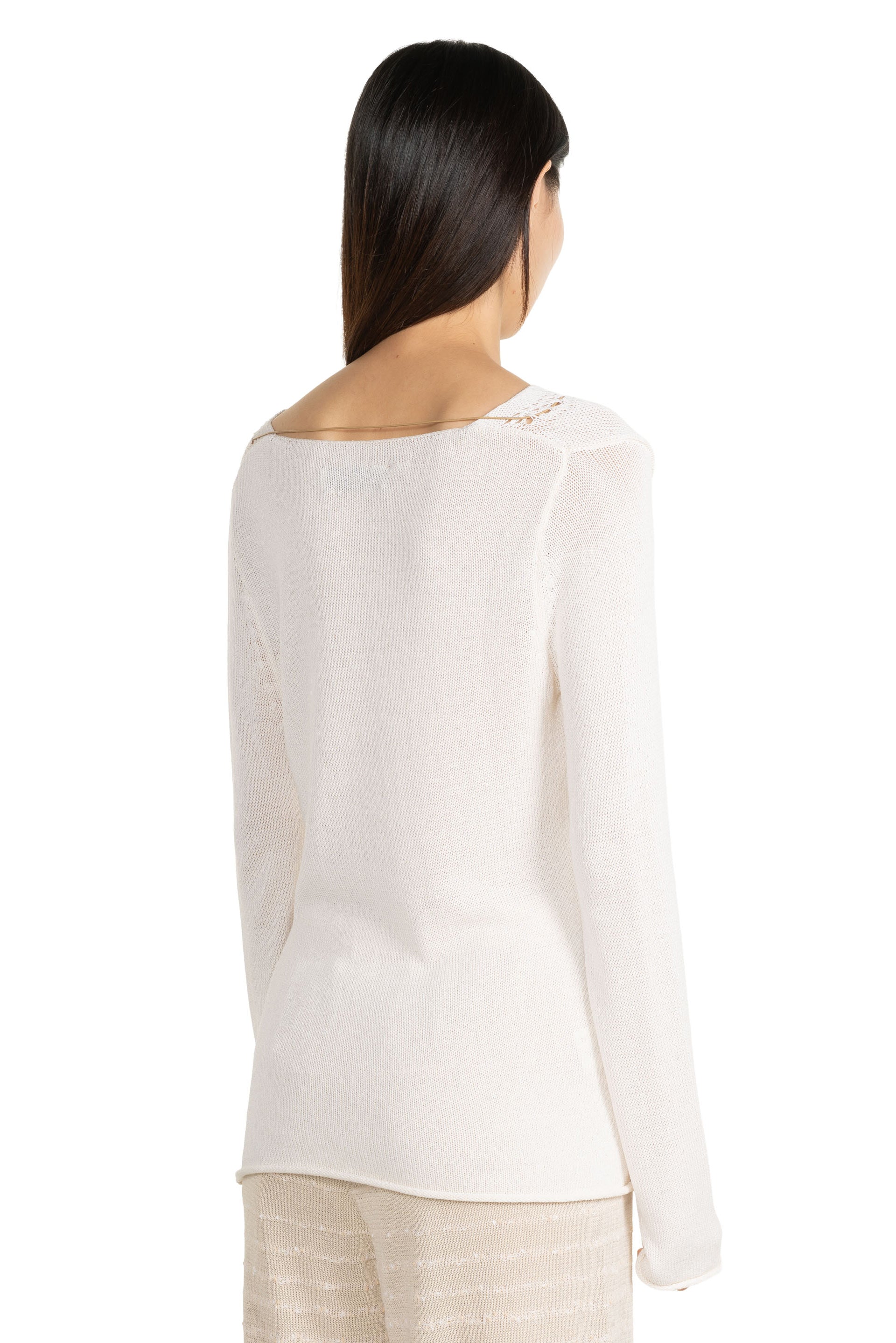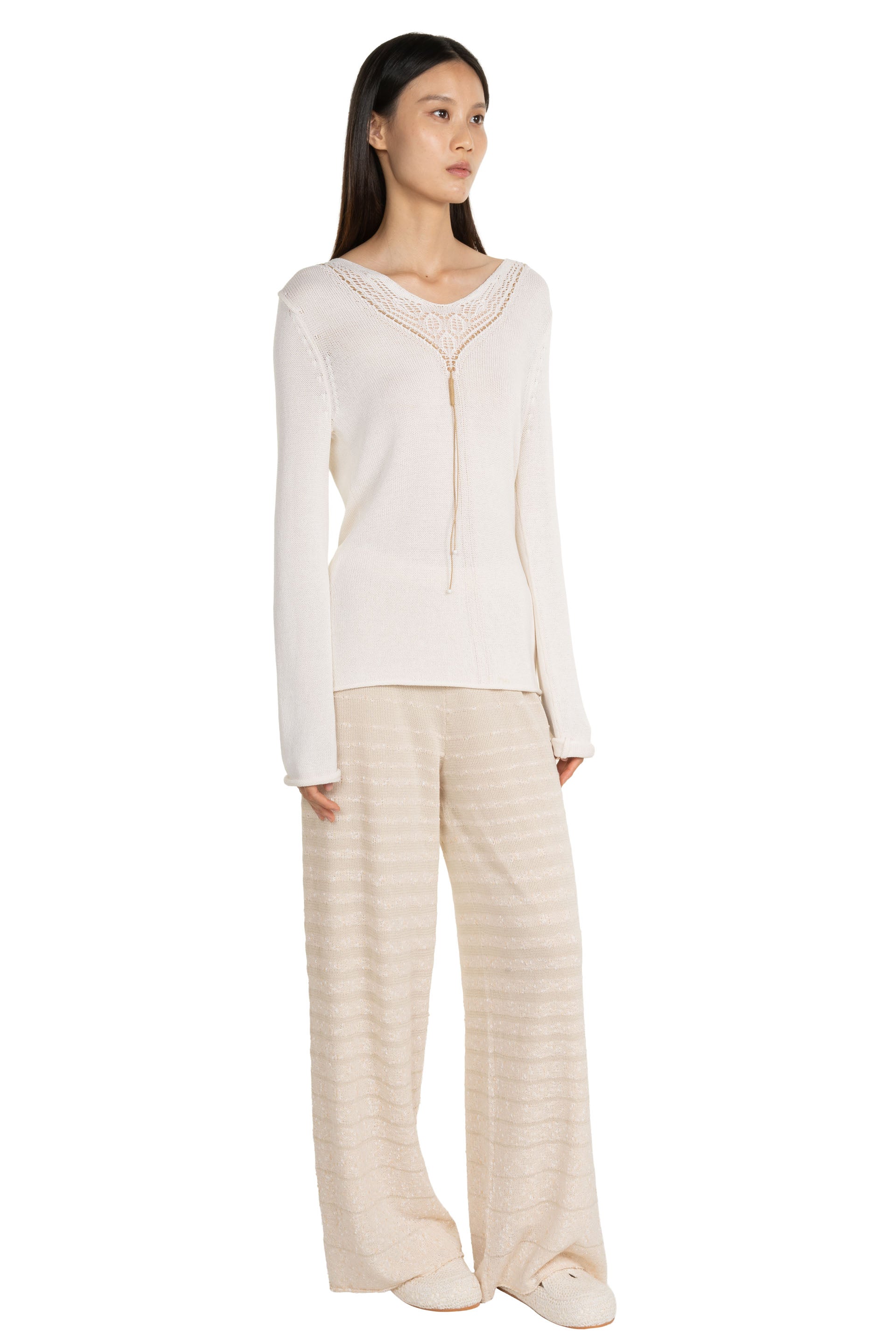Swaying redefines modern knitwear by fusing artisanal craftsmanship with contemporary design. Through innovative textures, intricate yarn play, and hybrid weaving techniques, each piece balances softness and strength. Sourcing premium European and Japanese materials, Swaying/Knit ensures a luxurious hand feel while embracing sustainable fashion. With delicate details and timeless sophistication, the brand delivers elevated, wearable art for the discerning, fashion-forward wardrobe as seen with the Silk Pendant Long Sleeve Top.