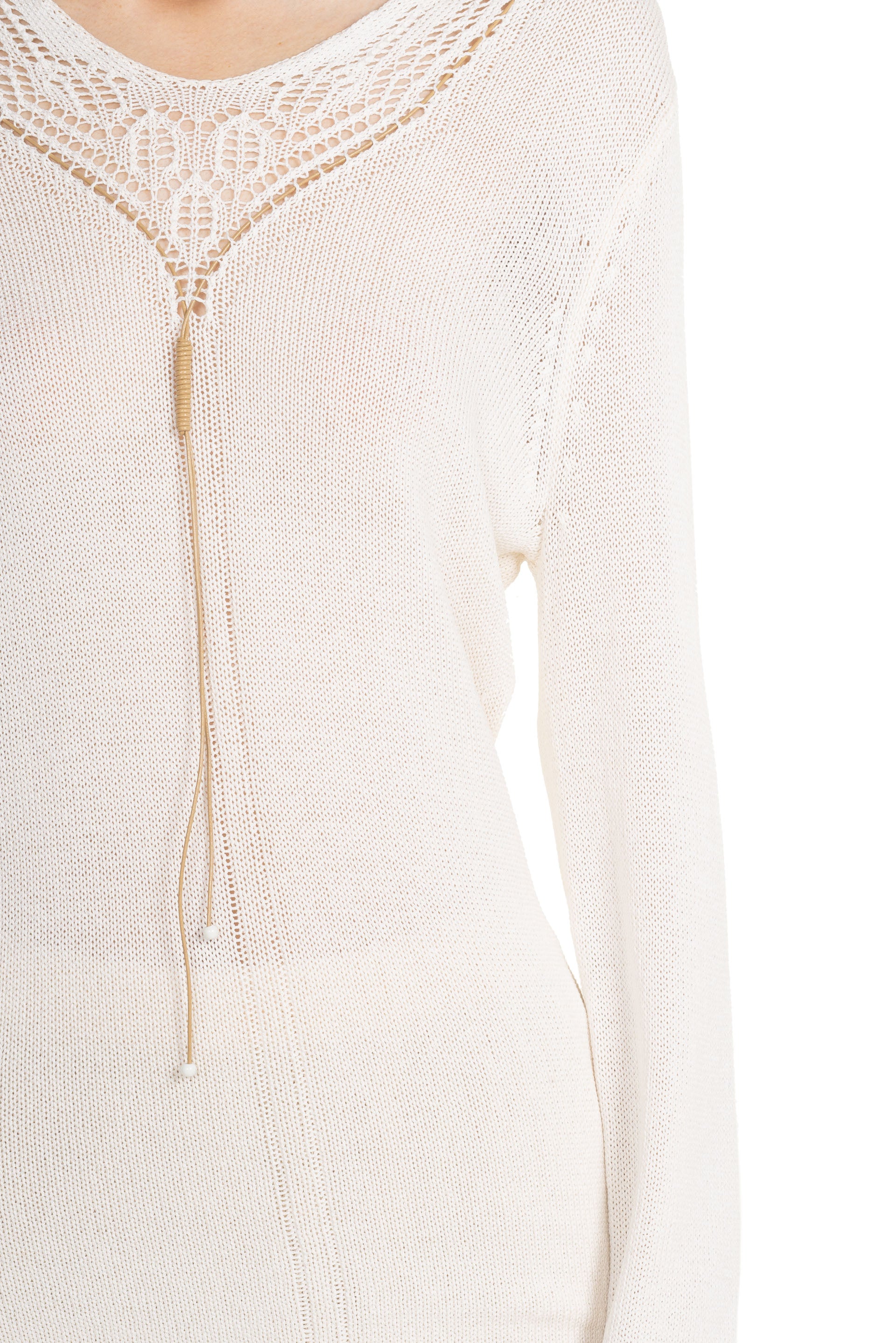 Swaying silk knitted top with pendant details. Long sleeves. Hand knitted detailing at front. Wooden pendant details at front.