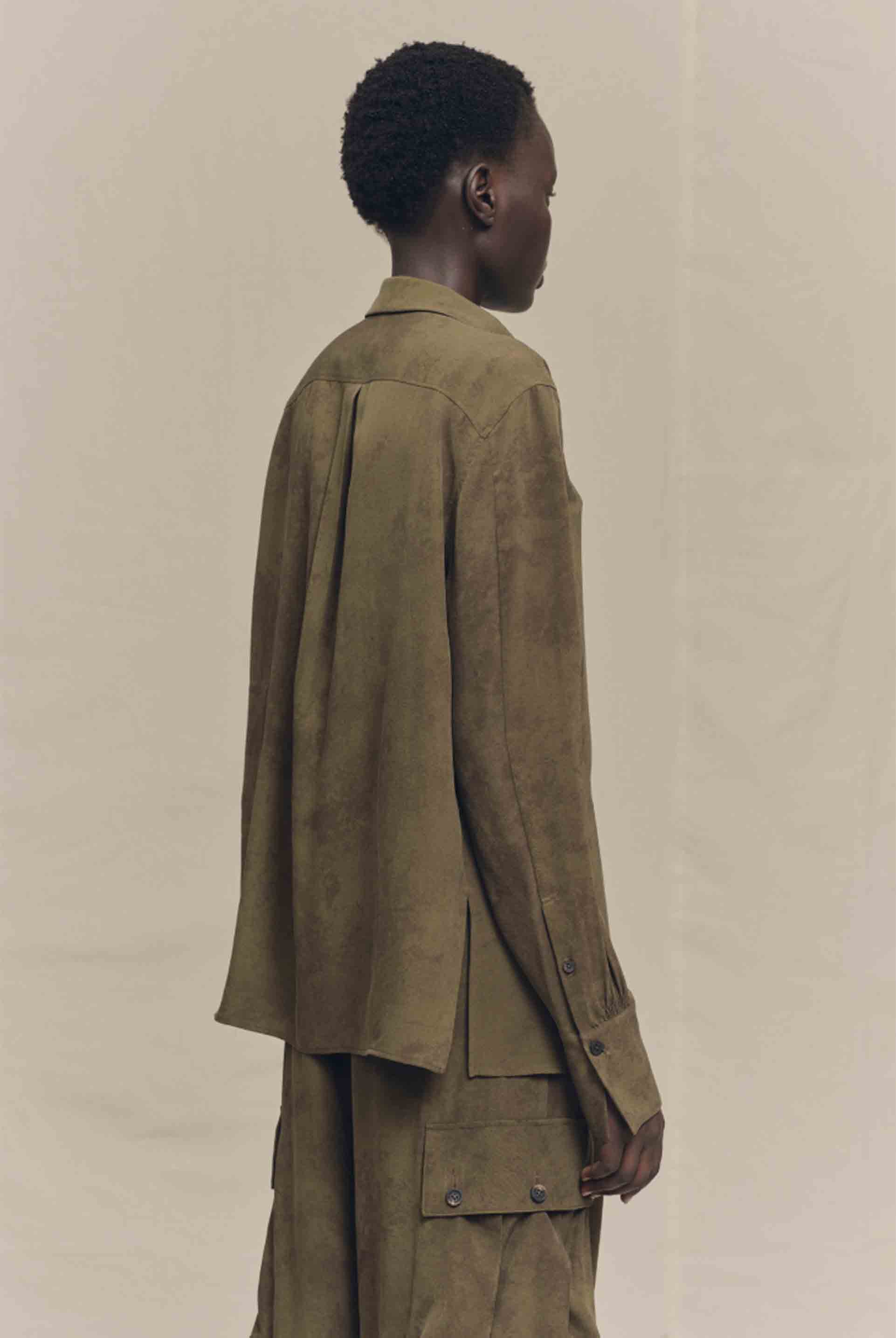 Ziggy Chen silk shirt in silk. Long sleeves. Button closure at front. Oversize fit. Slit at side. Pleated at back. Rich olive colour in a soft textural silk fabric.