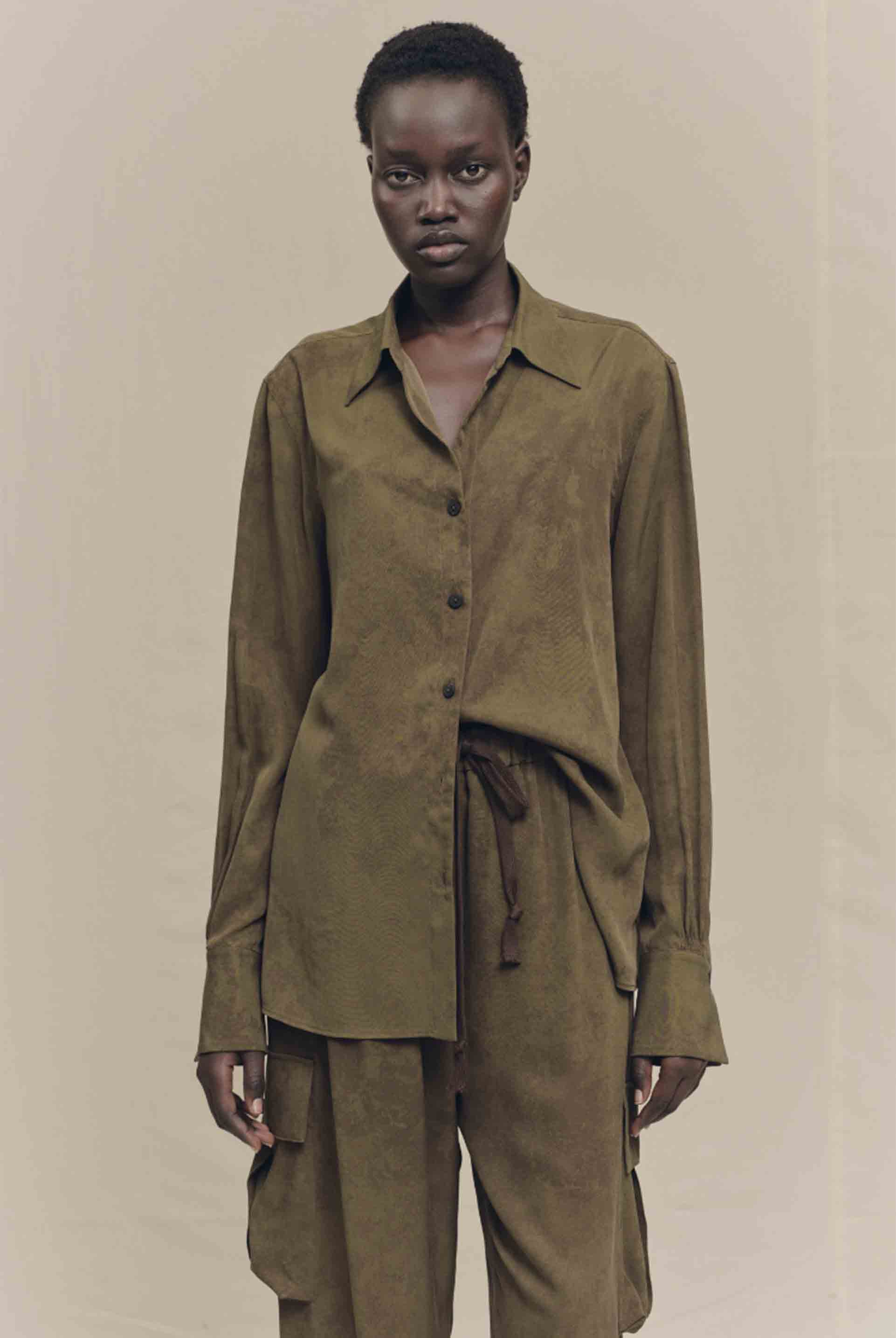 With a color palette of browns and greens, Ziggy Chen’s designs evoke the textures of aged architecture and the natural world. The garments feel as natural as they look, combining softness with structure. Seamlessly blending Eastern and Western influences, Ziggy Chen captures the essence of timeless beauty, from fluid silhouettes to intricate patterns. Ziggy Chen continues to redefine the intersection of tradition and modernity in fashion as seen with the Silk Shirt Olive.