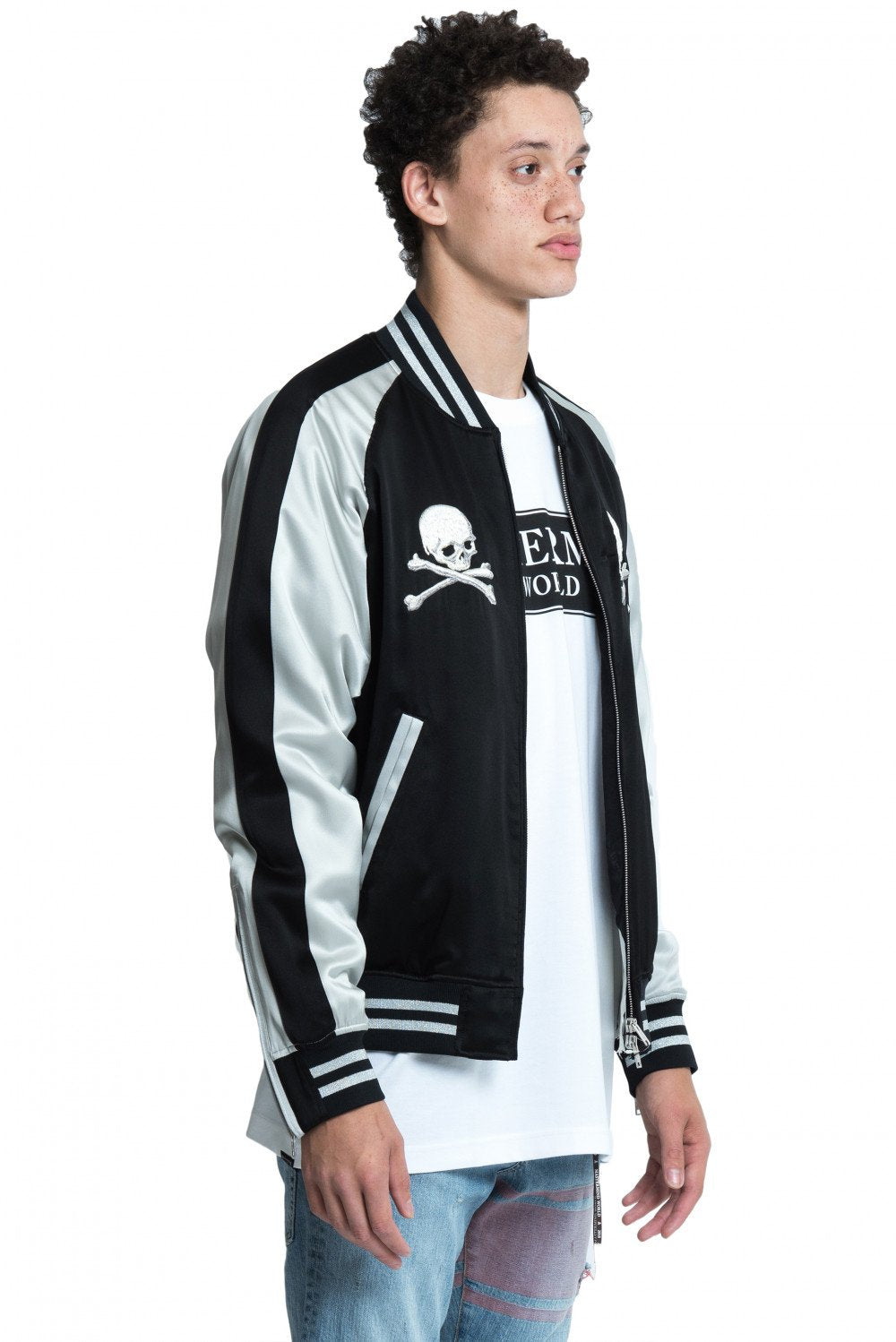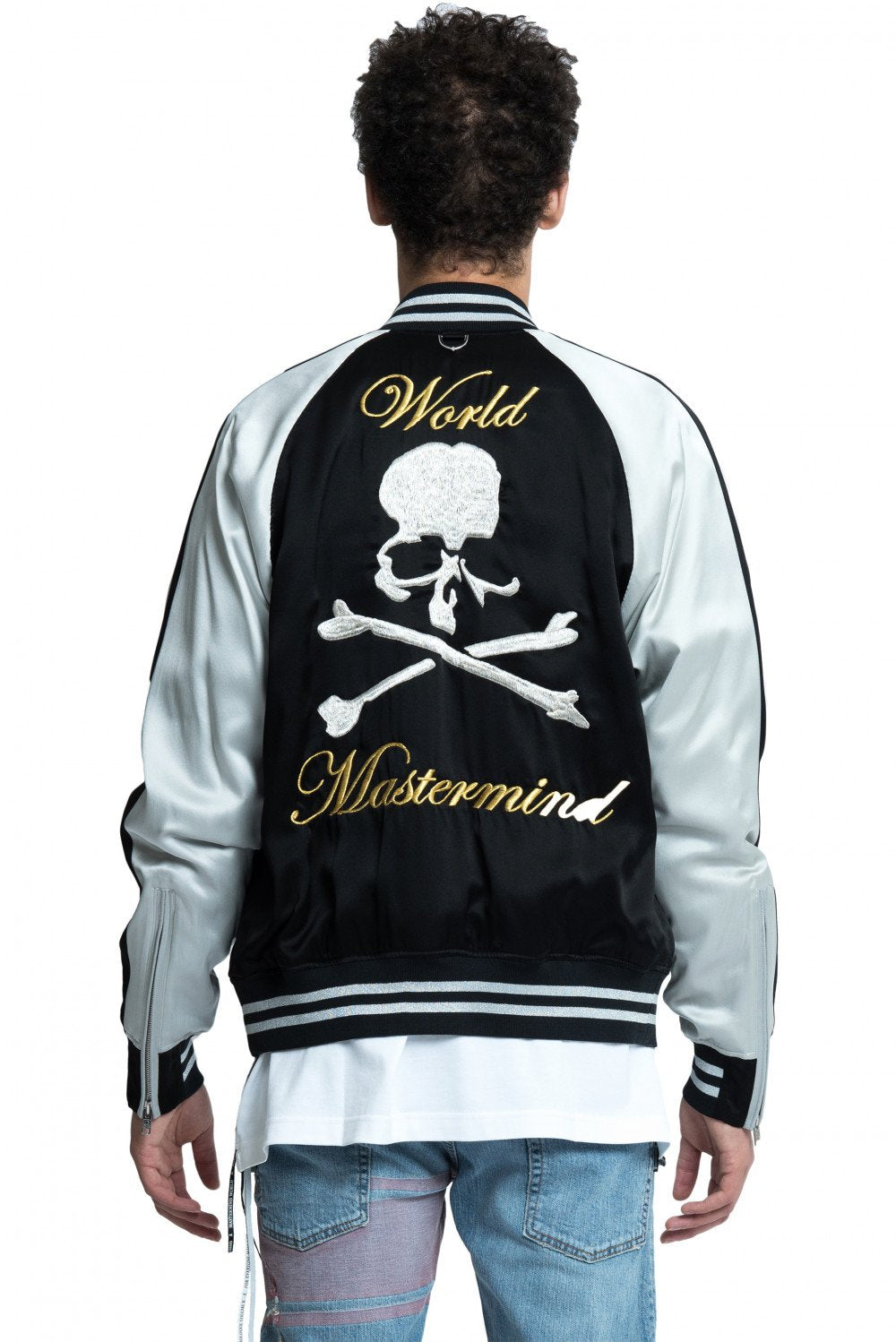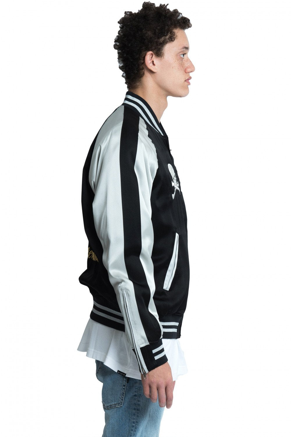 The skull and crossbones motif has now become notorious in luxury streetwear, Mastermind Japan and now Mastermind World has been the original pioneer of the streetwear movement we see today. The Skull Embroidery Souvenir Jacket brought in the Black and Grey colourway is a staple piece in any streetwear collection.