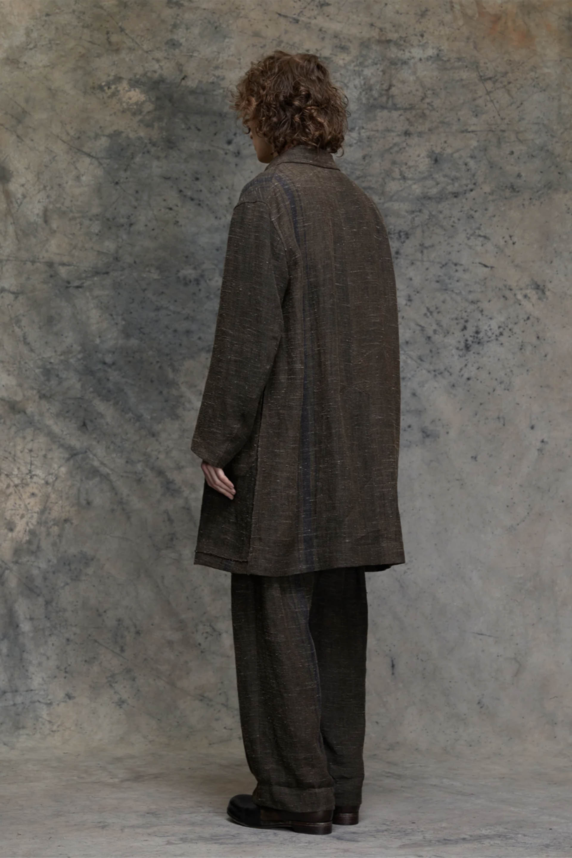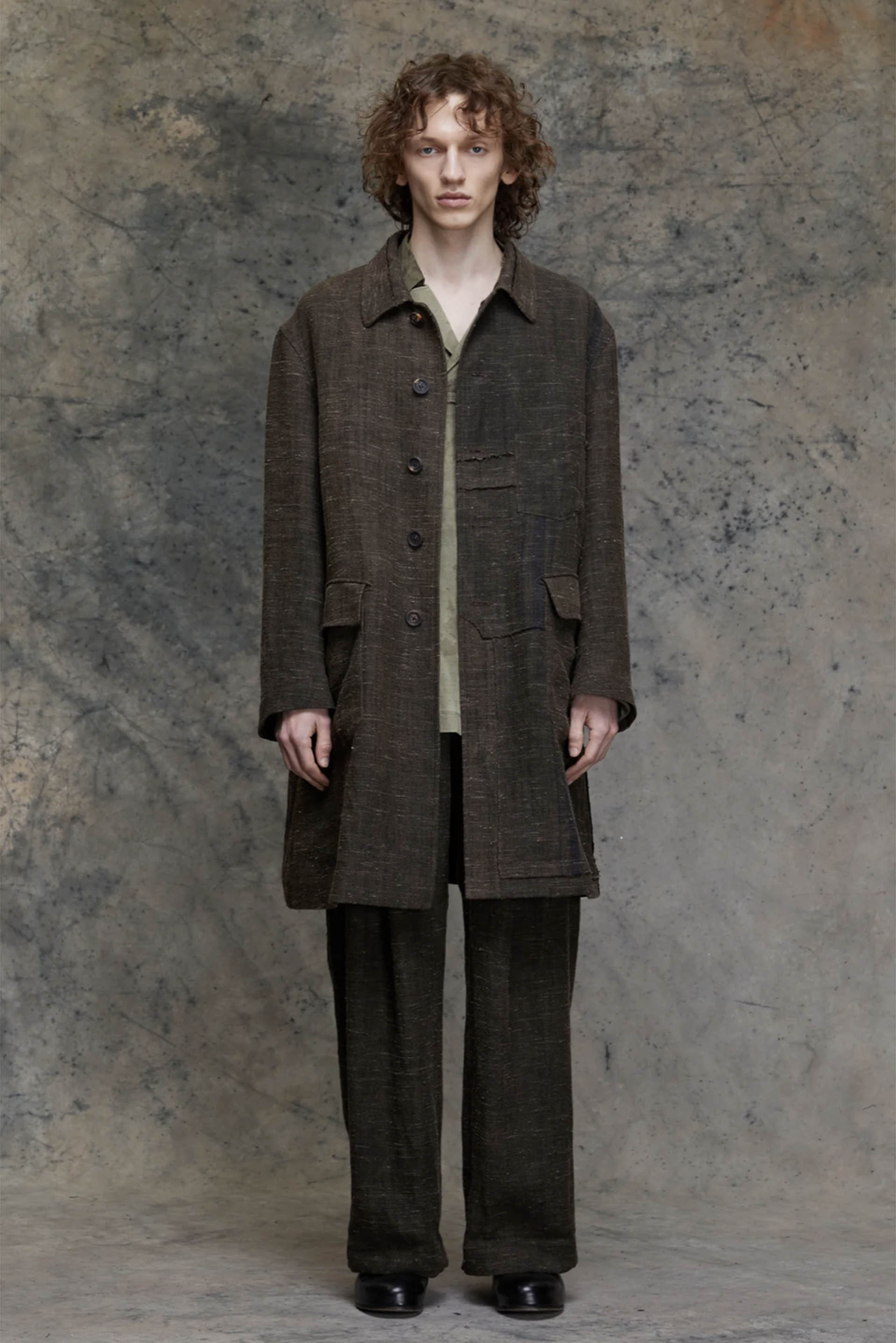 Below the knee length. Slightly loose fit. Visible single breasted button closure. Lapel collar. One chest pocket and two flap pockets. One back slit. Fully lined.