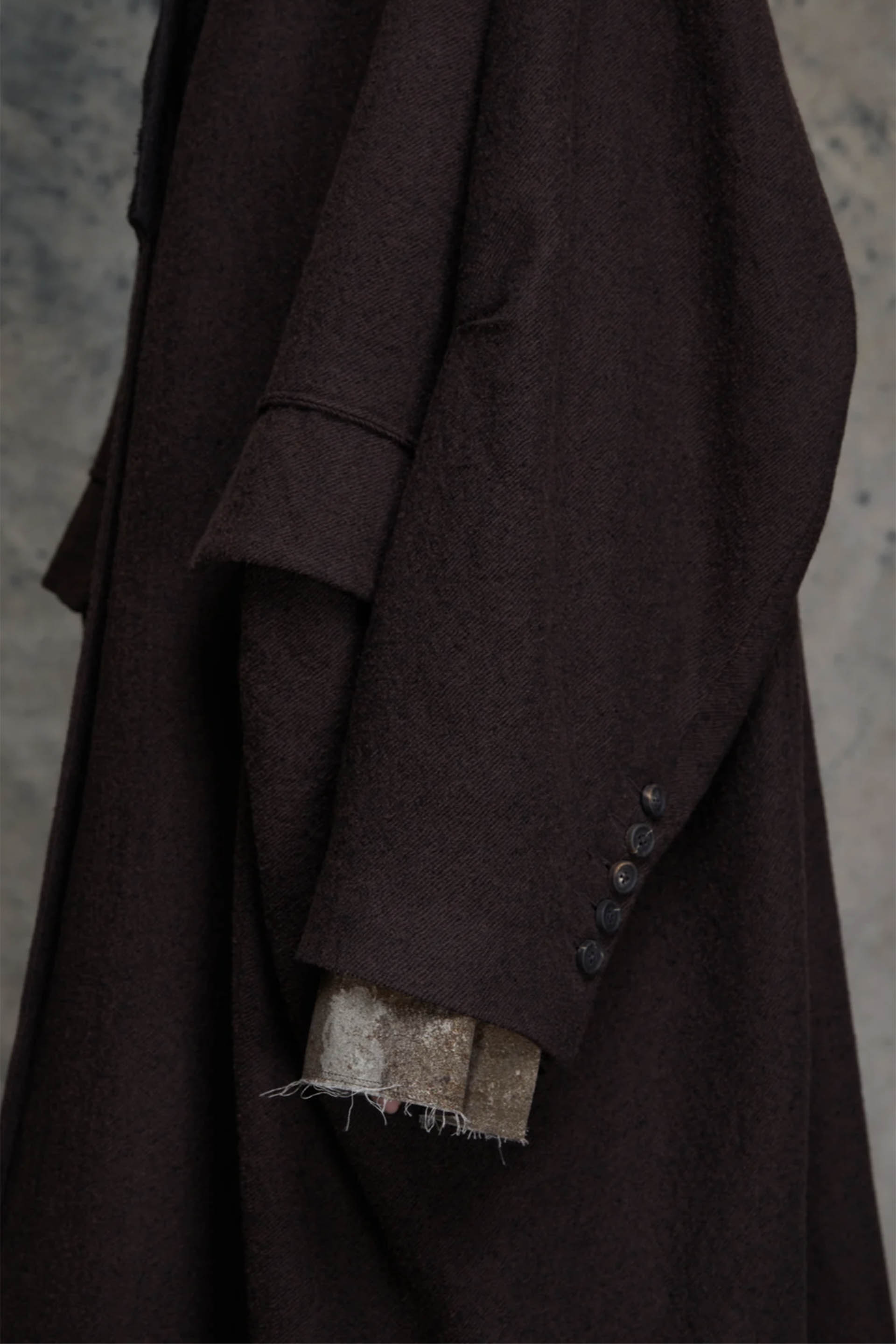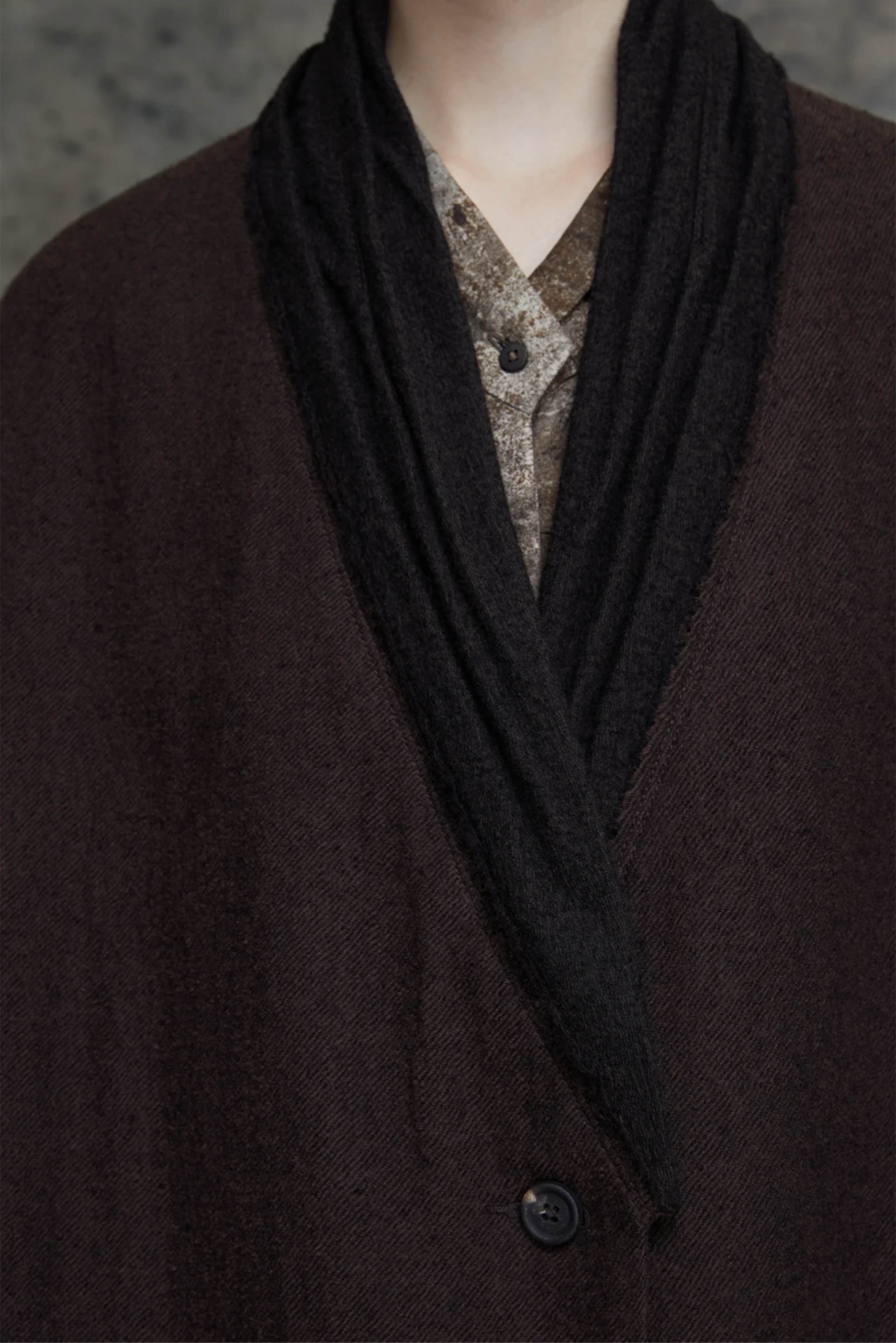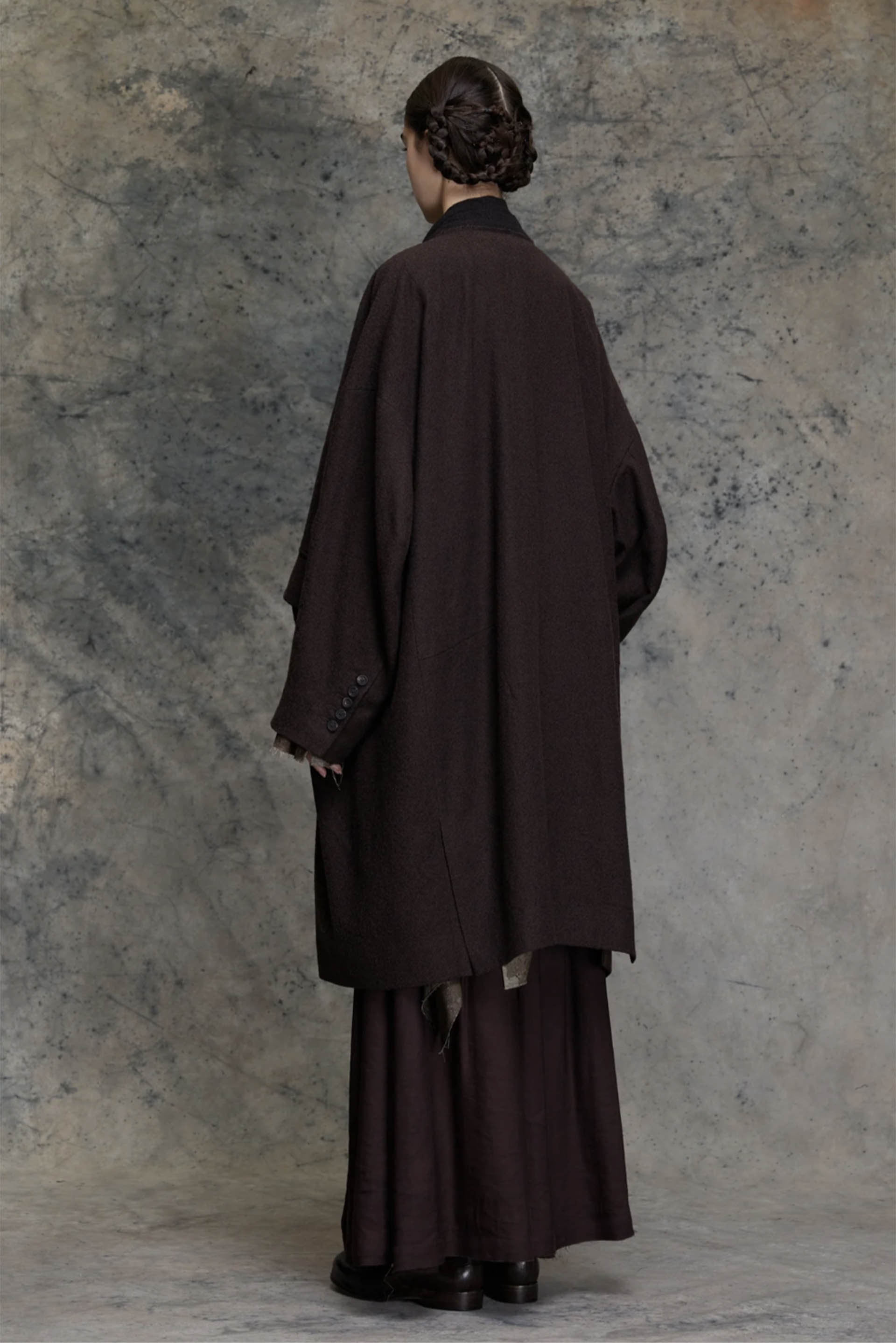 Single button coat. Loose fit. Over the knee length. Pleated shawl collar. Single button closure. Two front panel pockets. Slightly dropped shoulders. Fully lined.