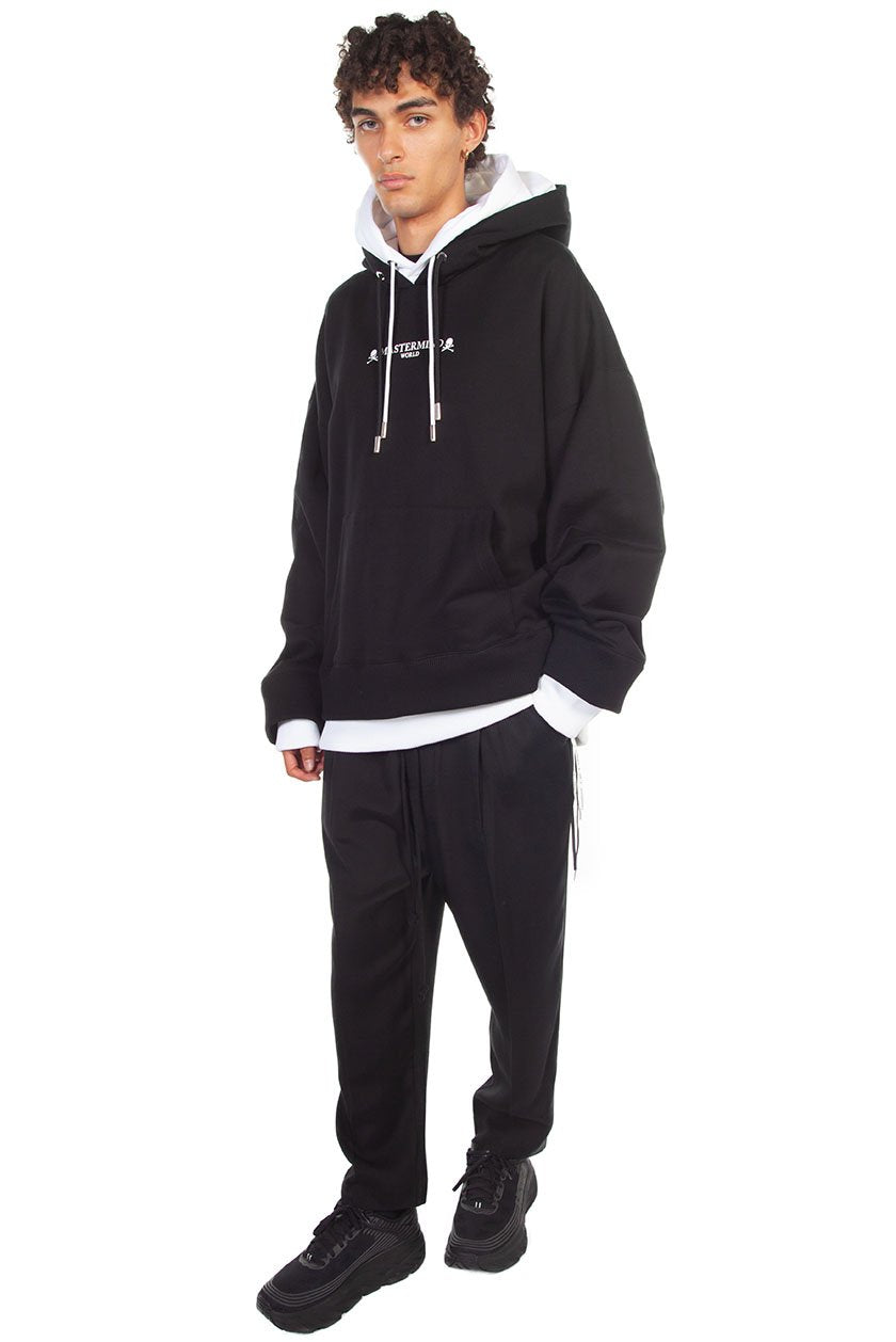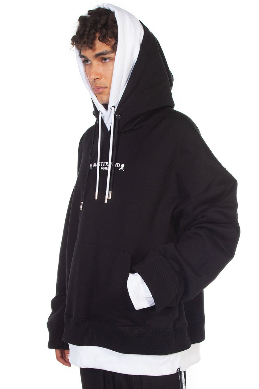 Double hoodie. Drawstring fastening. Logo print to the front. Skull print to the rear. Long sleeves. Long sleeve French terry hoodie in black and white. Panelled construction. Drawstring and logo embroidered in black at hood. Logo embroidered in black at front. Patch pockets at waist. Rib knit cuffs and asymmetric hem. Tonal textile logo flag at side-seams. Silver-tone hardware.