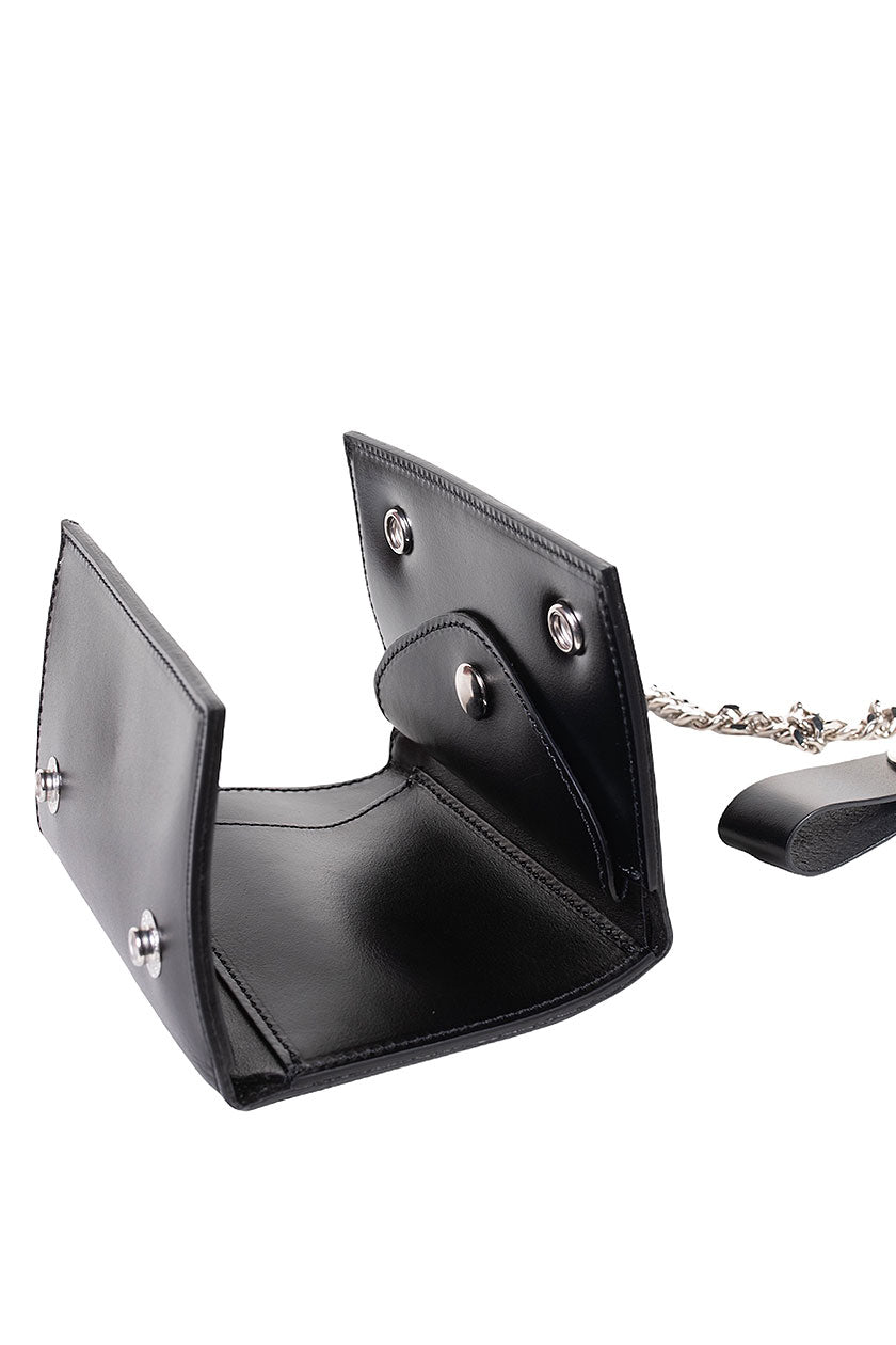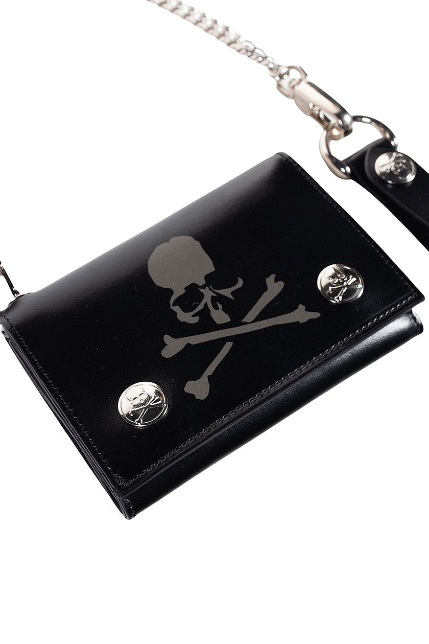 mastermind JAPAN Chained Wallet. Detachable chain. Front skull logo. Note slot. Inner coin pocket. 2 inner card slots. Press-stud closure. Silver-tone hardware