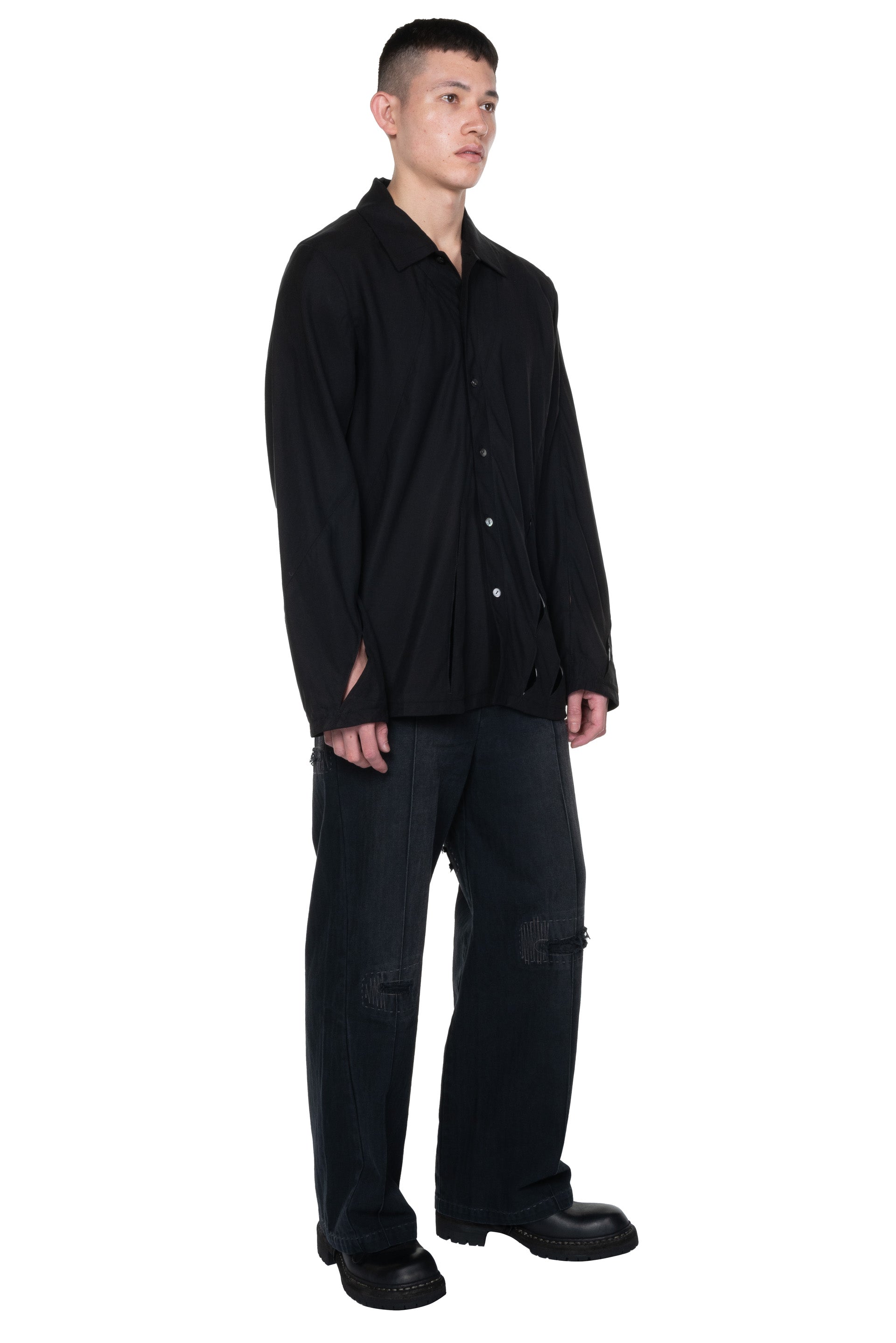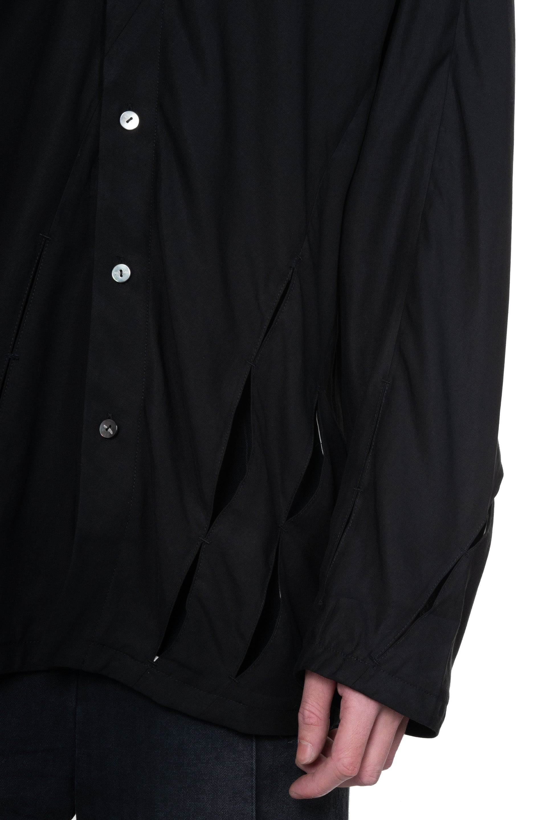 Professor. E Slit Shirt Black. Long sleeves. Button closure at front. Slit details throughout. Button at cuffs.