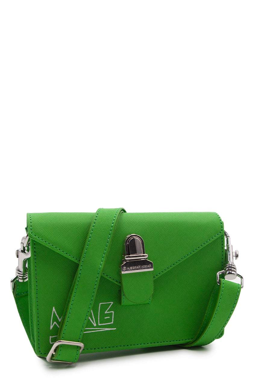 Envelope style bag. Printed logo at front. Fold-over top with push-lock closure. Removable straps and belt loops.