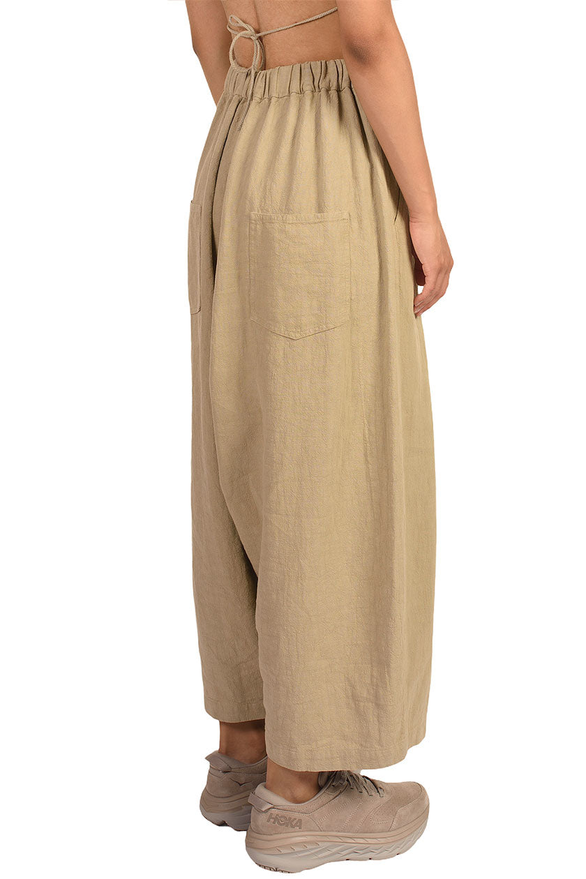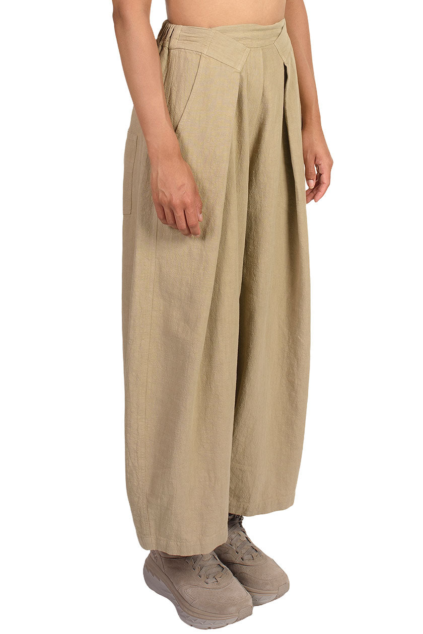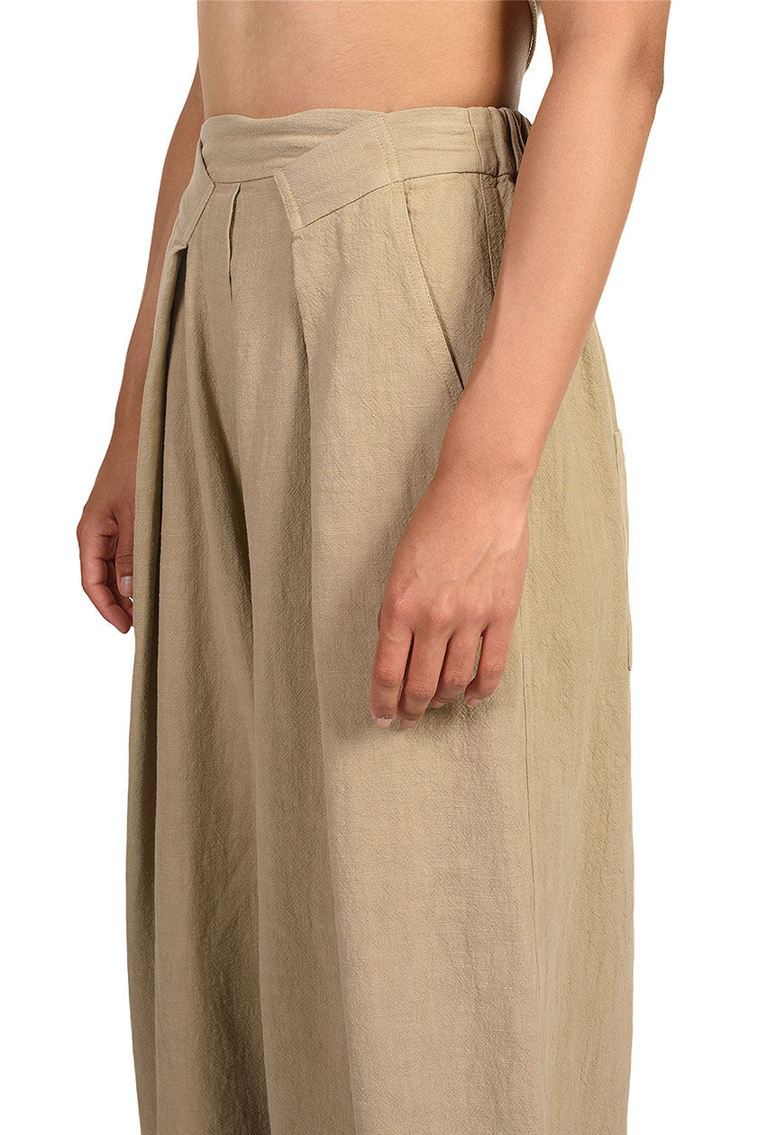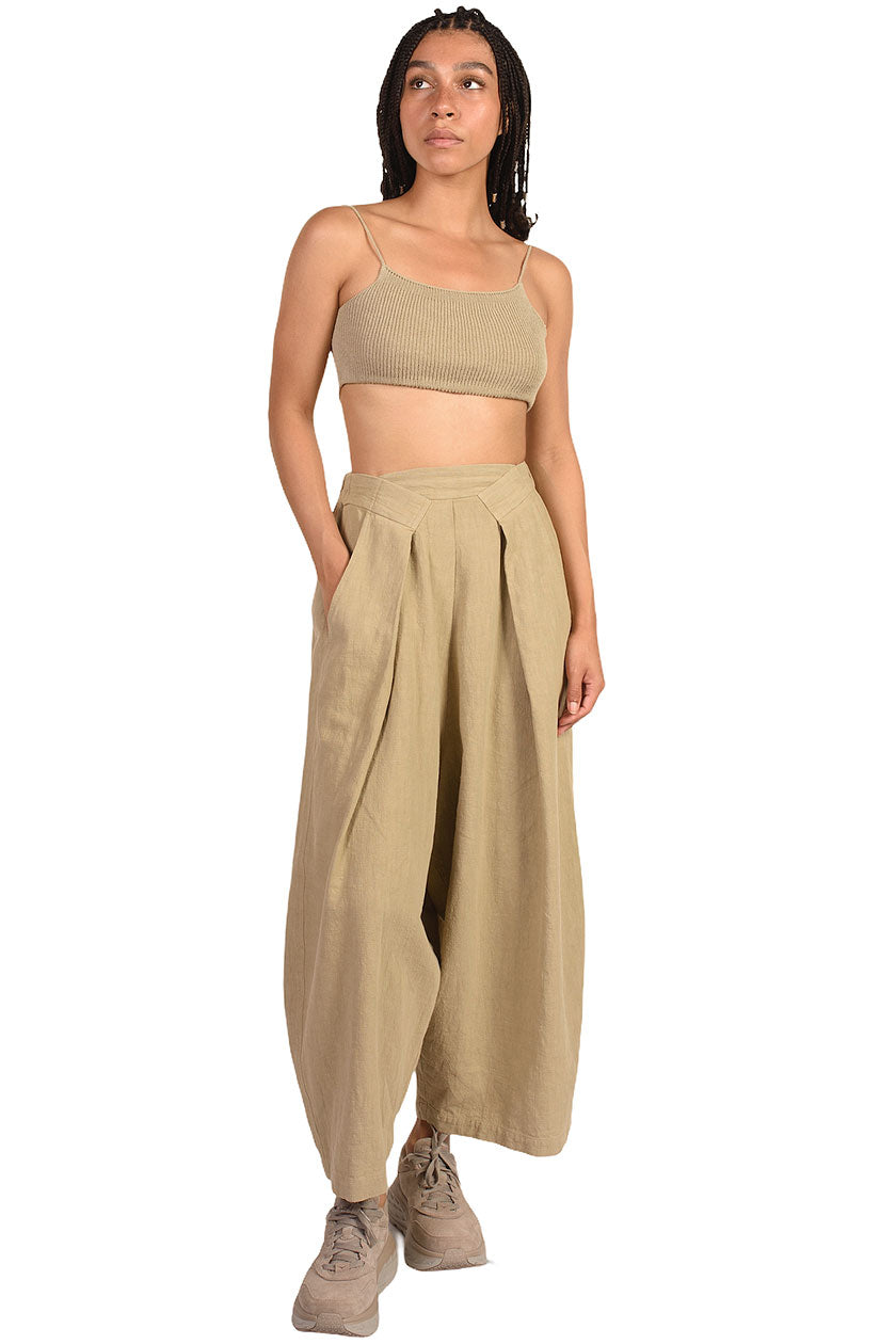 Monica Cordera’s collections are composed of limited edition garments with minimalist designs that seek purity and simplicity, timeless earthy tones in recycled linen and cotton as seen with the Smoked Green Pleat Front Ramie Pants.