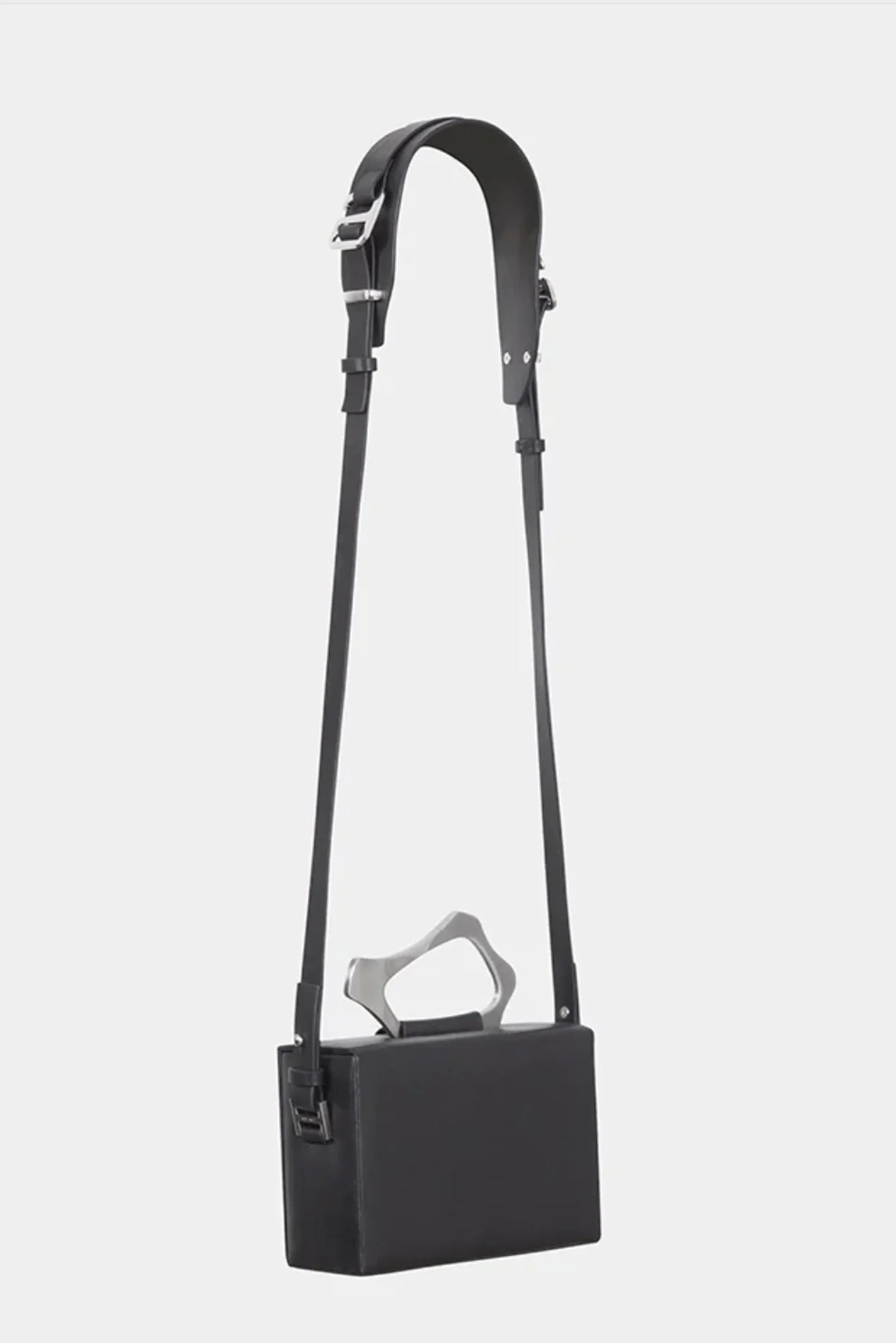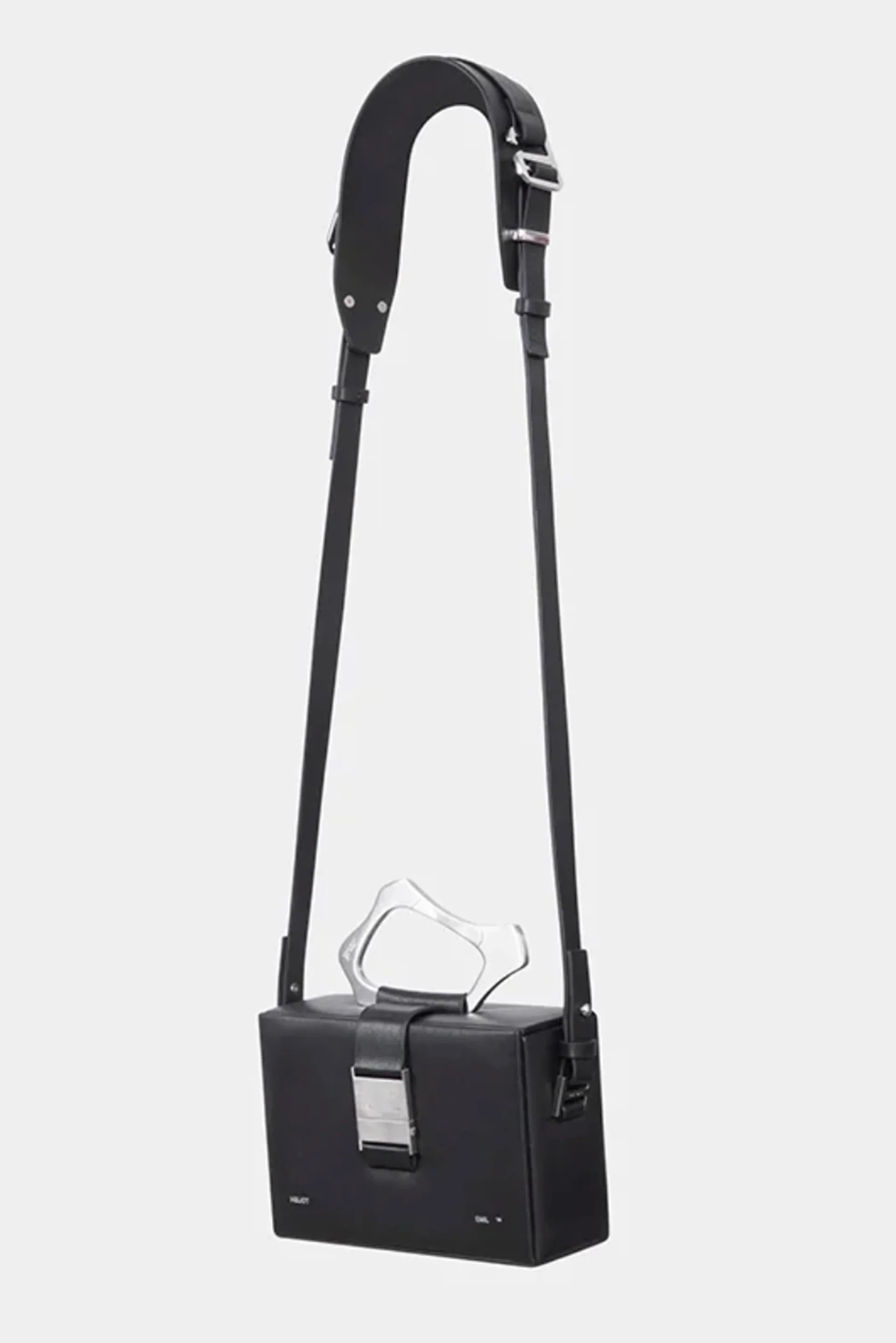 Custom hardware trimmings. Silver HELIOT EMIL TM logo on the front. Metal carabiner top handle and metal snap buckle closure. Rigid box structure with a single compartment.