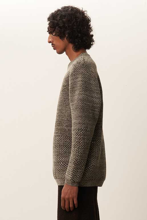 Isa Boulder redefines individuality with artisanal knitwear and ready-to-wear. Based in Bali, the brand working with local artisans and sustainable materials, fuses traditional craftsmanship with experimental design, creating bold pieces that subvert convention and celebrate individuality as seen with the Solid Crochet Crewneck Sweater Moss Grey.
