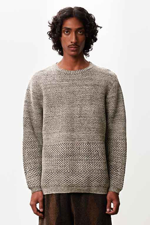 Isa Boulder Solid Crochet Crewneck Sweater Moss Grey. Long sleeves. Round neck. Made from sustainable materials. Ribbed cuffs.