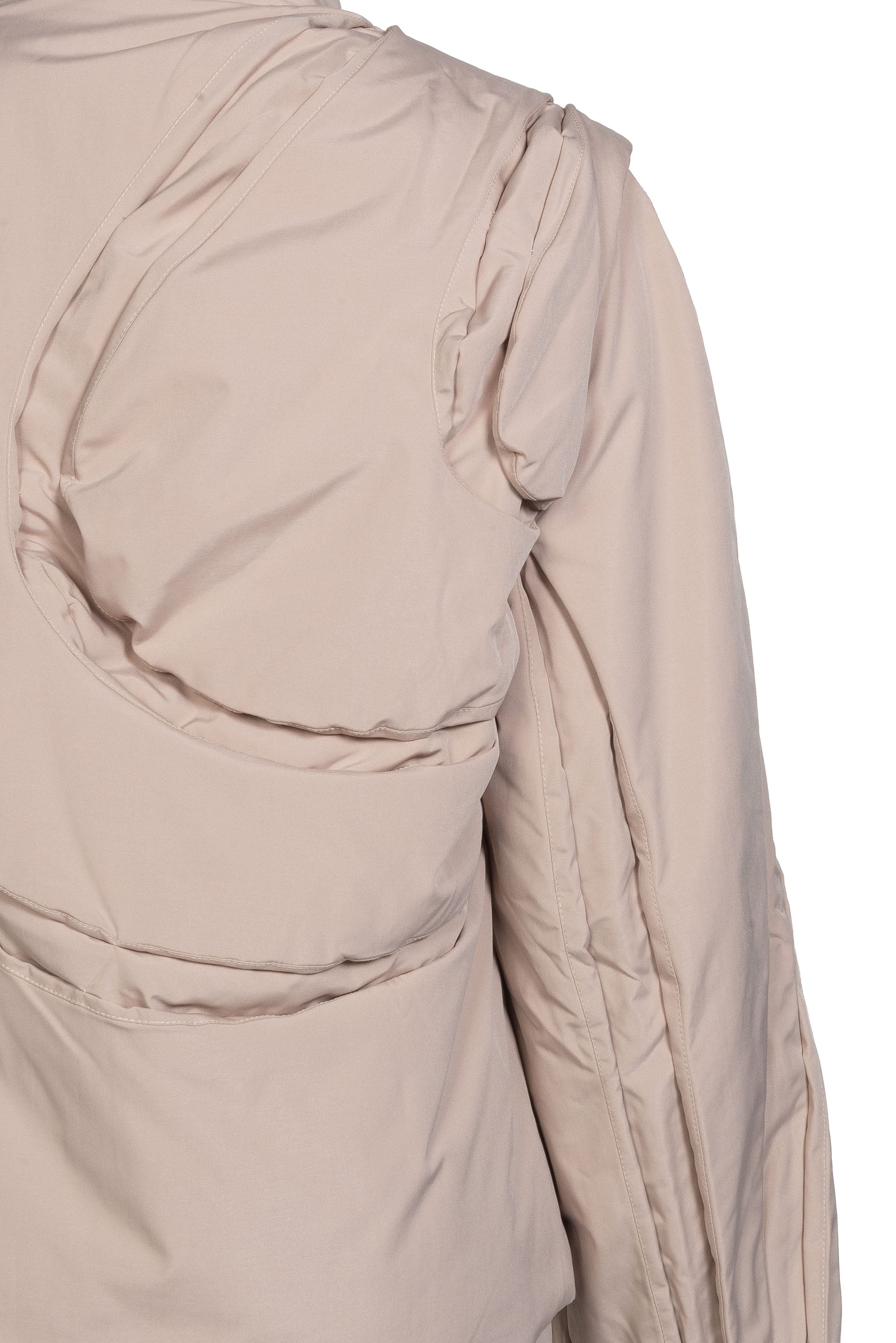 Insulated nylon canvas blazer. Tucks throughout. Panelled construction. Notched lapel. Double-breasted press-stud closure. Welt pockets at waist. Zip at detachable sleeves. Plain-woven cupro lining