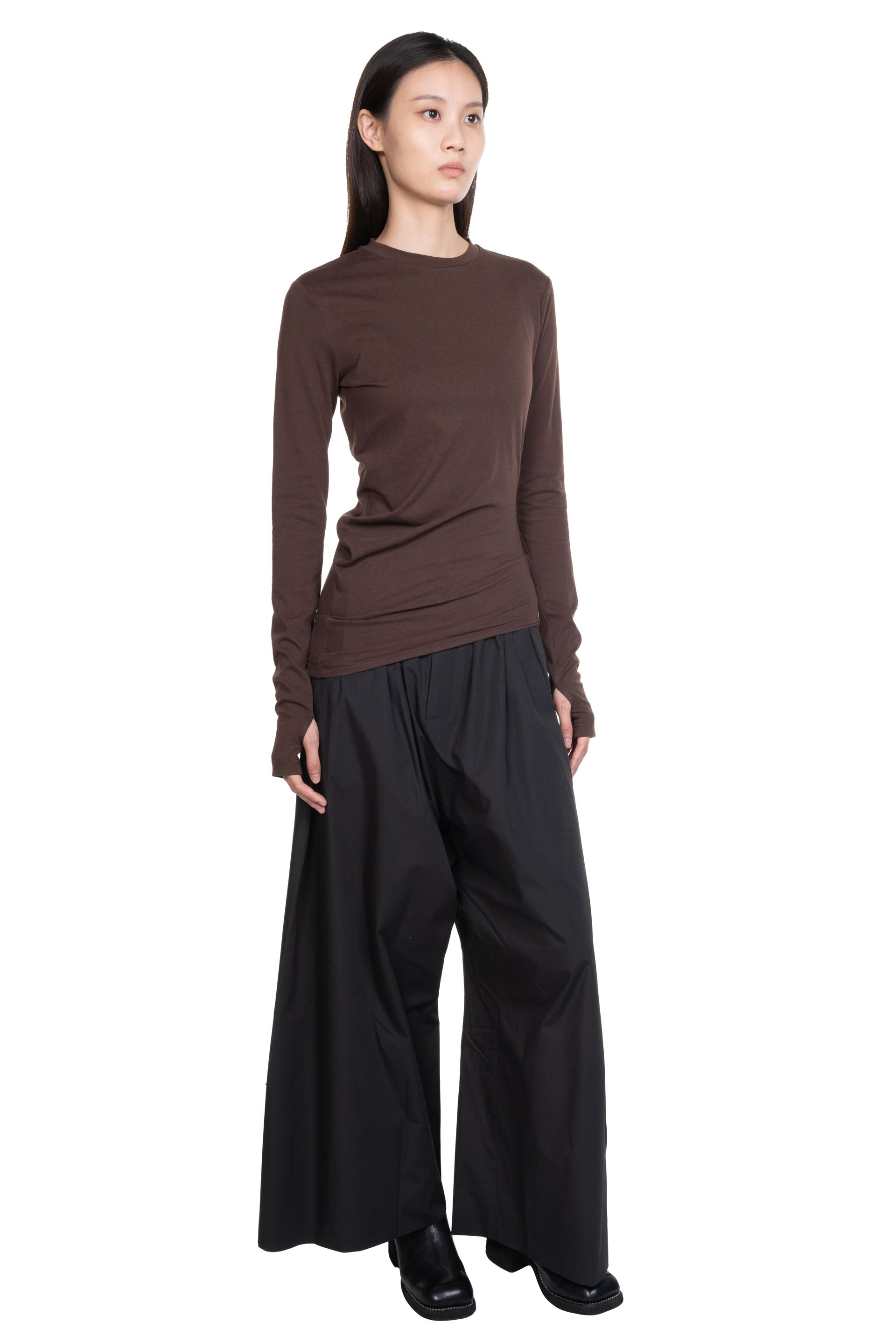 Long sleeves. Round neck. Curved "spiral" design at bottom. Asymmetrical design. Thumb hole at cuff. Soft cotton fabric.