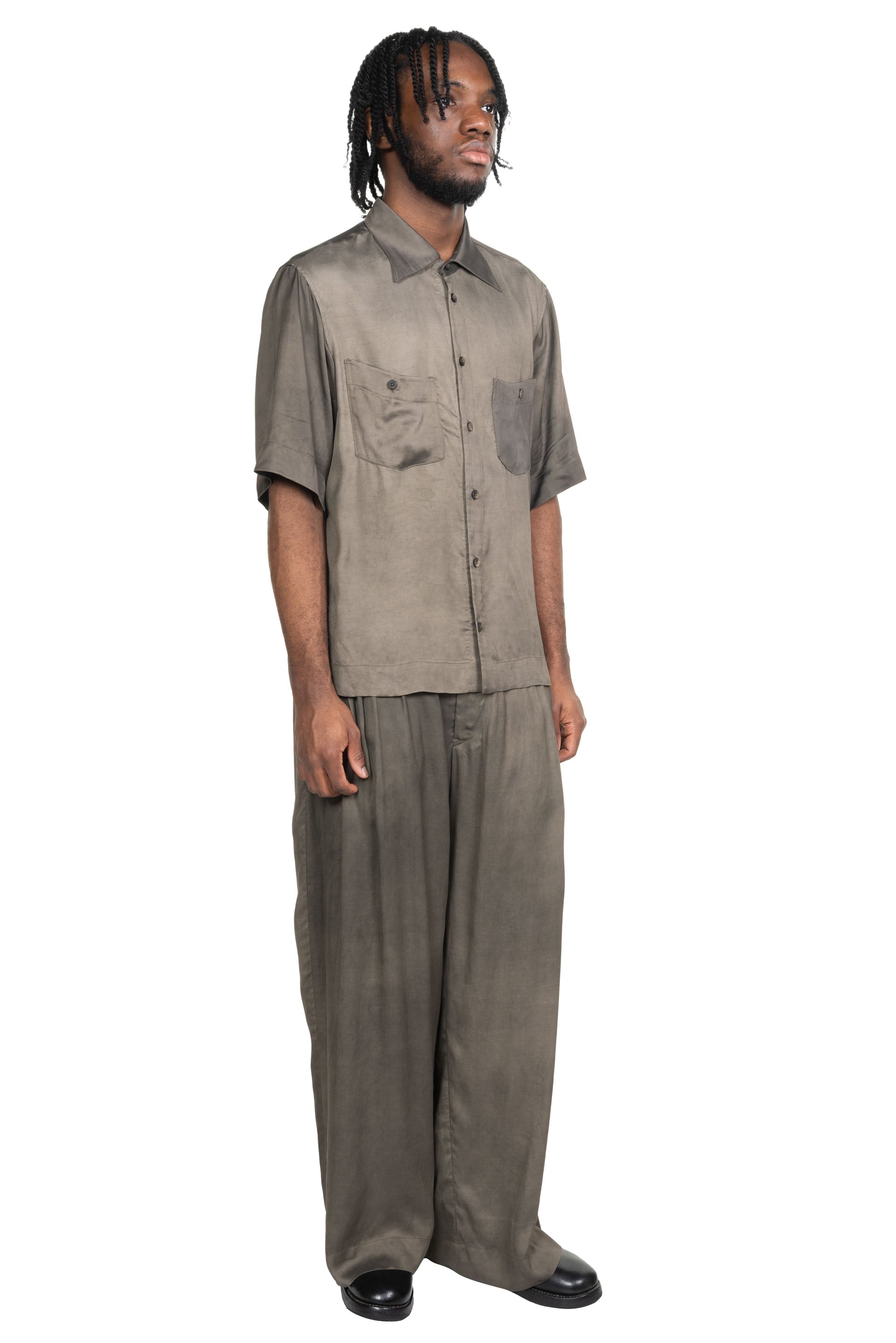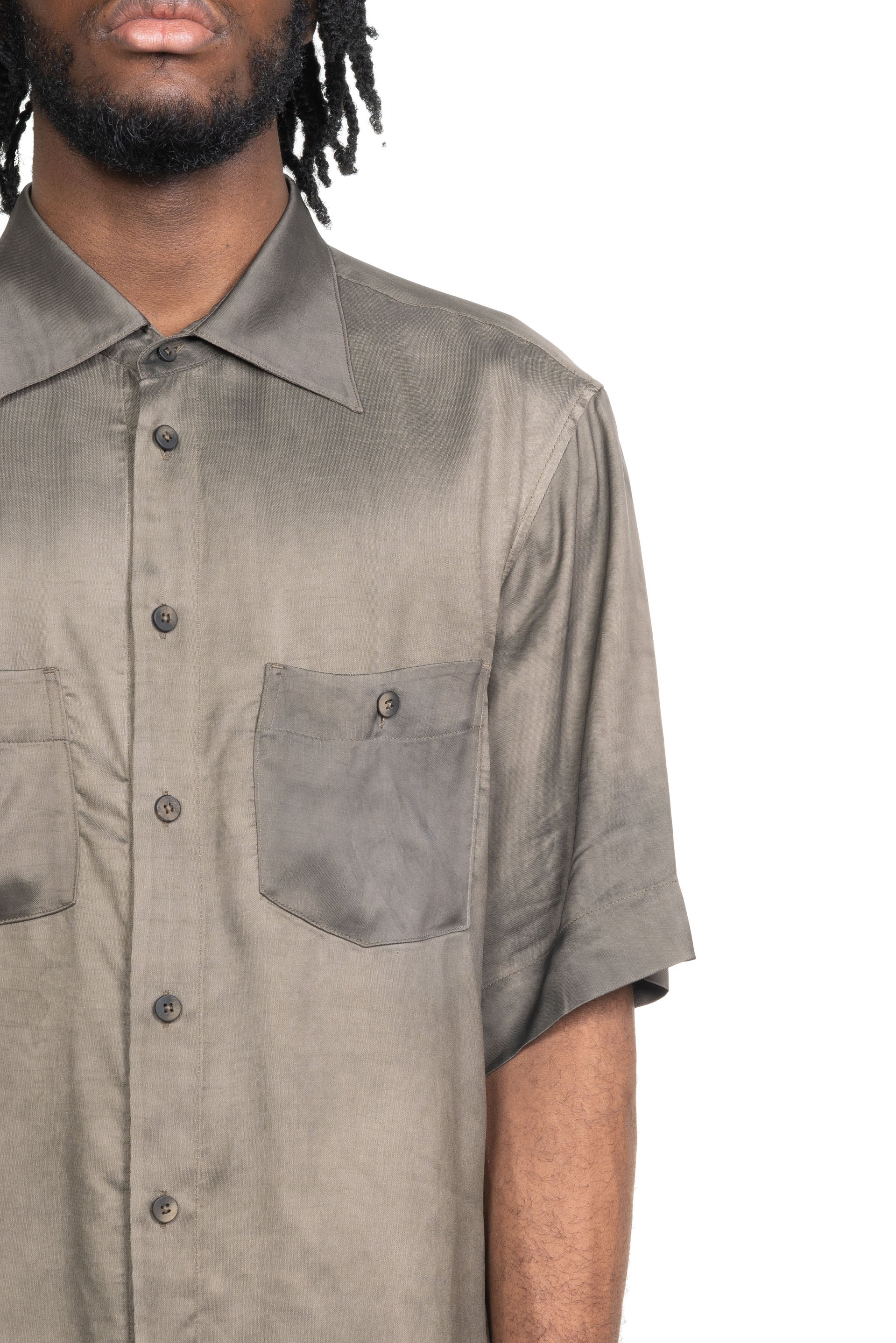 Ziggy Chen Spread Collar Short Sleeve Shirt. Button closure at front. Spread collar shirt. Dropped shoulder. Two front pockets. Boxy fit. Button closure at front. Signature slit at sides. Ziggy Chen seasonal Dye.
