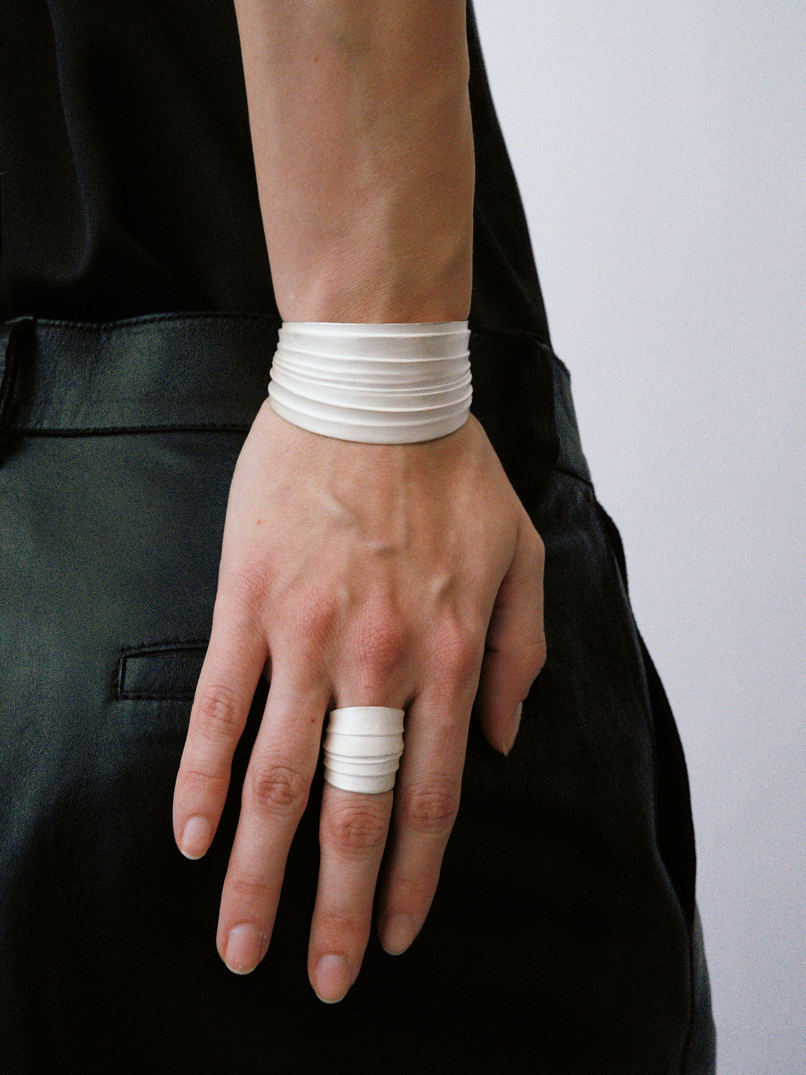 OLIO E ACETO is raw and authentic. It is about the companionship between people, and objects like the matte white surface becoming a blank canvas to be filled by the wearer as seen with the Sterling Silver Carved Ring.
