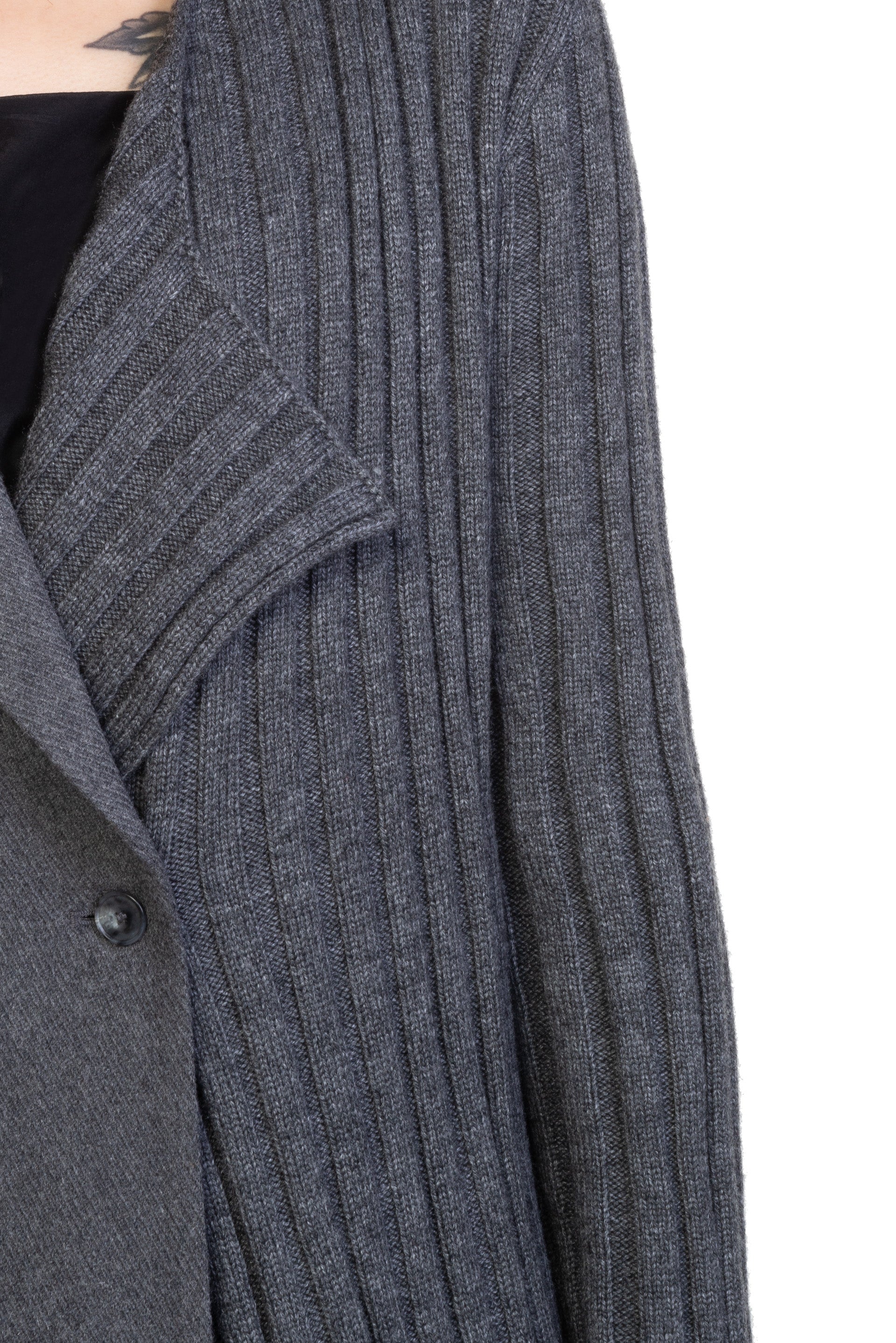 Long sleeves. Button closure at front. Two side pockets. Cut out detailing. Contrast fabric.