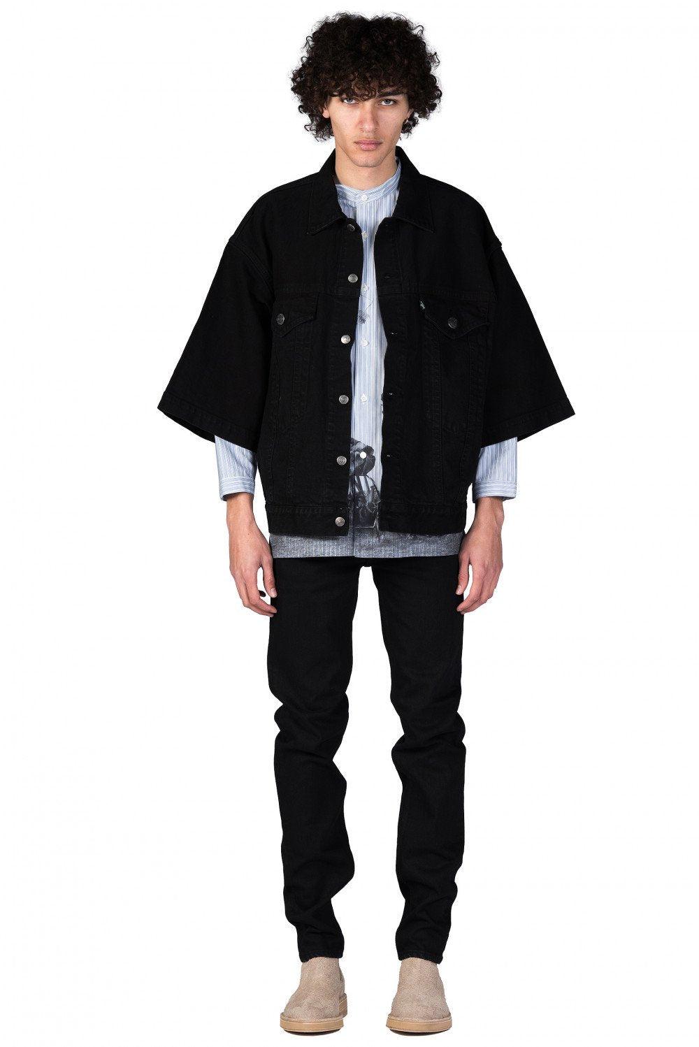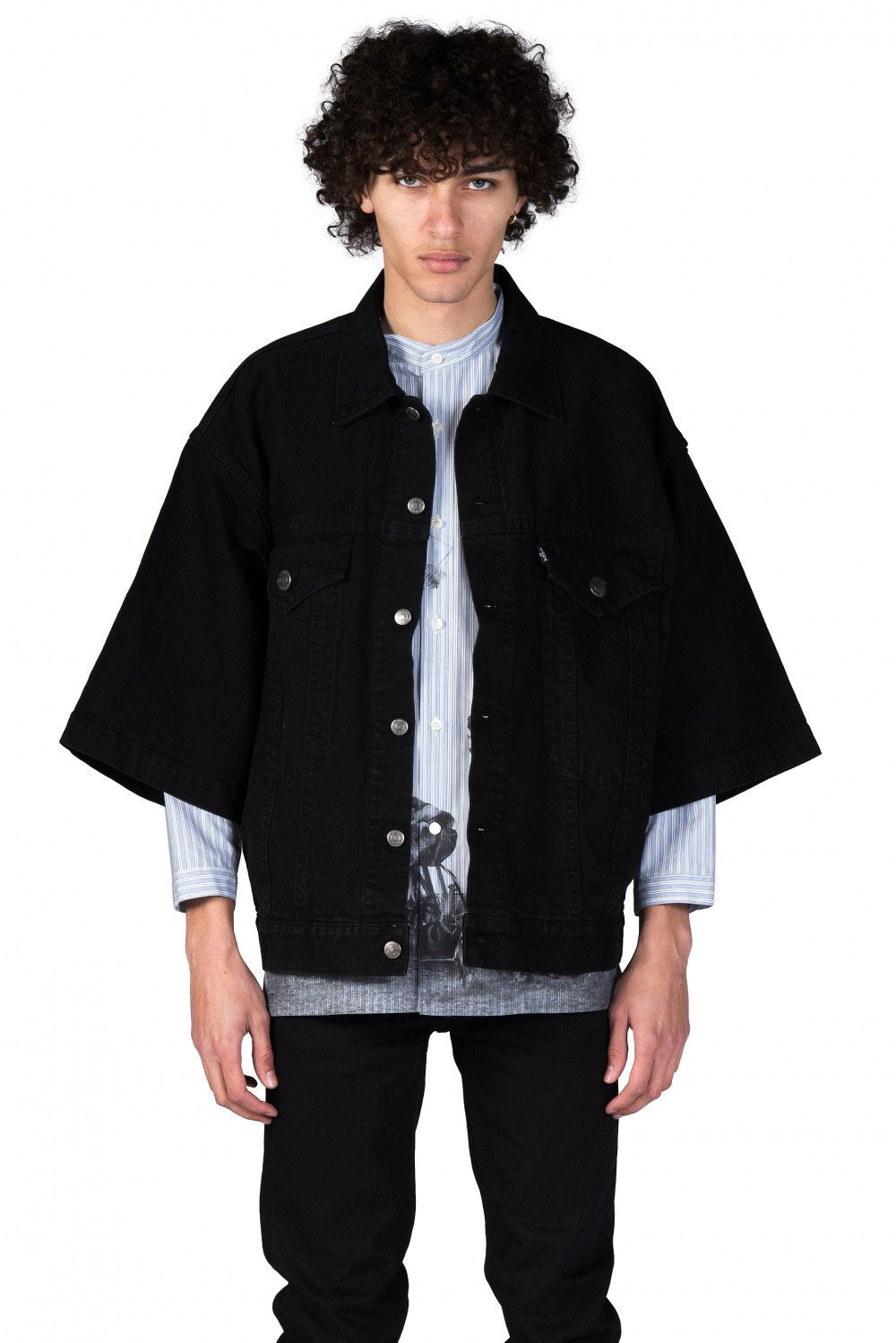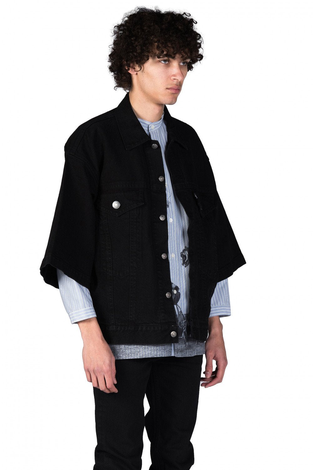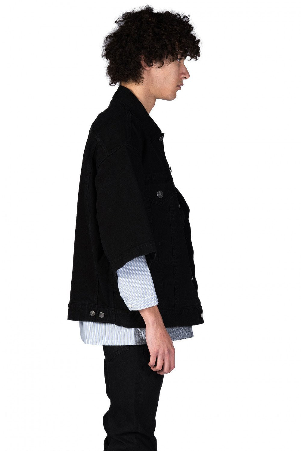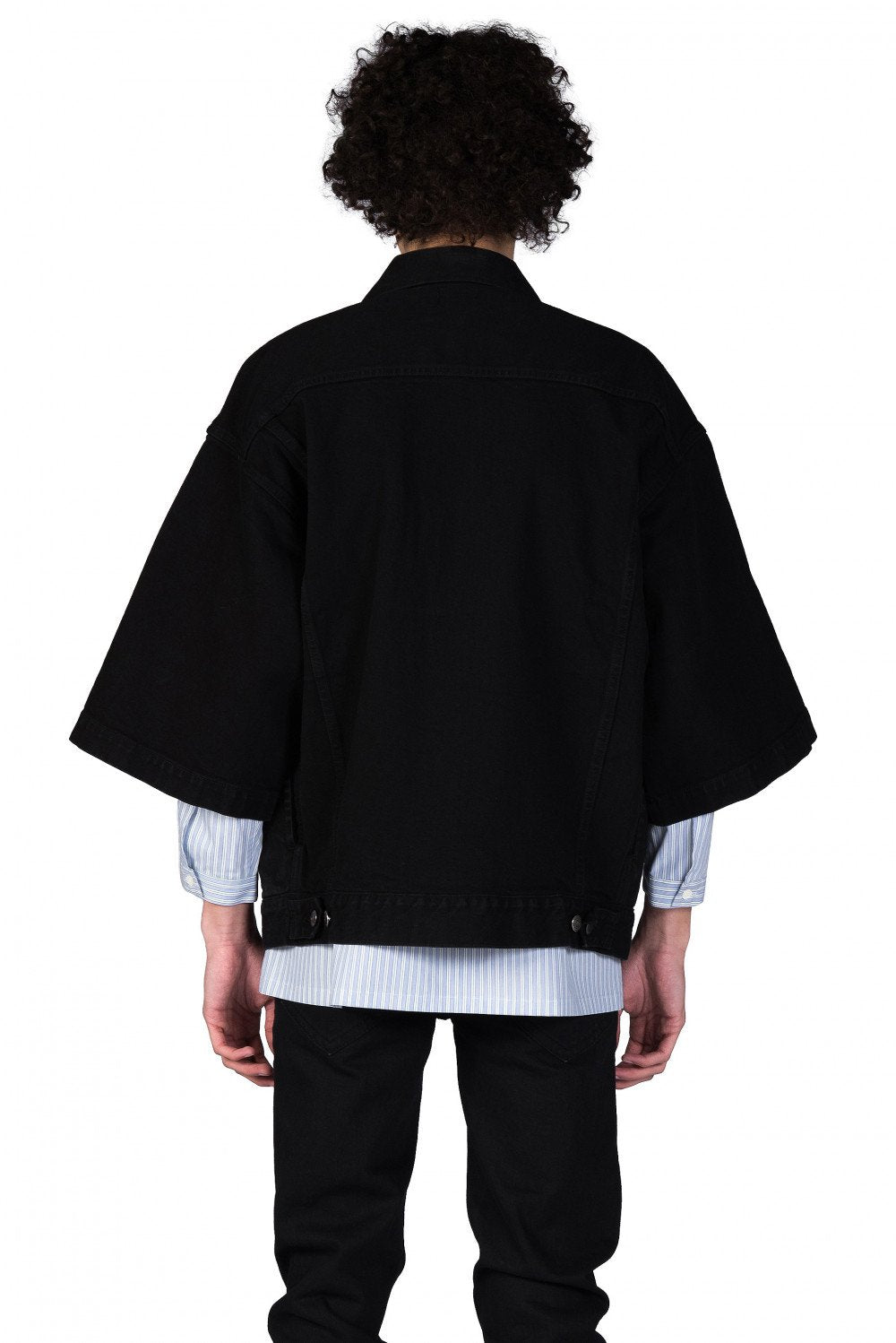 Deconstructed urban style with a rebellious attitude defines the Christian Dada collection at UJNG. The range features streetwear looks with offbeat details and contrasting textures such as the Black Denim Jacket.