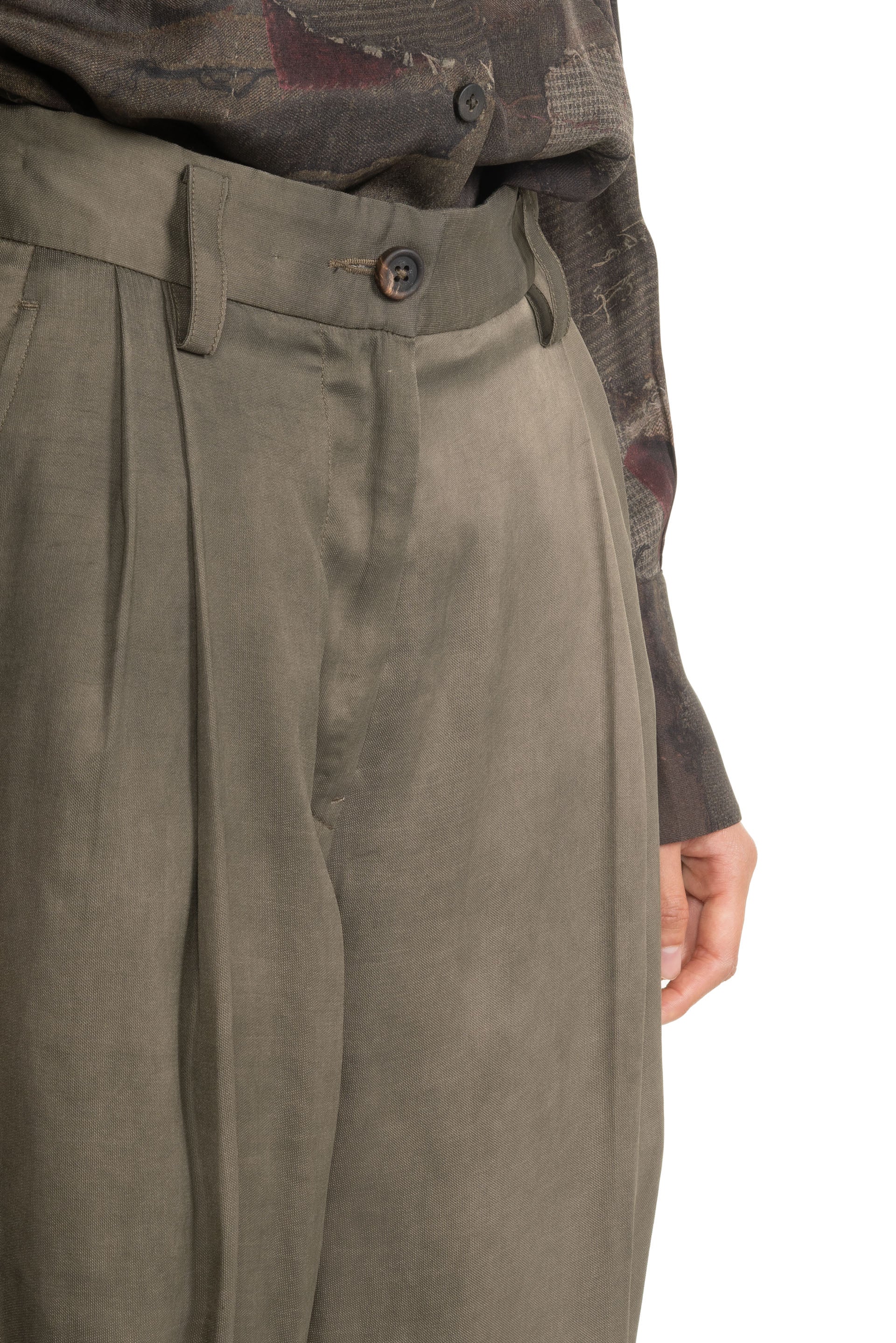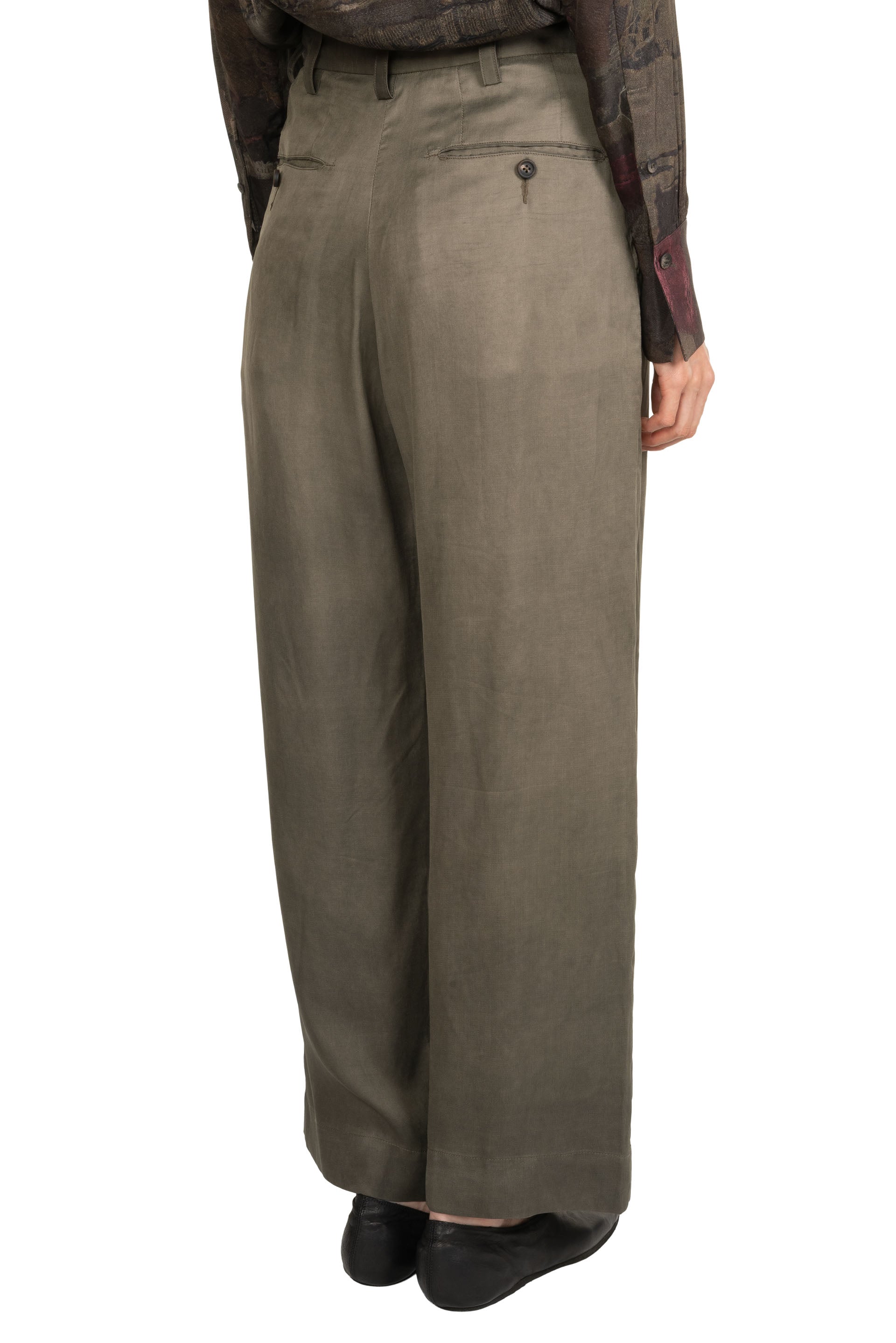 With a color palette of purples, greens, and greys, Ziggy Chen’s designs evoke the textures of aged architecture and the natural world. The garments feel as natural as they look, combining softness with structure. Seamlessly blending Eastern and Western influences, Gnartricate captures the essence of timeless beauty, from fluid silhouettes to intricate patterns. Ziggy Chen continues to redefine the intersection of tradition and modernity in fashion as seen with the Straight Leg Green Trousers.
