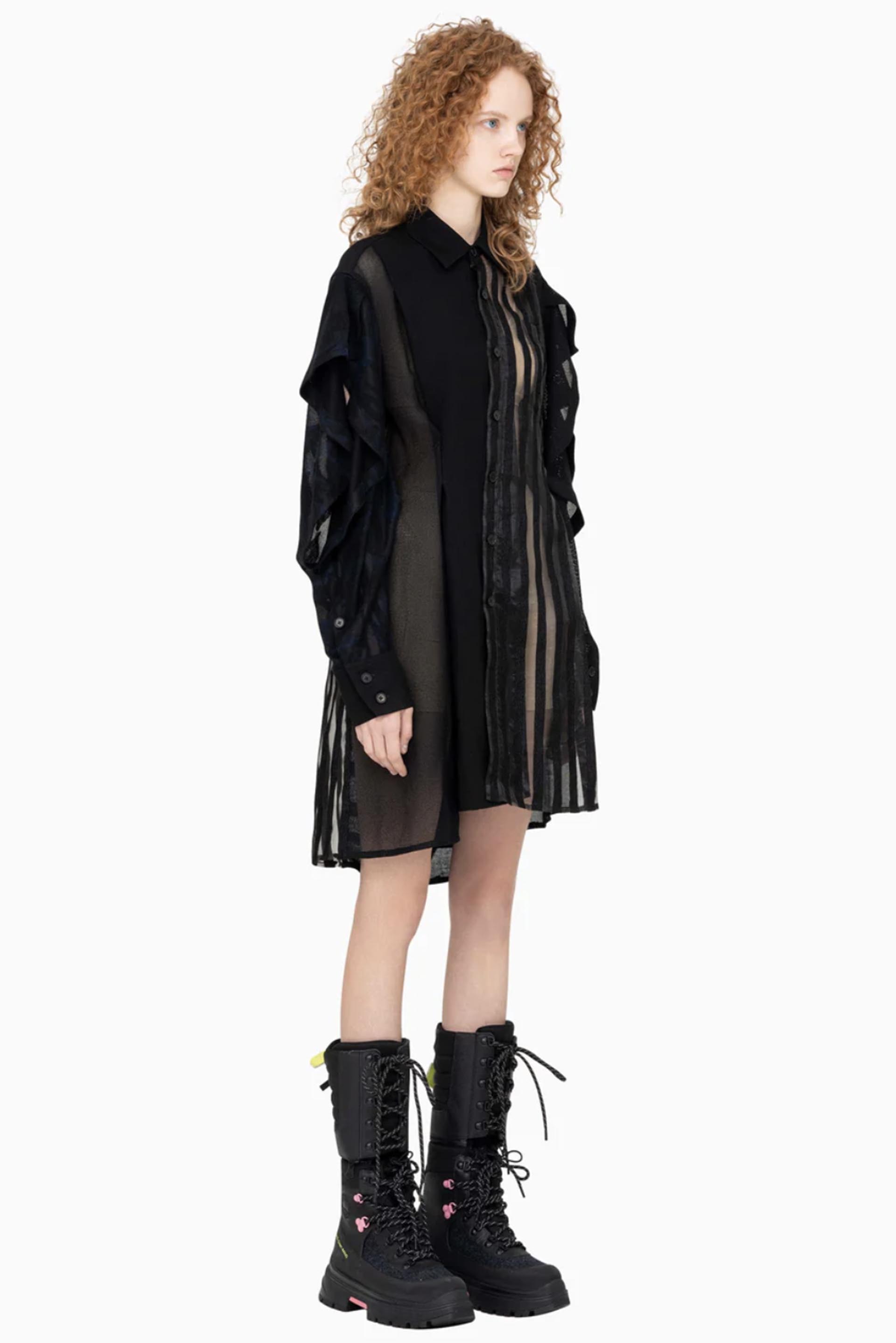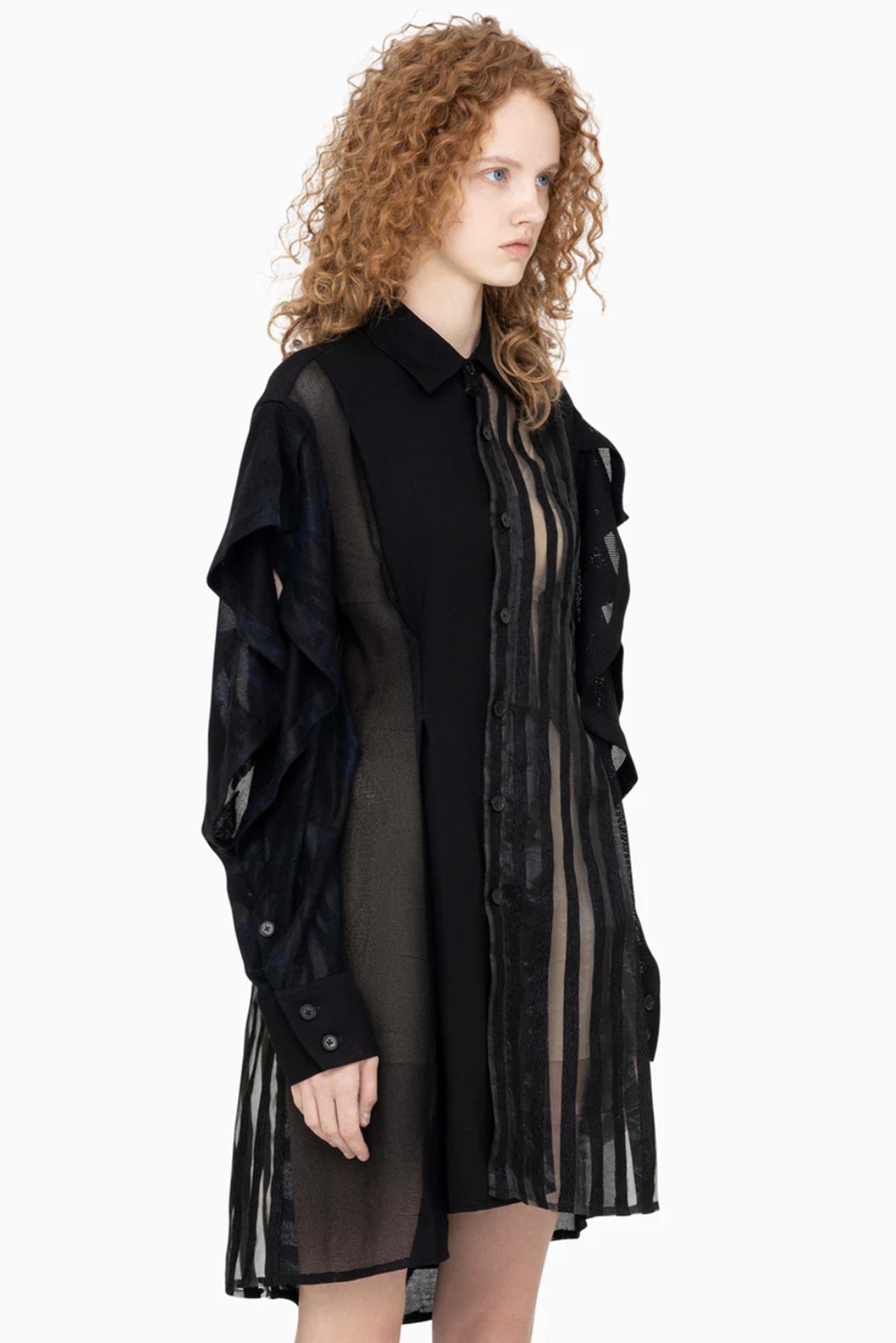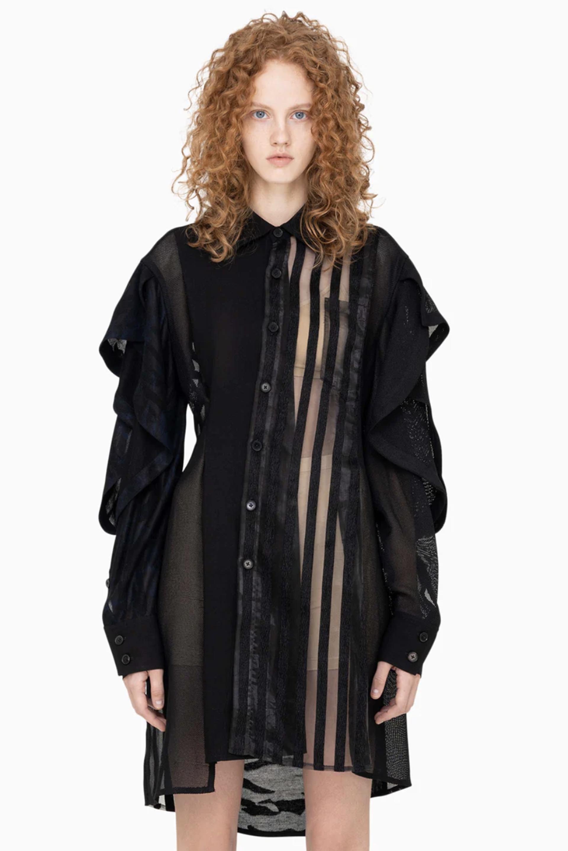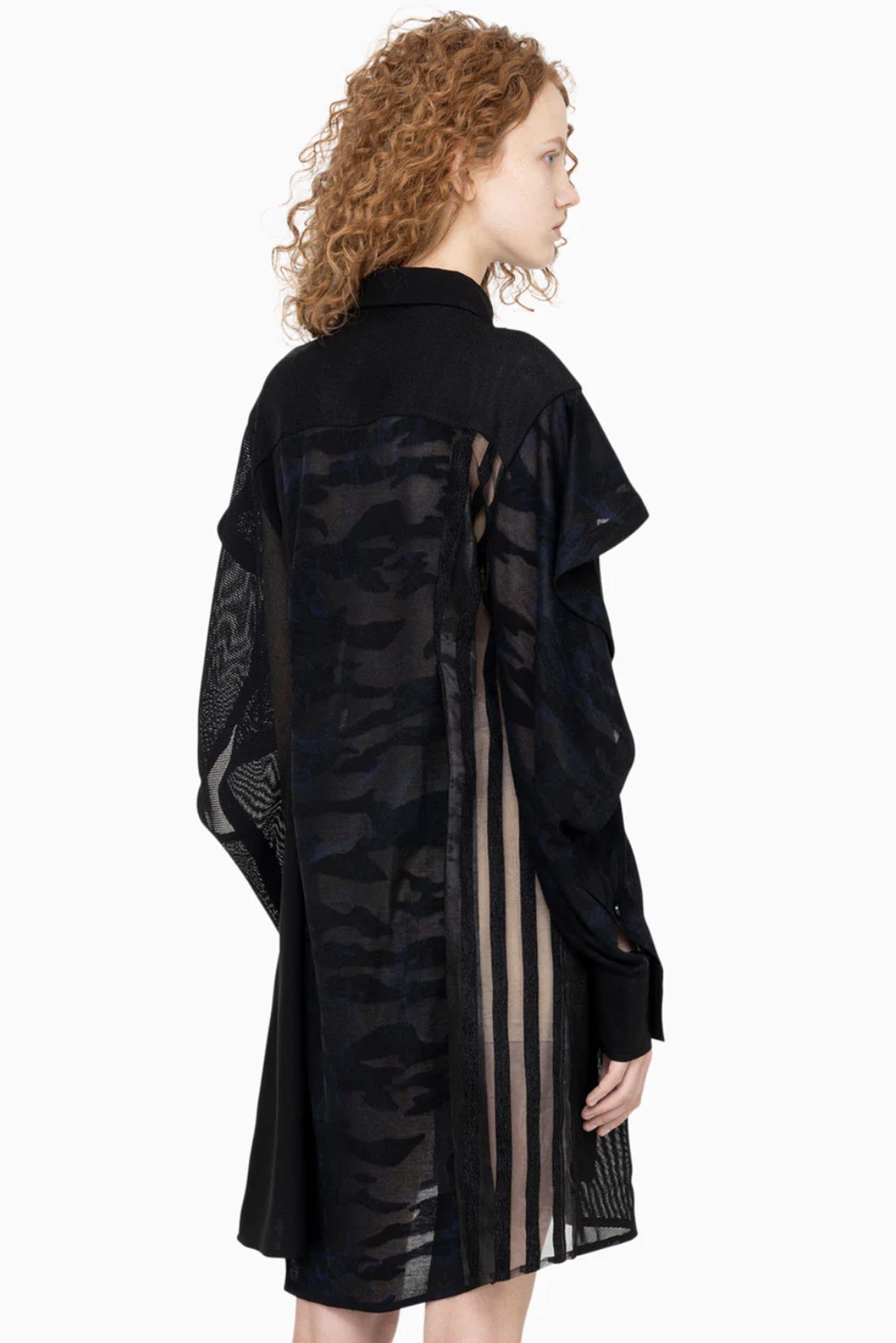 Deconstructed and layered patchwork shirt-dress. Made in black sheer. Feature stripes and camouflage patterns. Volumetric wavy sleeves. Buttoned closure to the front and an asymmetrical hem.