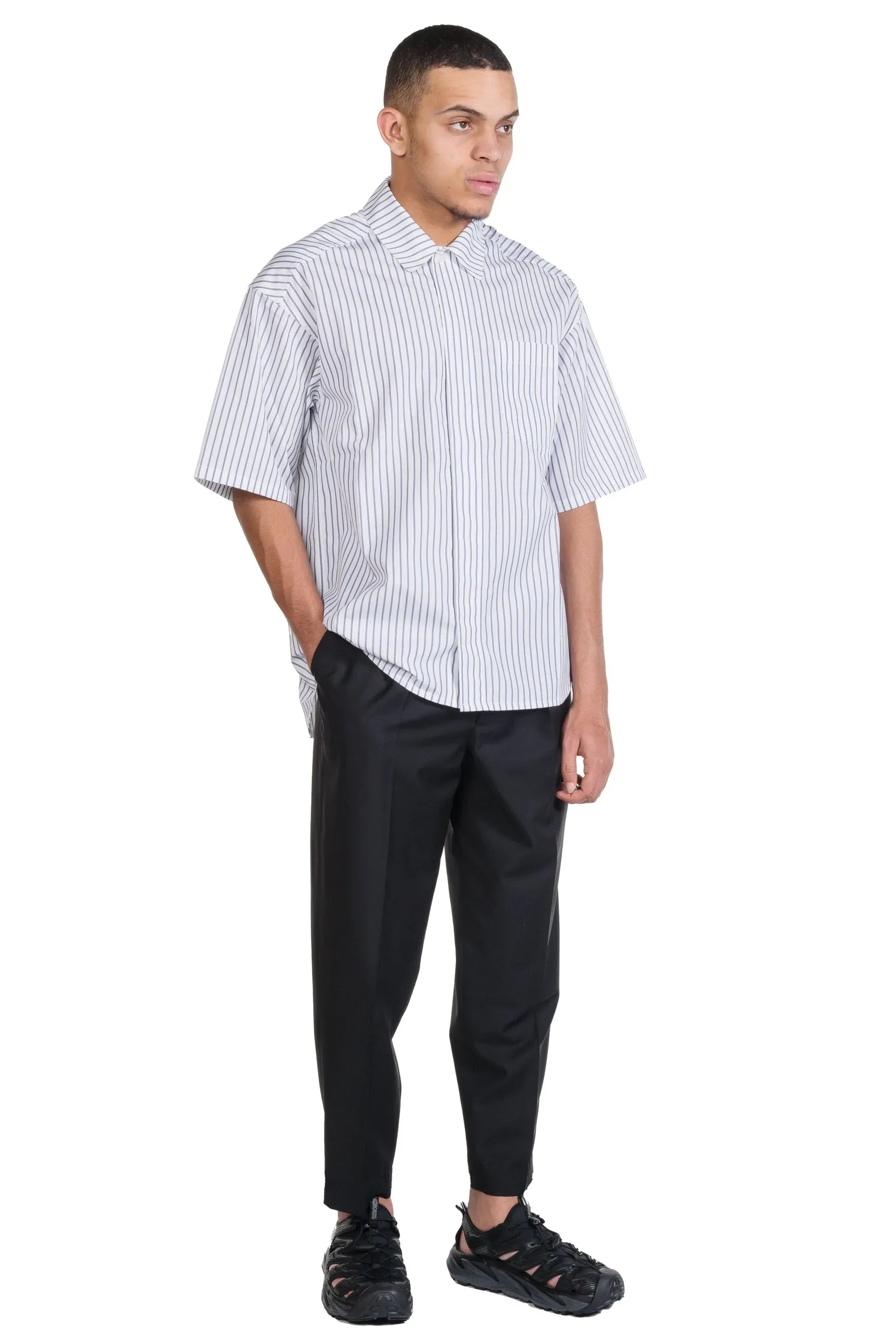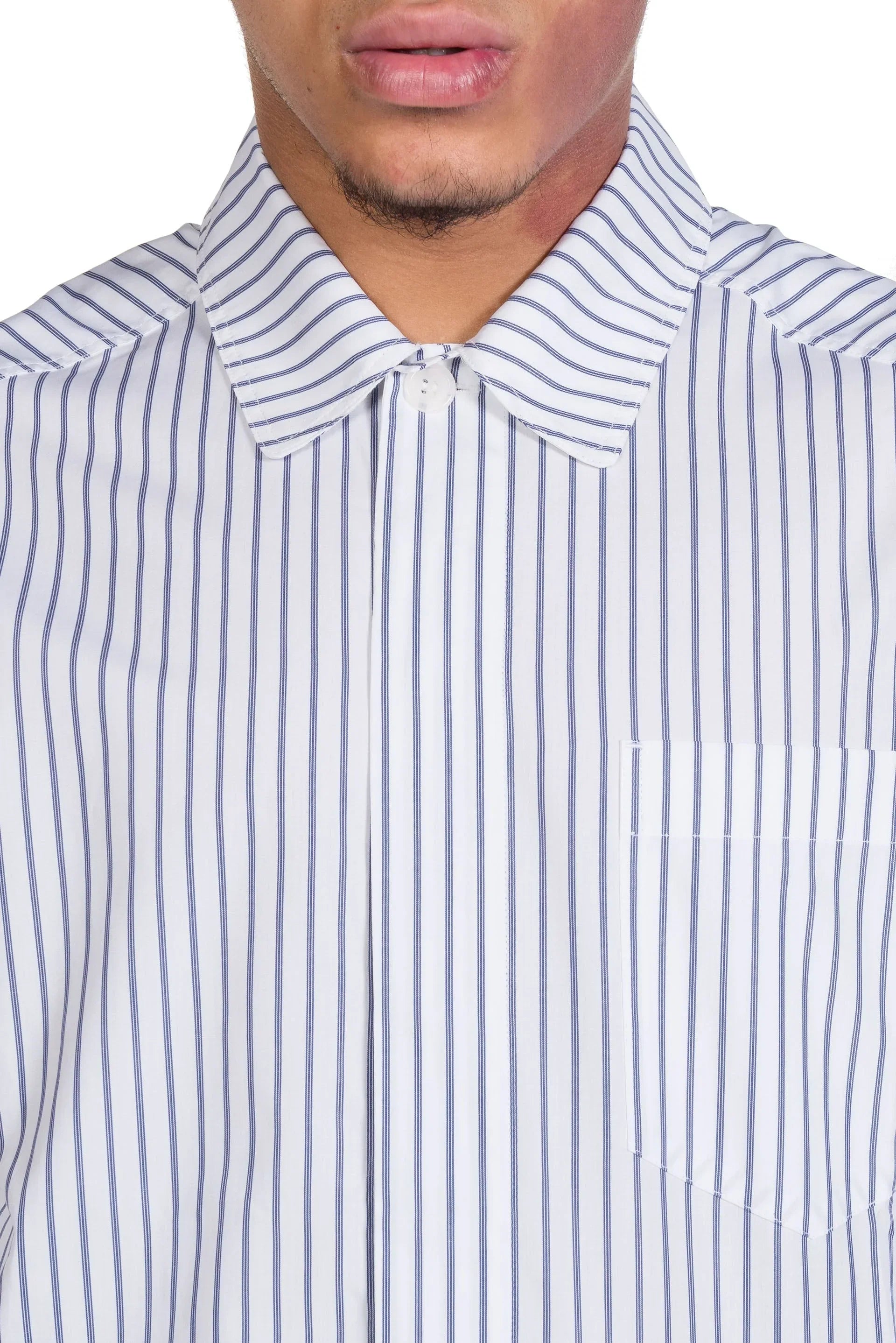 Stripe Short Sleeve Shirt. Horn buttons. Front pockets. Relaxed fit. Dropped shoulders. Colour: White/Blue. Composition: Cotton