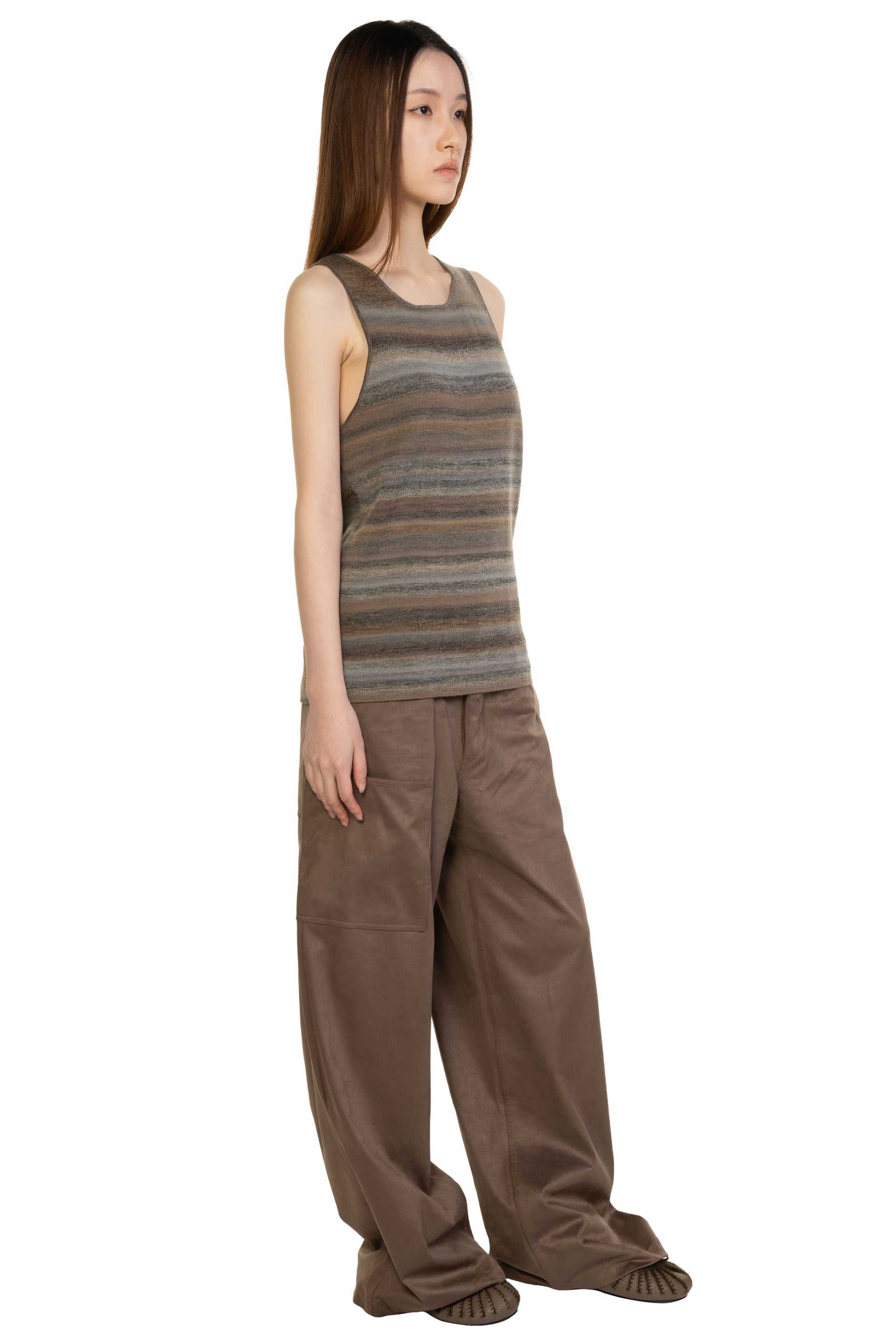 Swaying redefines modern knitwear by fusing artisanal craftsmanship with contemporary design. Through innovative textures, intricate yarn play, and hybrid weaving techniques, each piece balances softness and strength. Sourcing premium European and Japanese materials, Swaying/Knit ensures a luxurious hand feel while embracing sustainable fashion. With delicate details and timeless sophistication, the brand delivers elevated, wearable art for the discerning, fashion-forward wardrobe as seen with the Striped Wool Vest Grey Brown.