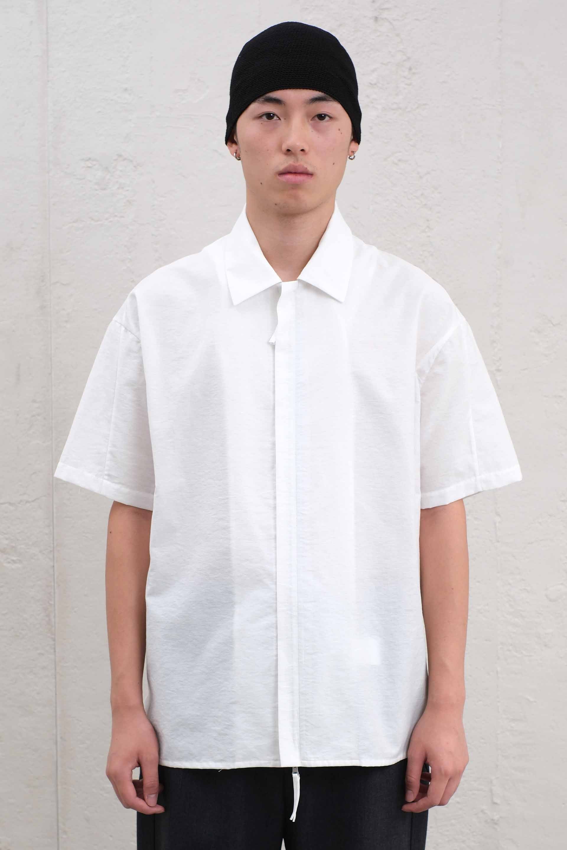 Attempt Structured Short Sleeve Shirt White. Short sleeves. Double zip closure at front. Soft paper like technical fabric. Boxy cut. Slits at side.