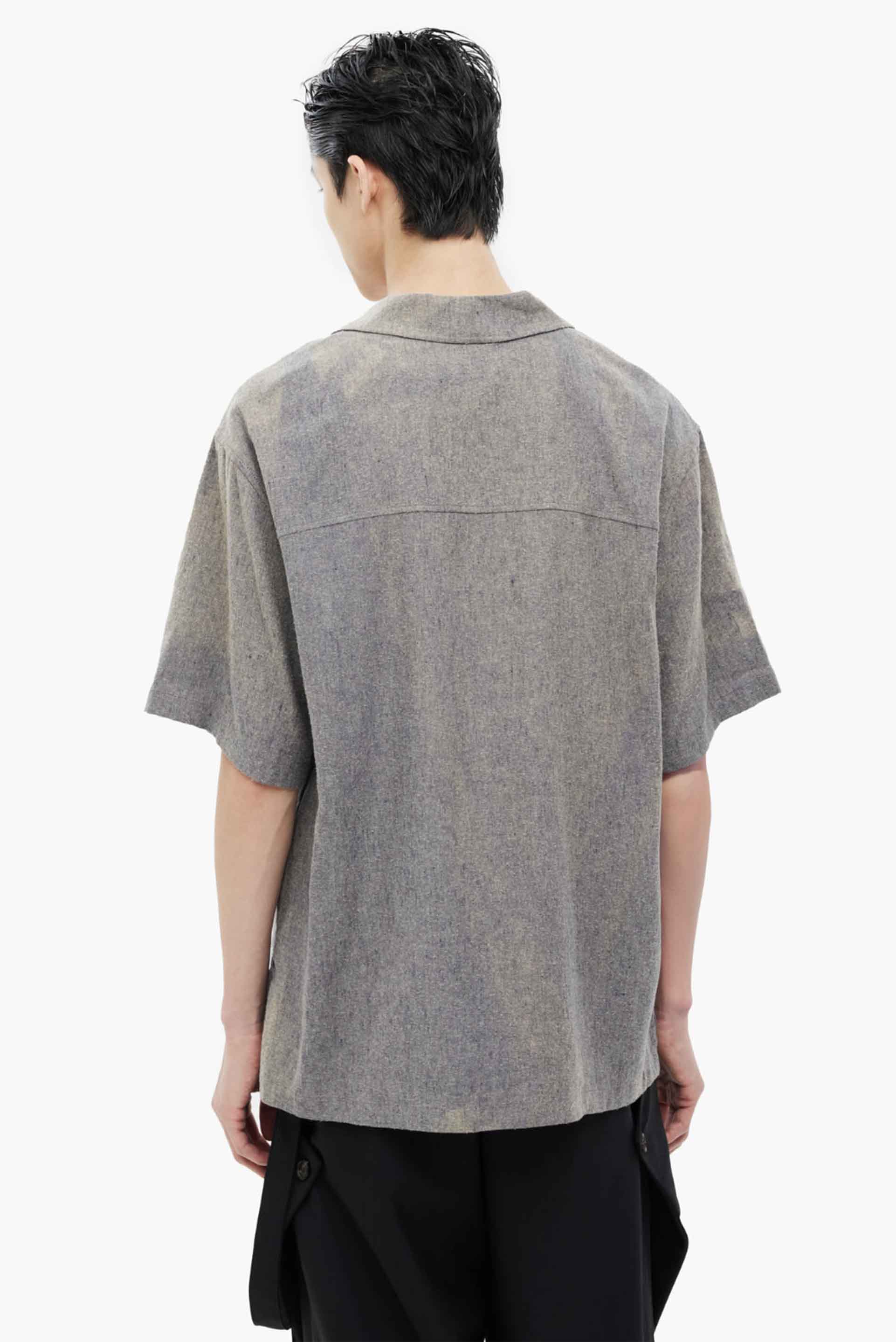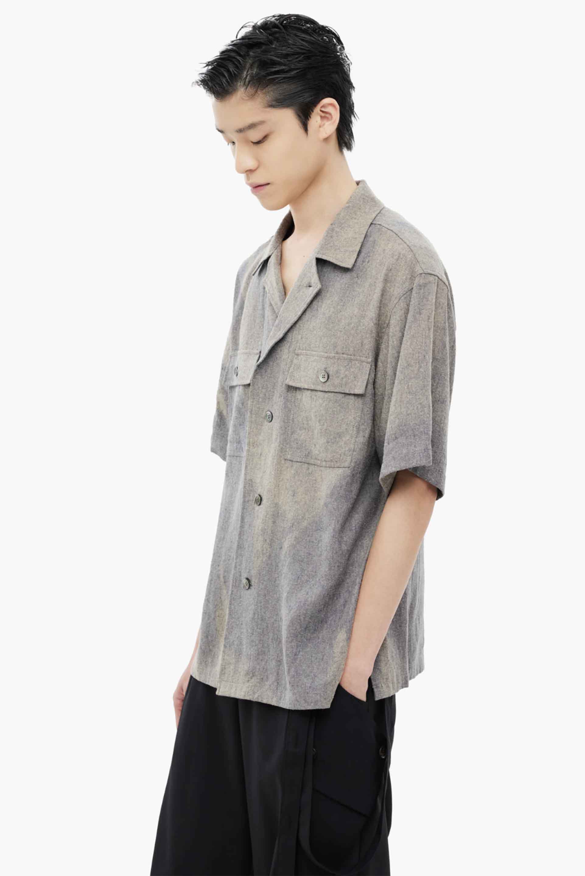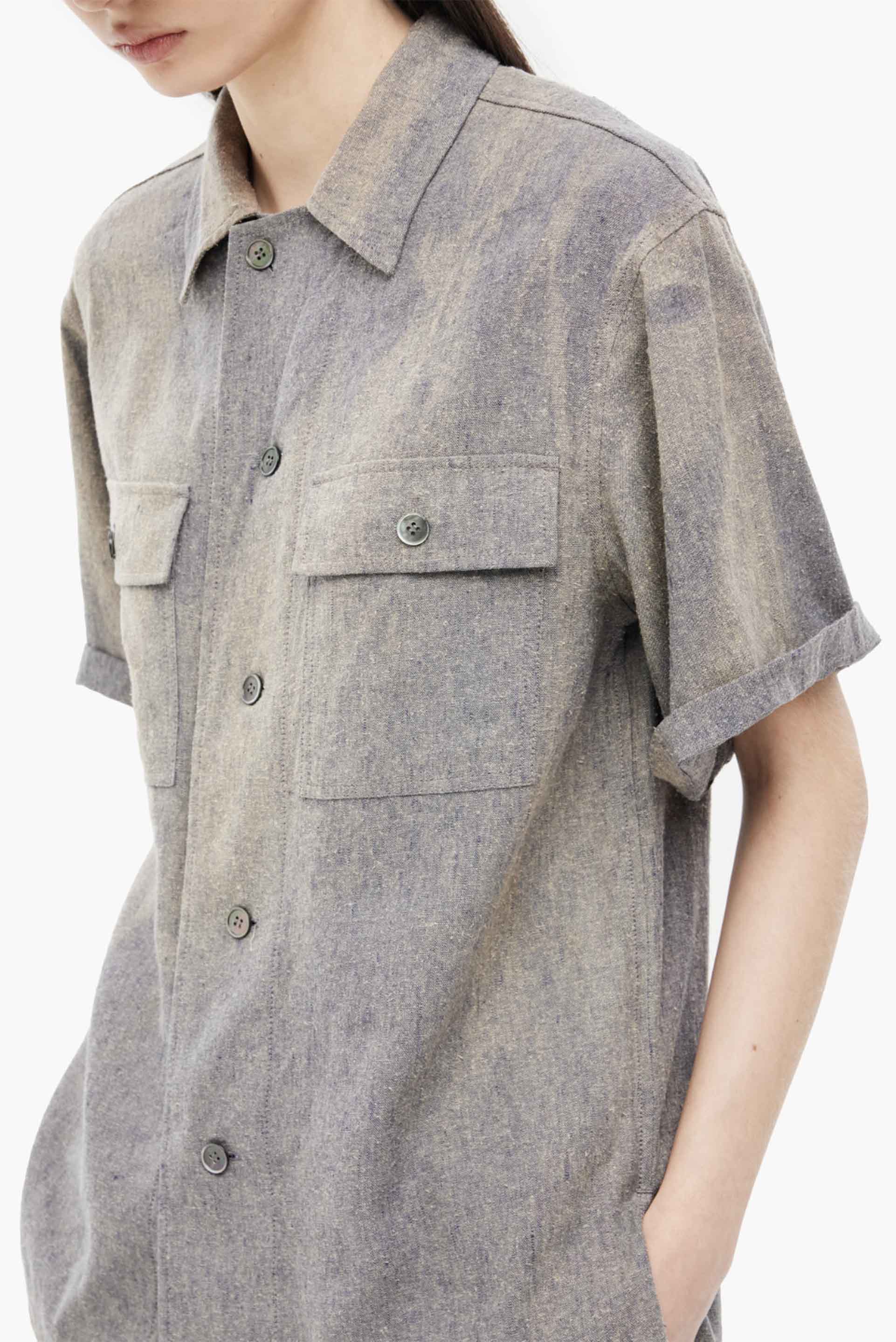 A short-sleeve shirt with a tailored collar, defined by distinctive Sun-Bleach patterning and silk-linen texture. This item has been Sun-Bleached and carries a unique imprint of nature and time. Each item features individual irregularities for a one-of-a-kind finish. Relaxed fit. Shell buttons at front and cuffs. Relaxed fit. YKK® canton buttons at front and cuffs. Cinch-back detail at rear. Side pockets on both sides. Left chest pocket.