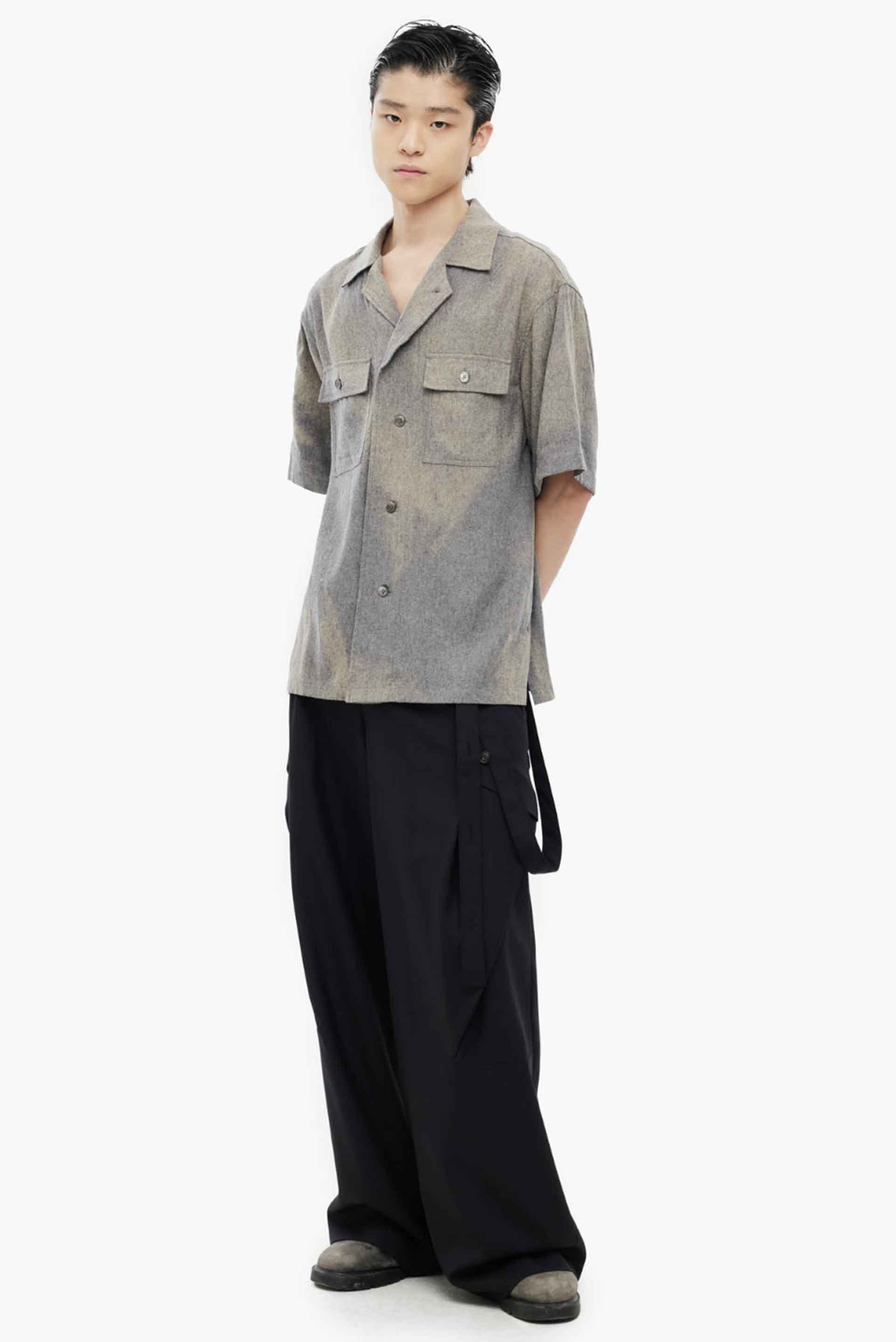 JiyongKim’s signature sun-faded effect is developed over months of natural exposure to sunlight, rain, and wind—creating one-of-a-kind patterns without chemical dyes or water waste. Vintage textiles and hardware are reimagined into relaxed, draped silhouettes in earthy tones, reflecting the brand’s commitment to sustainability and innovation. Rooted in slow fashion, JiyongKim celebrates nature with dynamic, eco-conscious designs that elevate the beauty of mindful craftsmanship as seen with the Sun Bleached Tailored Collar Shirt Grey.