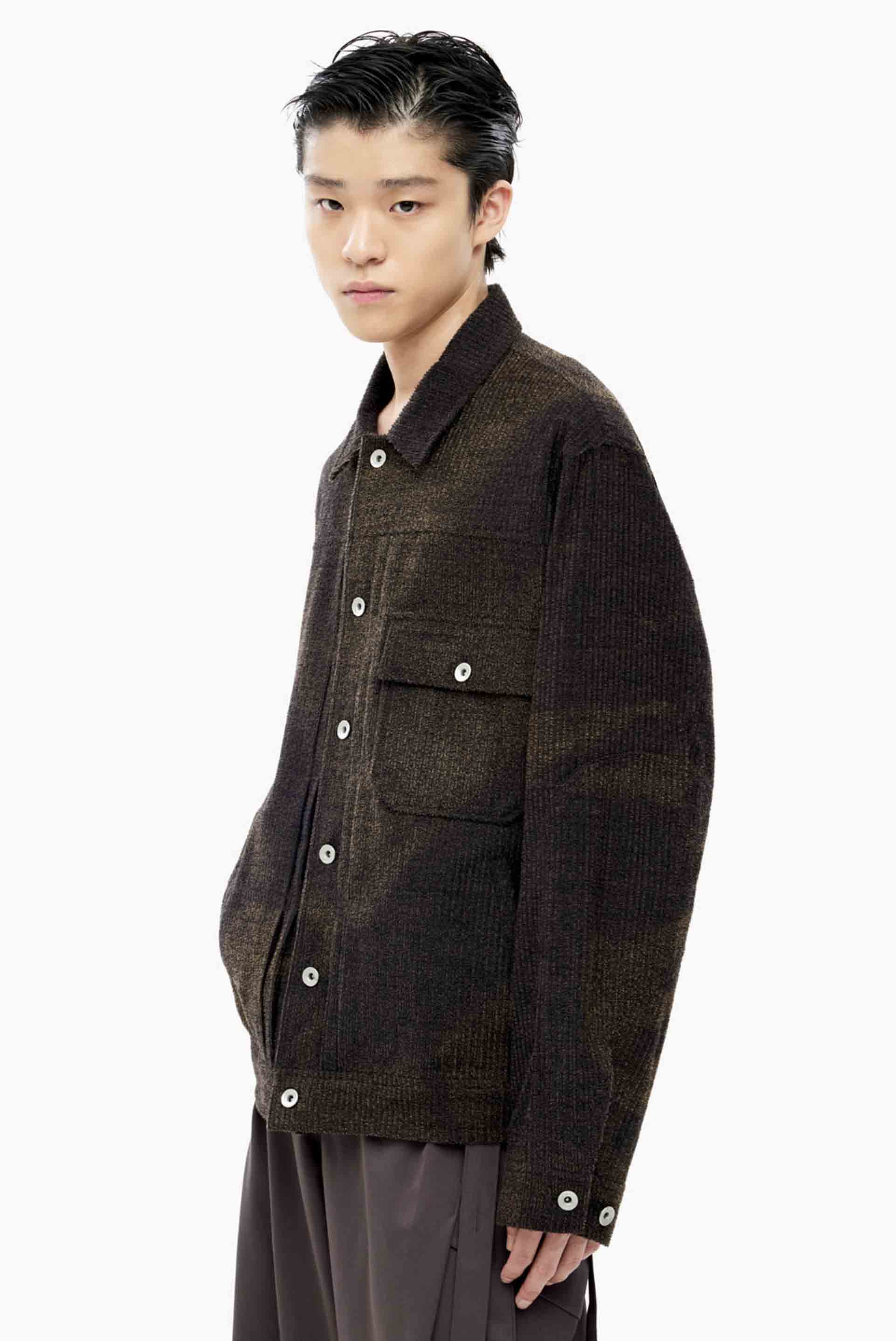 JiyongKim’s signature sun-faded effect is developed over months of natural exposure to sunlight, rain, and wind—creating one-of-a-kind patterns without chemical dyes or water waste. Vintage textiles and hardware are reimagined into relaxed, draped silhouettes in earthy tones, reflecting the brand’s commitment to sustainability and innovation. Rooted in slow fashion, JiyongKim celebrates nature with dynamic, eco-conscious designs that elevate the beauty of mindful craftsmanship as seen with the Sun Bleached Trucker Jacket Brown