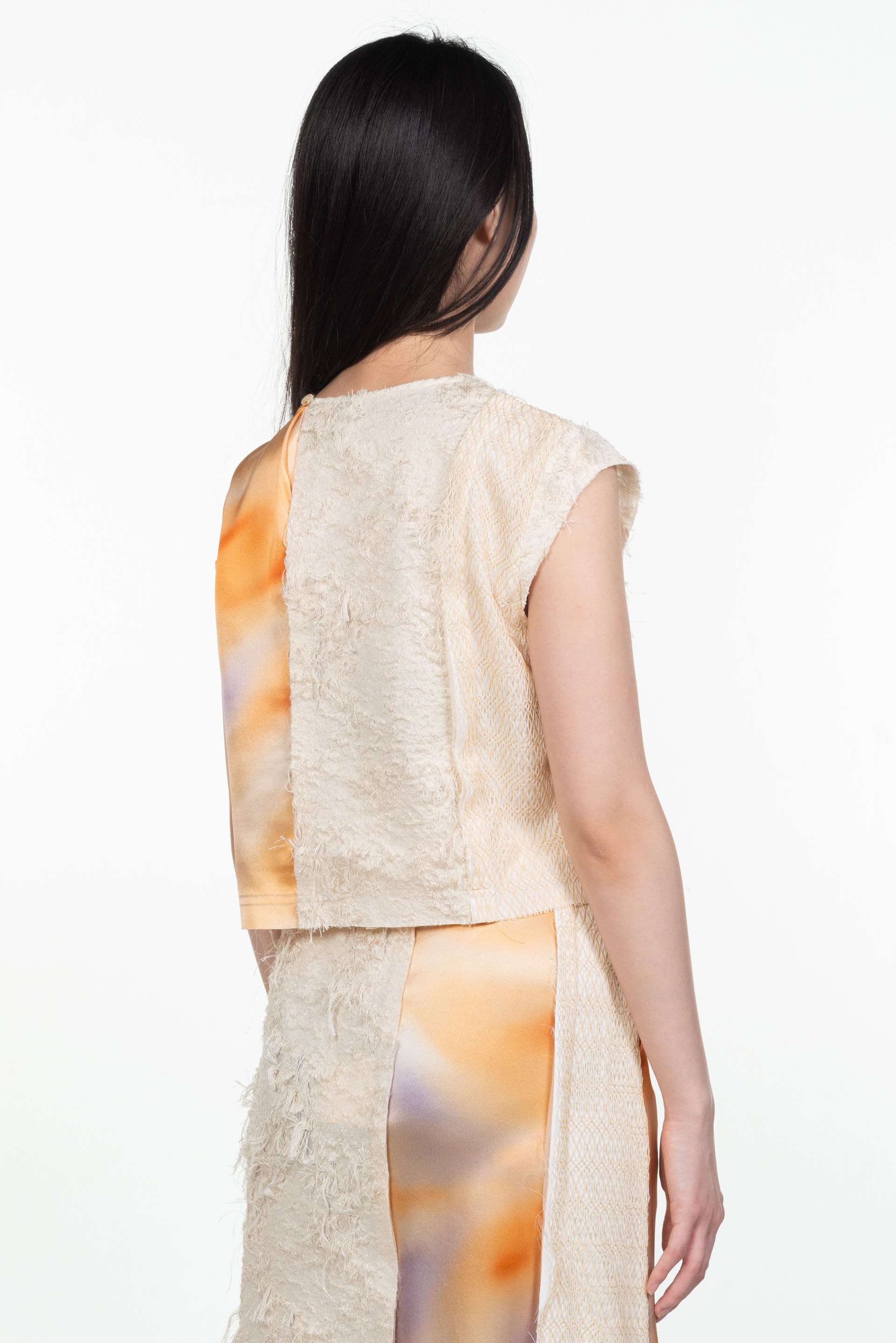 Button closure at back. Cut out detailing. Contrast fabric. Raw edges.