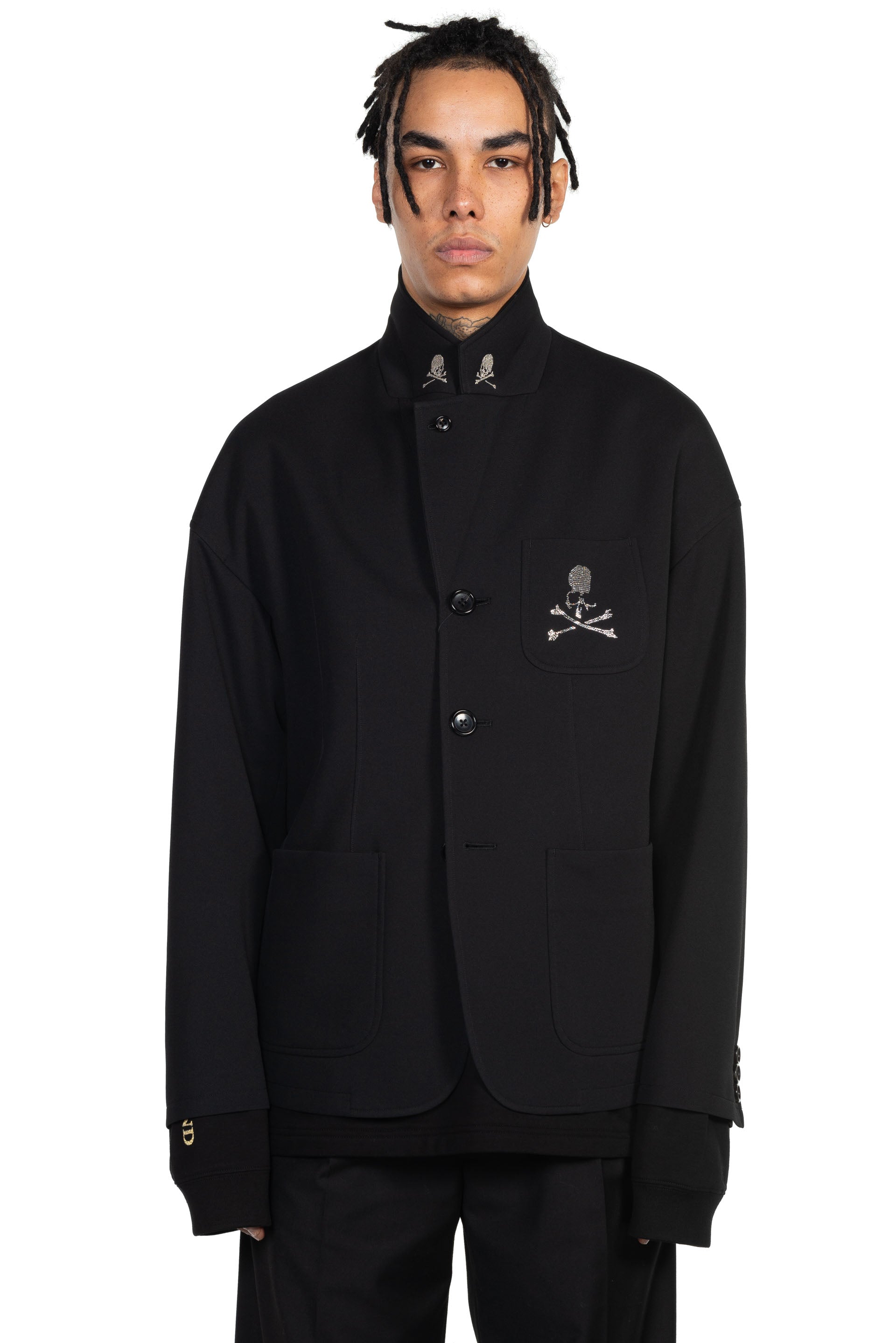 mastermind JAPAN Swarovski Logo Blazer. Swarovski diamond at chest. logo embroidery skulls at collar. button closure at front. Pocket at front. Relaxed fit.