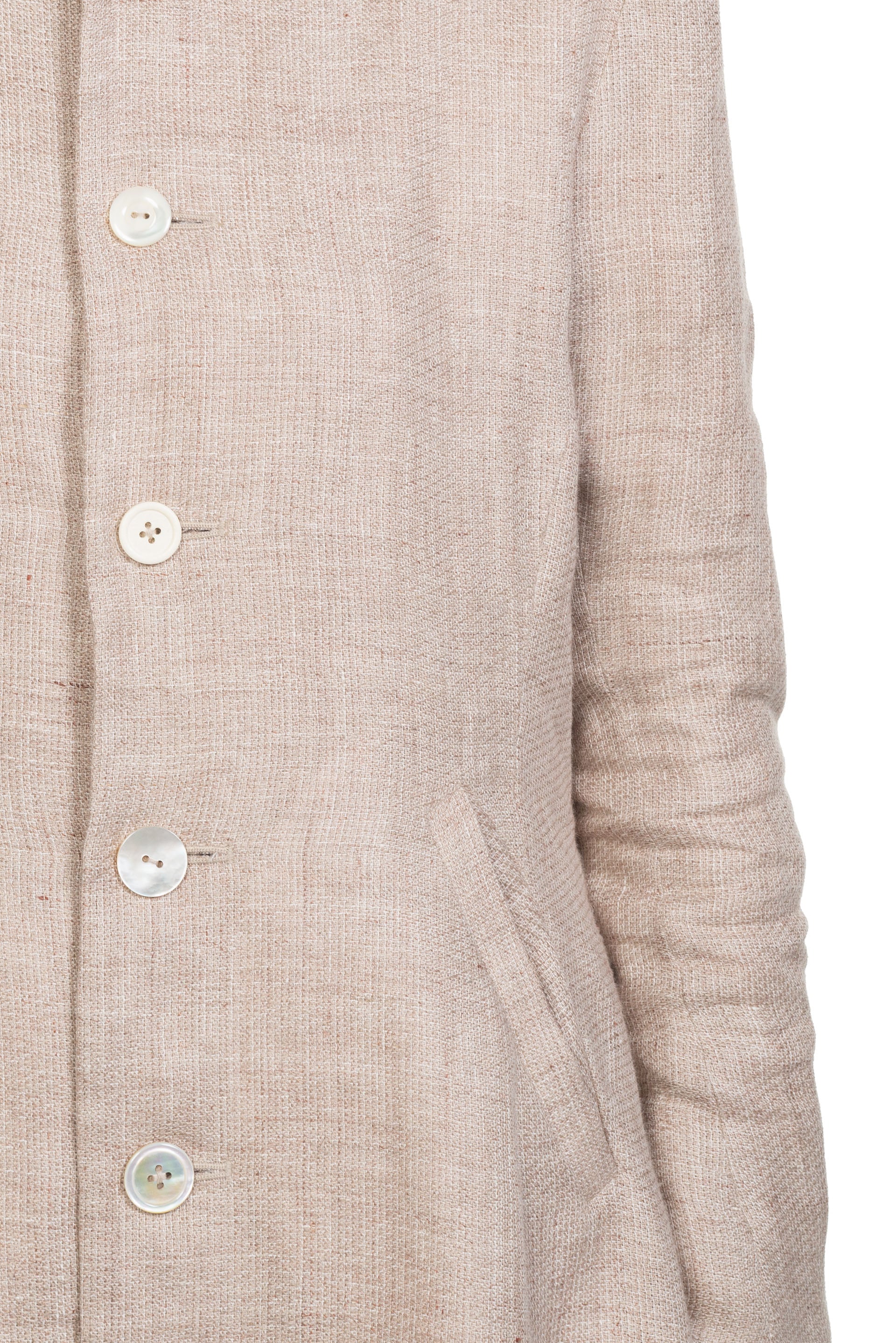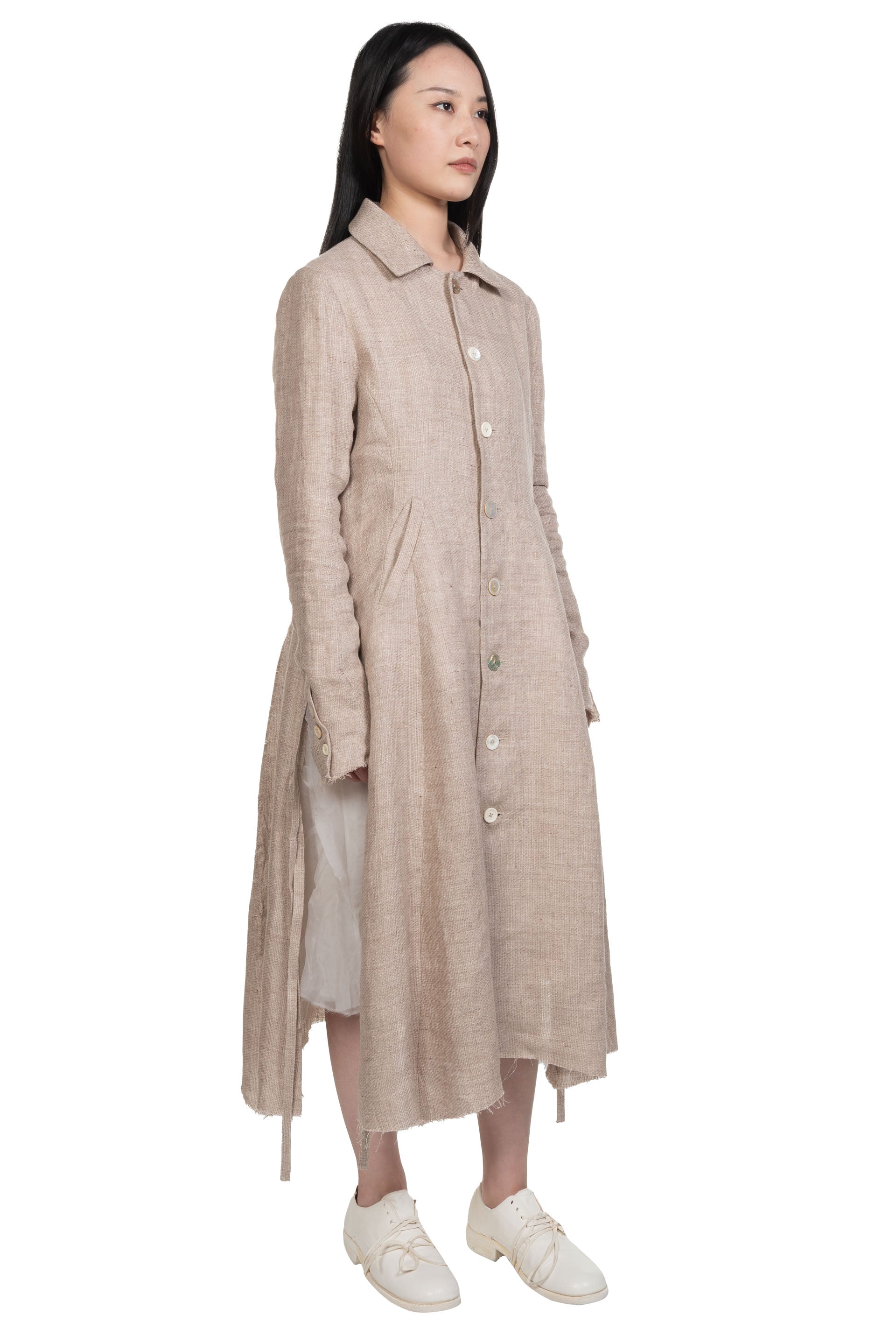 Long sleeves. Button closure at front. Button at cuffs. Spread collar. Two side pockets. Layering details. Pleated details at front and back. Floral details inside.