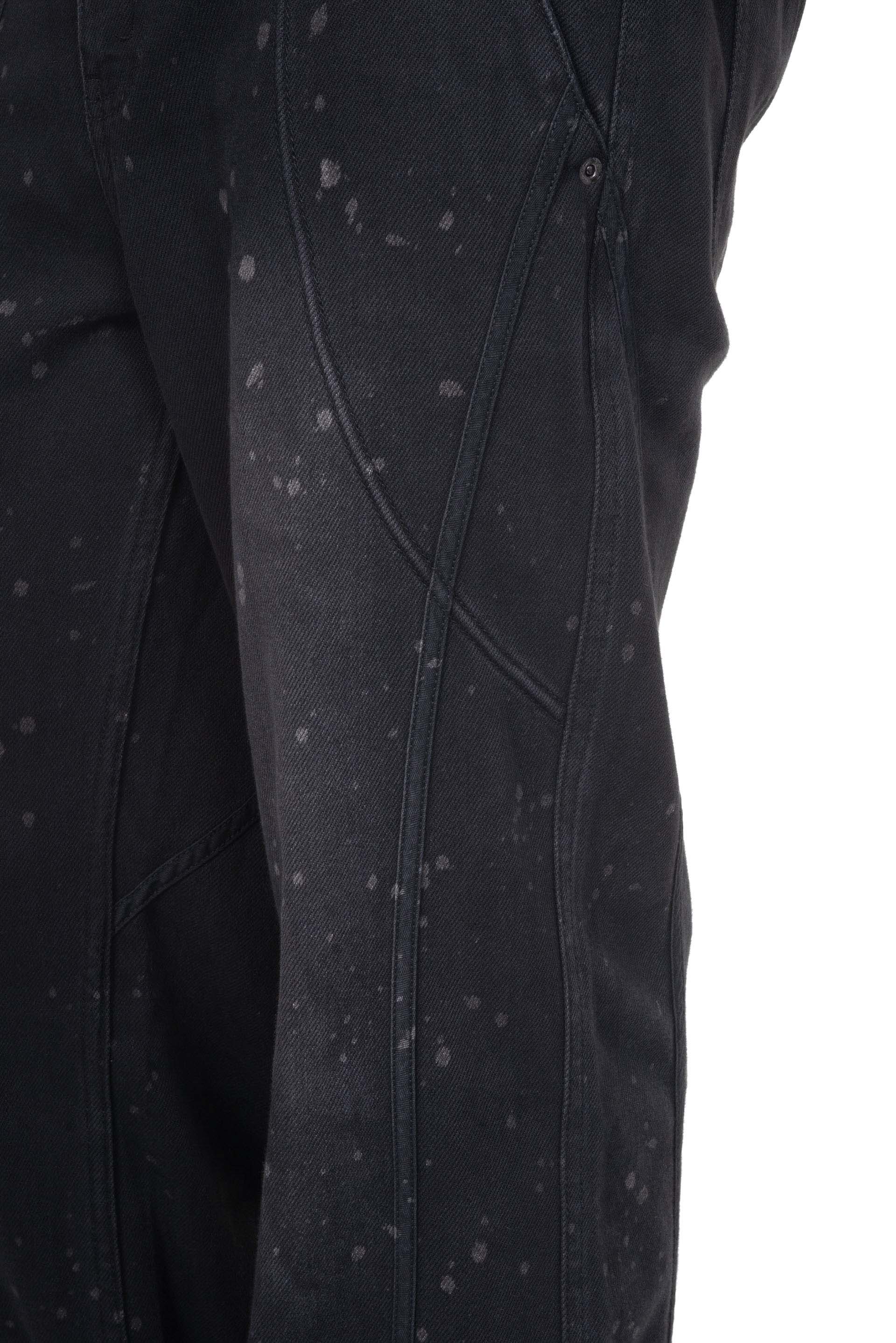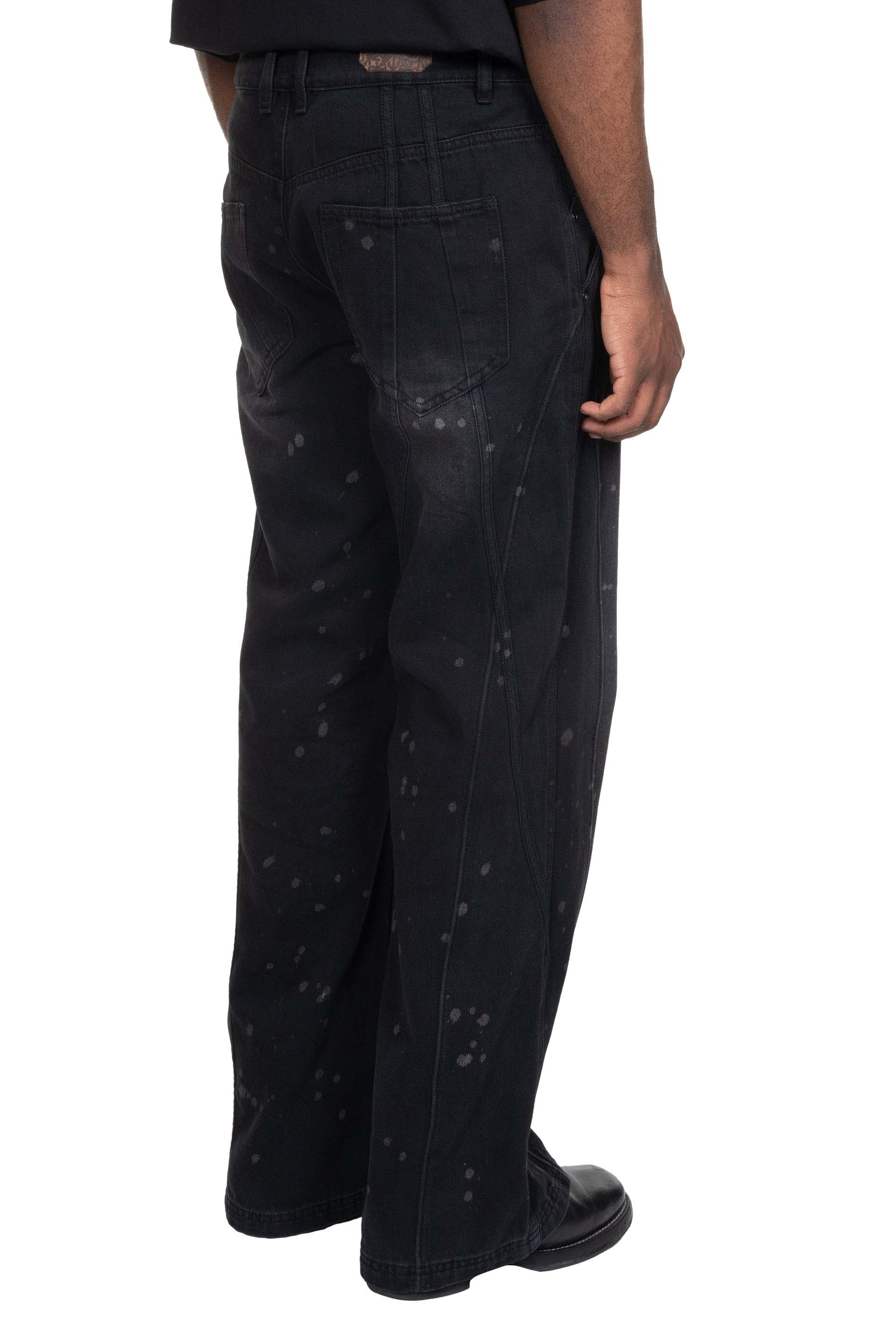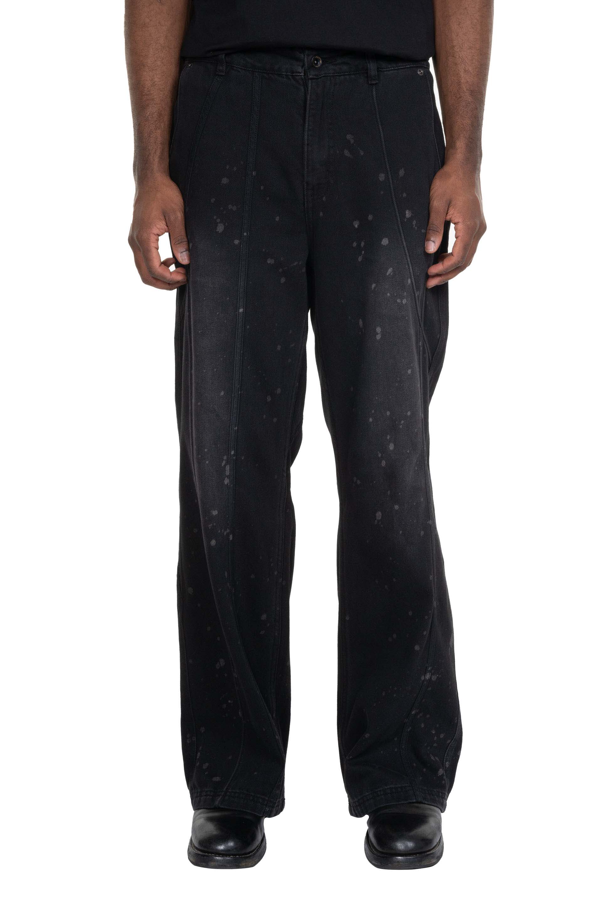 Professor e tainted denim. Straight long fit. Splatters throughout. Button closure at waist. Two side pockets. Two back pockets. Signature detailing at back.