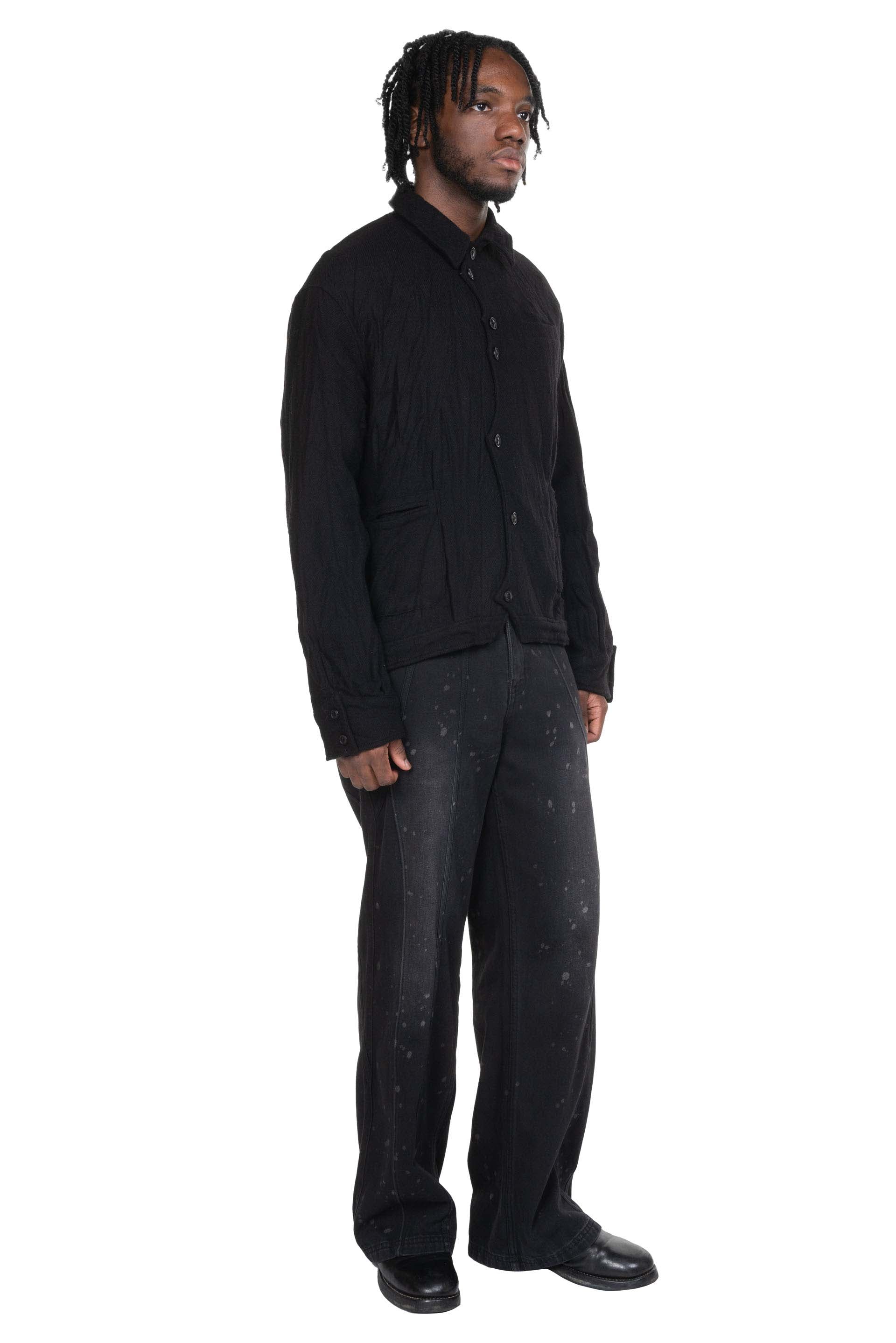 Professor. E understands the time of aesthetics from the use of cotton, hemp and wool. Fabric stitching, patching, designs without edge trimming, deconstruction, and reproduction are all Professor. E's signature elements creating classic immortal designs that can be viewed with the Tainted Denim Black.