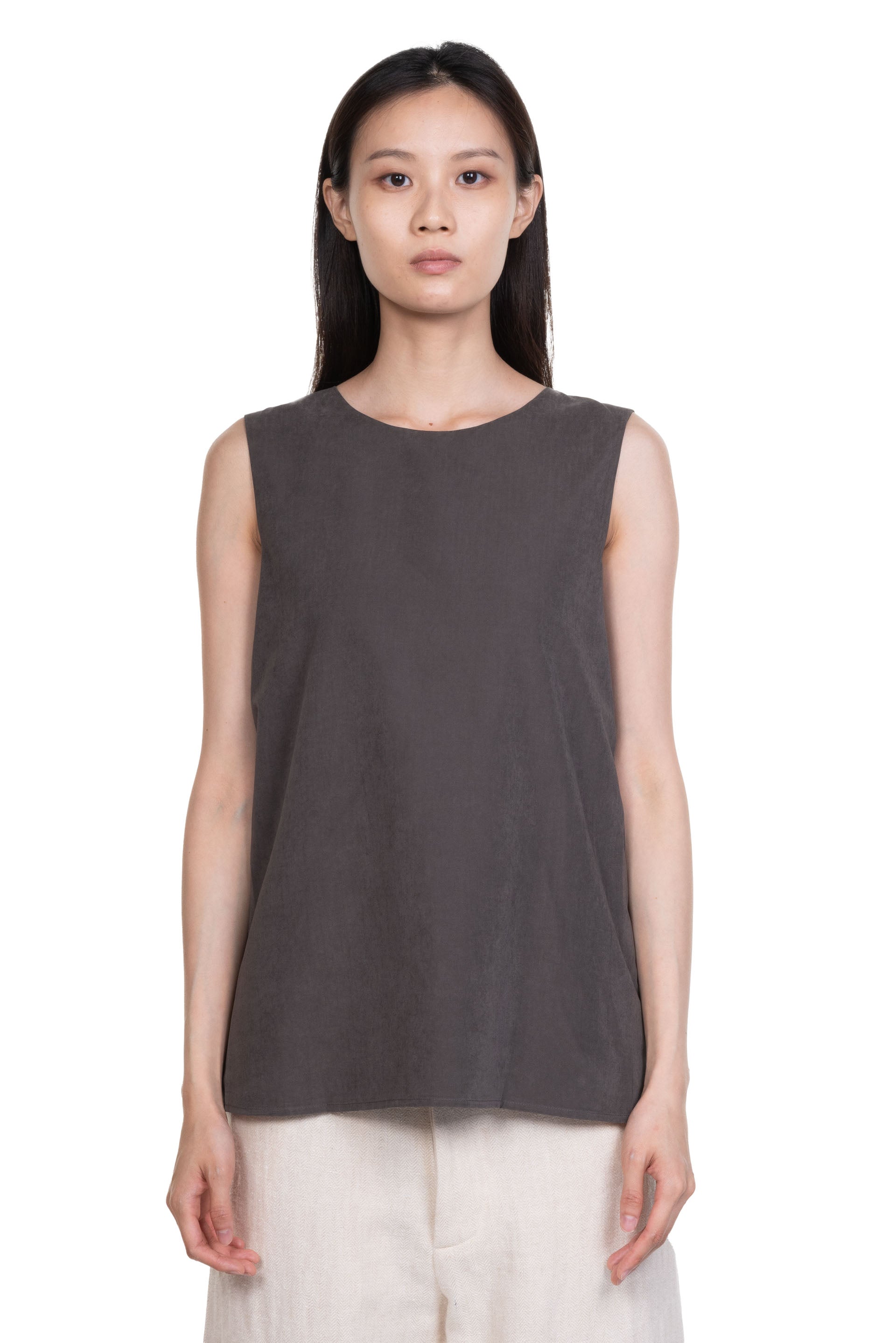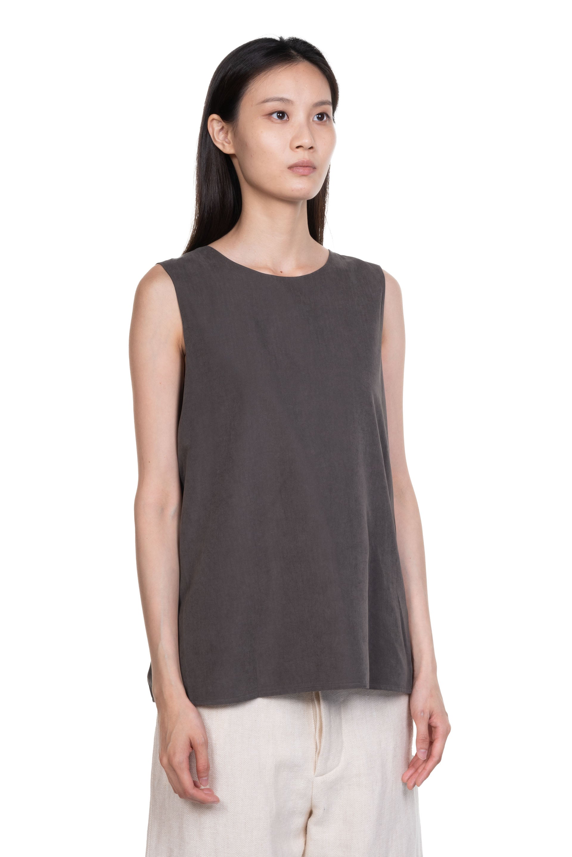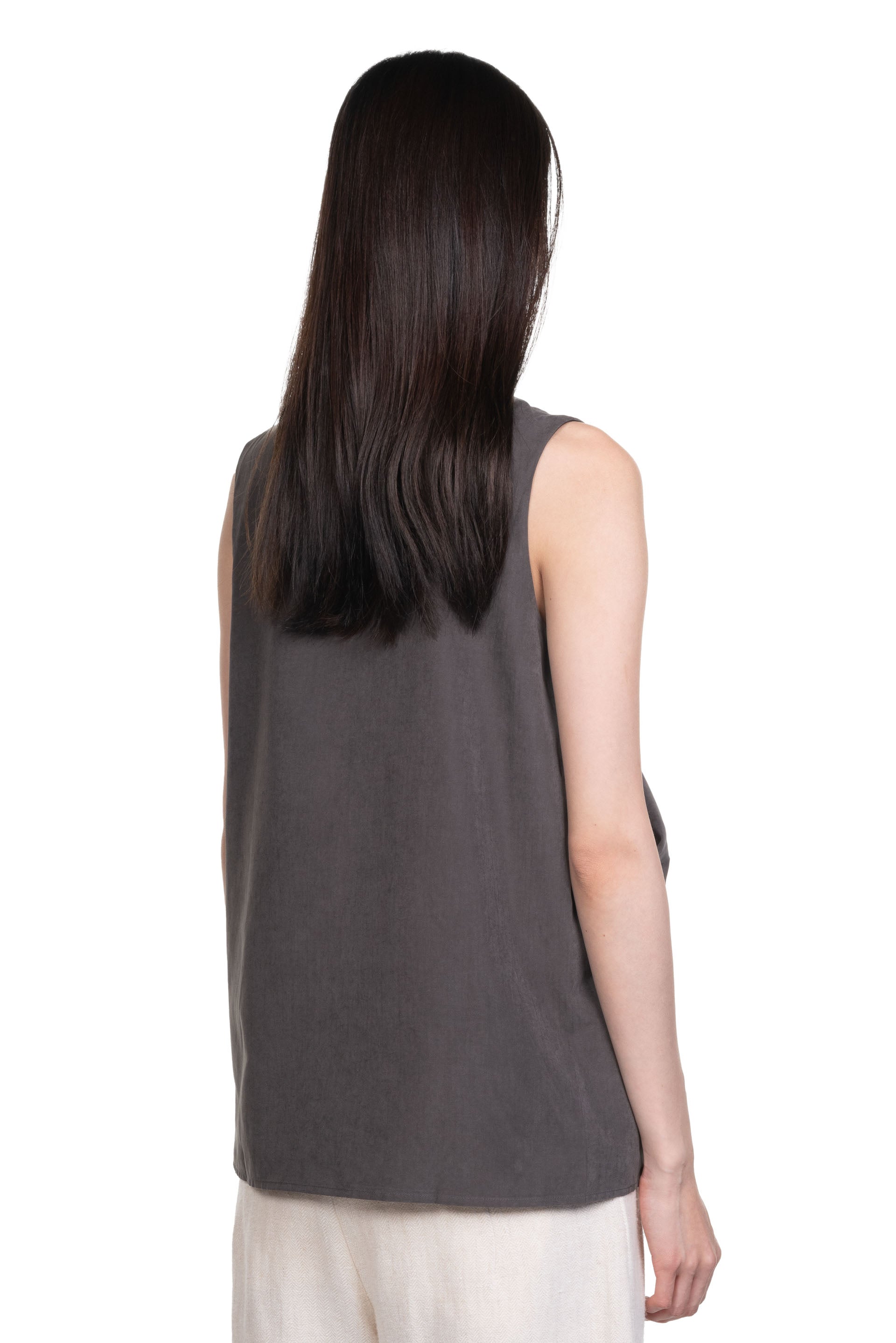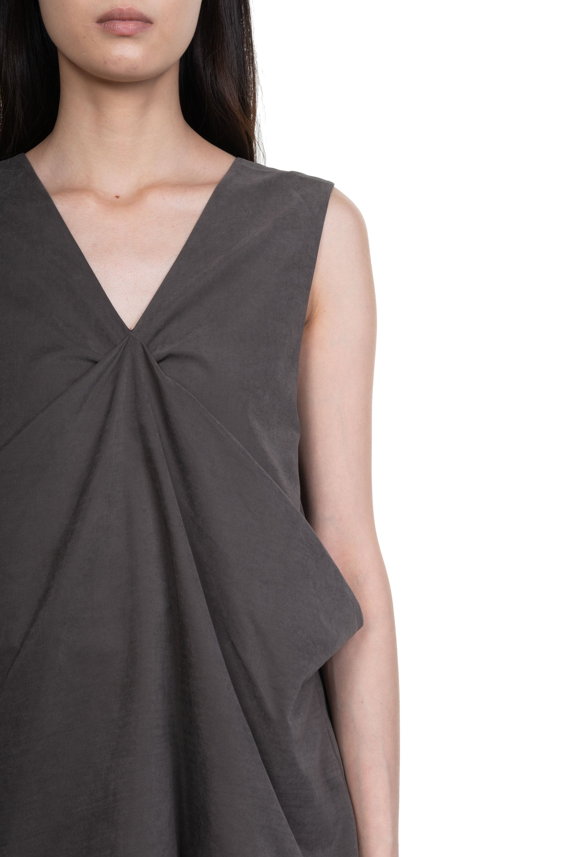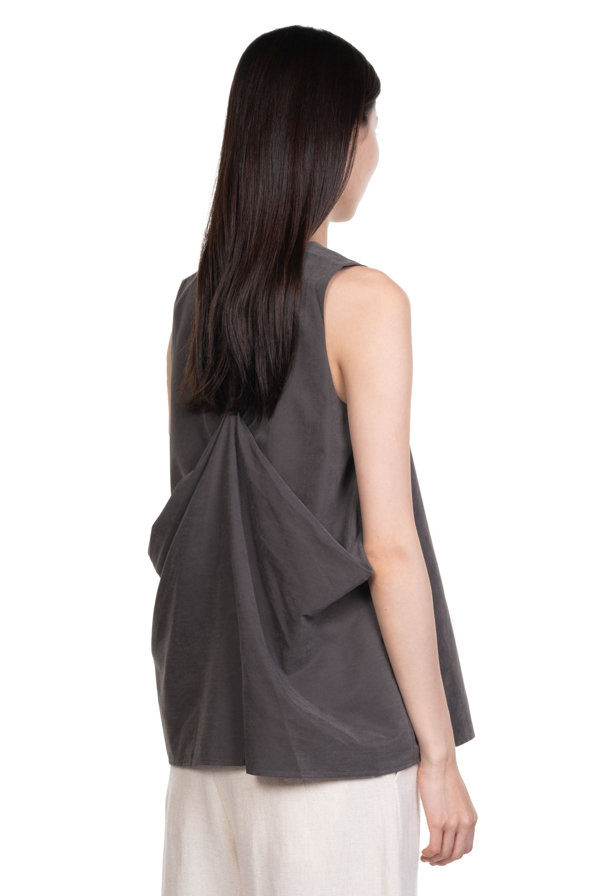 ii sense draped top in taupe. Sleeveless. Reversible. V neck. Pleated at front or back depending on the way you wear it.