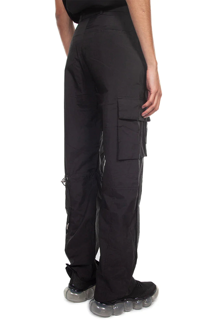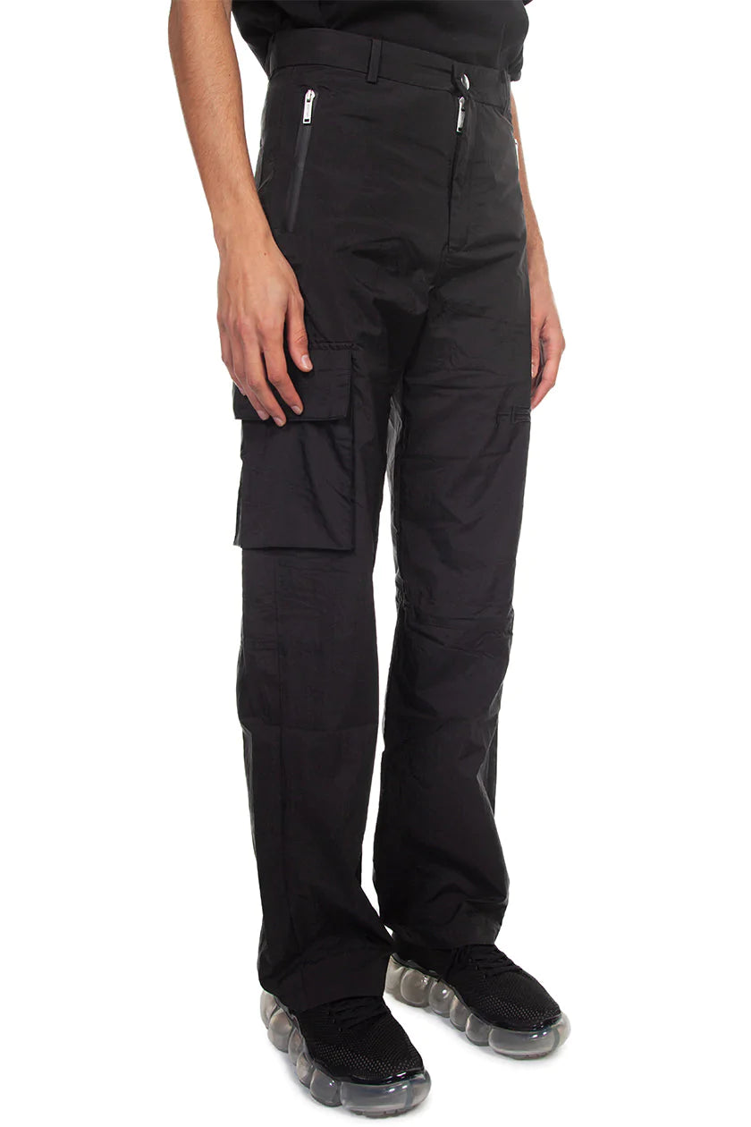 Custom hardware trimmings. Light technical material. Straight fit. Drawstring detail on back left leg. Structured pocket on right leg. Rubberised logo on front left leg. Zipper pockets on front. Pocket on leg.