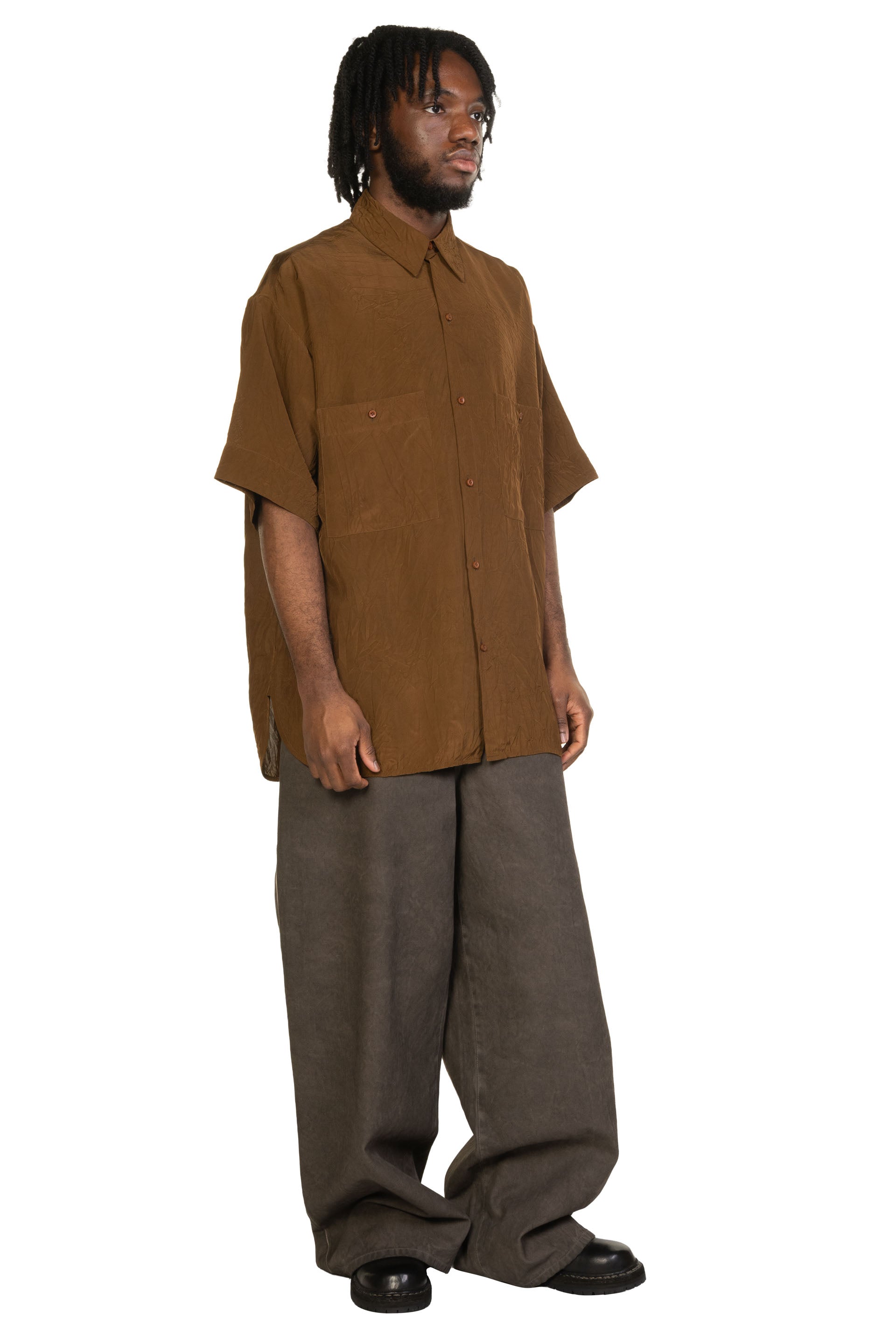 The Teorya Top balances simplicity with texture, featuring a relaxed silhouette and considered detailing. Designed for everyday wear, it reflects Uma Wang’s understated approach to modern menswear. Short sleeves. Button closure at front. oversized fit. Soft and creased viscose fabric. Pocket at front with button closure..