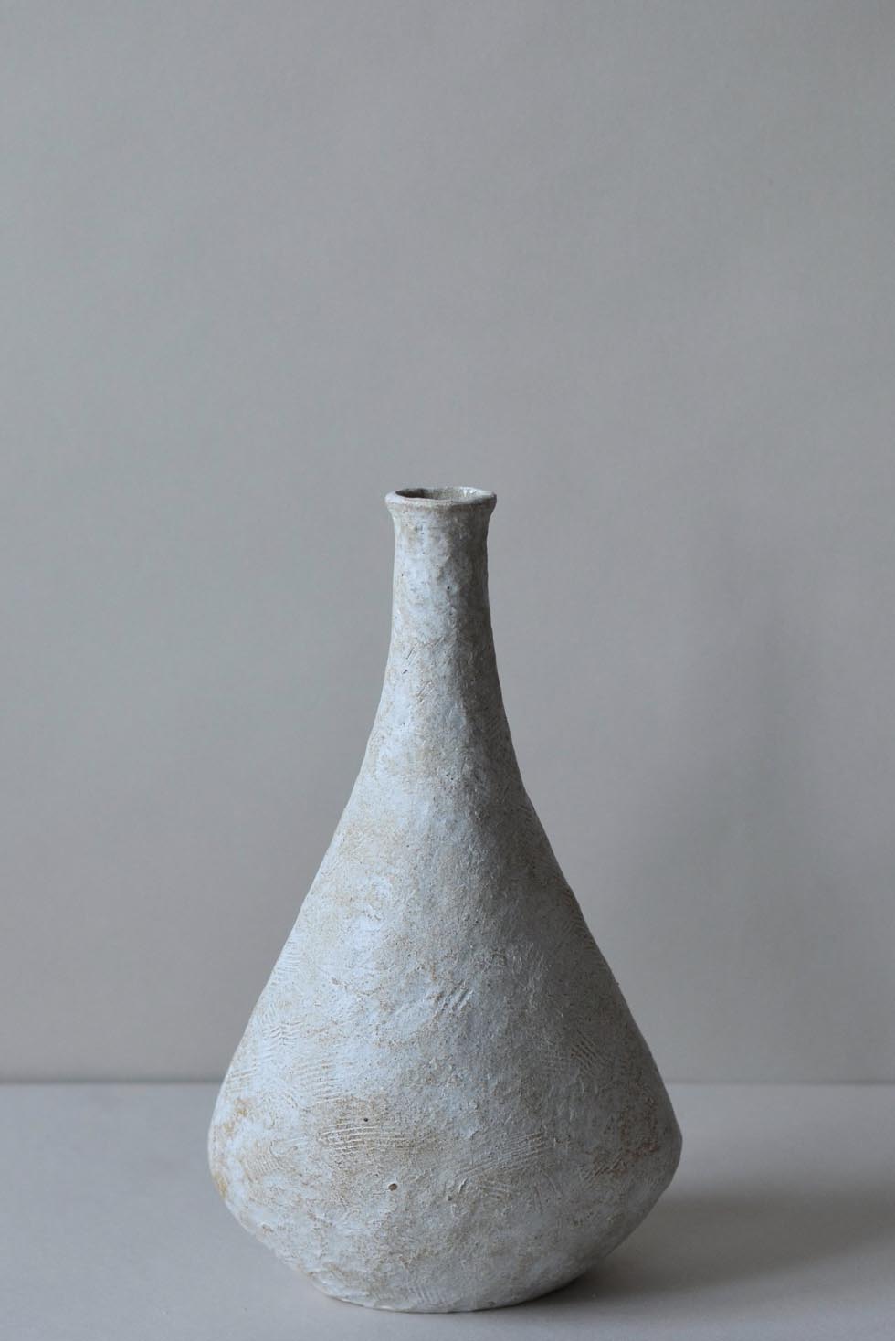 Details: coil built vessel made from buff stoneware clay with ash grit. White underglaze painted on the surface is lightly sponged off to reveal the textured surface beneath. Transparent glaze applied internally.