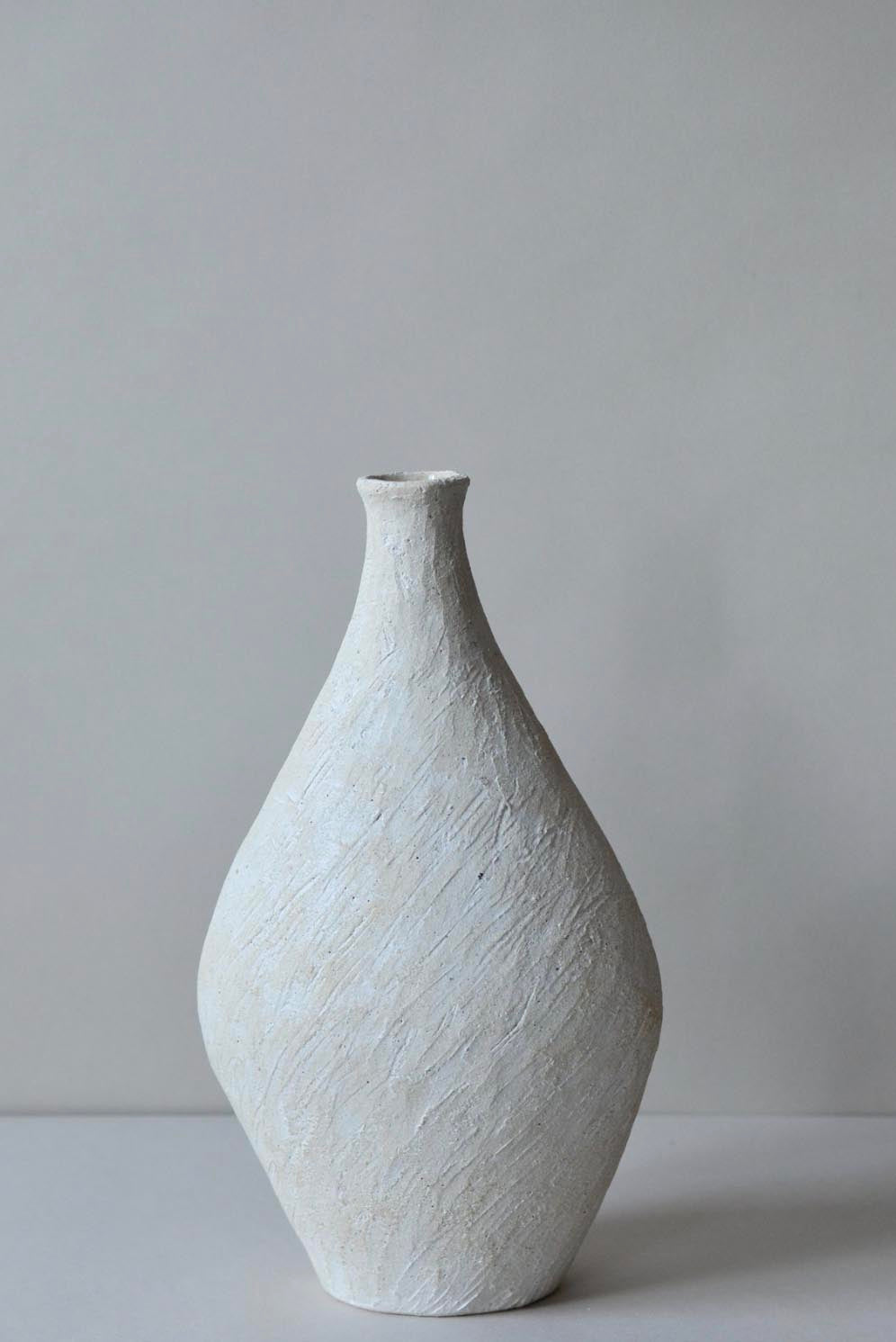 Viv Lee Terra Vessel (#6) in Cream. Details: coil built vessel made from buff stoneware clay with ash grit. White underglaze painted on the surface is lightly sponged off to reveal the textured surface beneath. Transparent glaze applied internally.